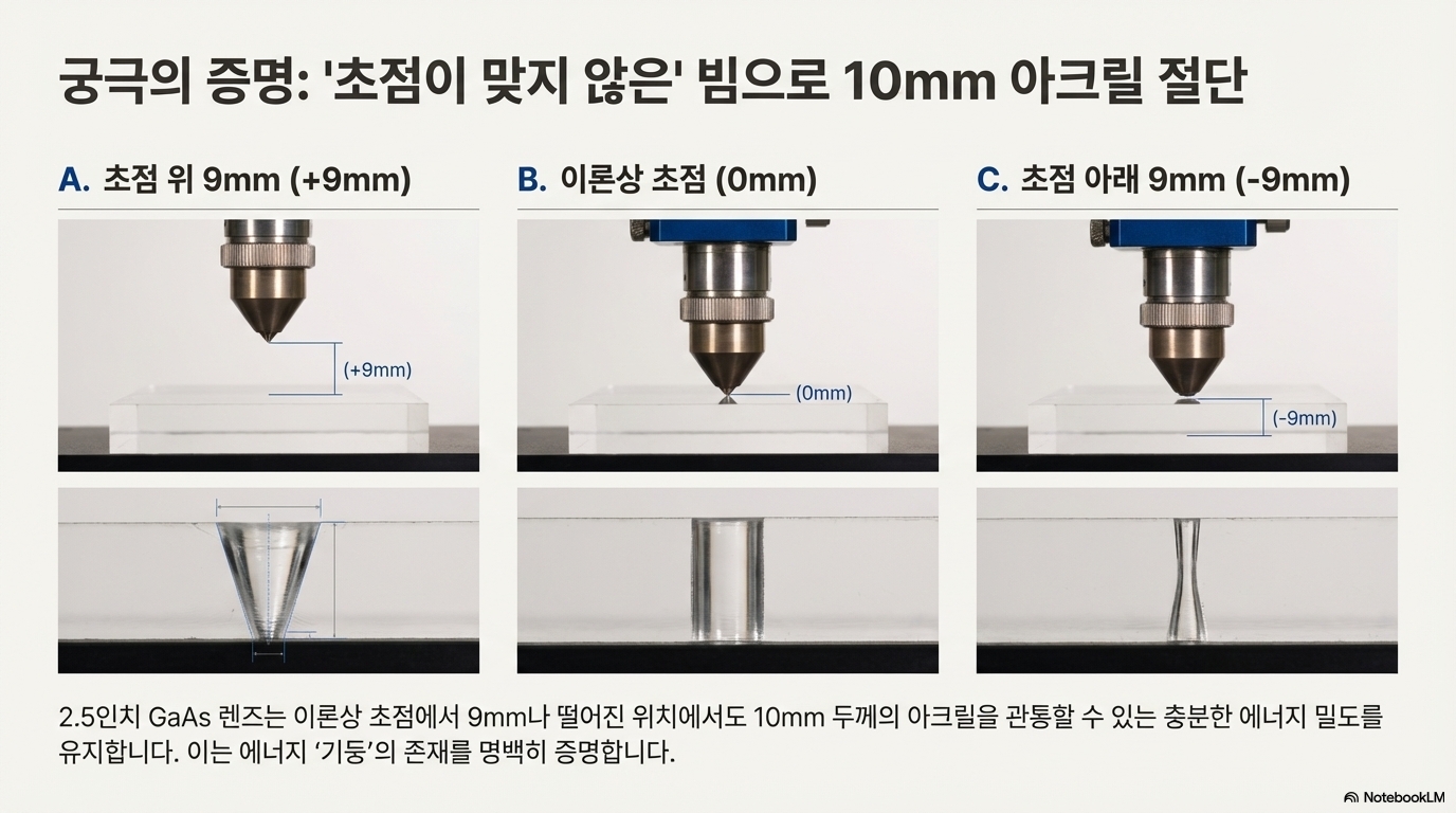 실험을 위해 10mm 아크릴에 세 개의 구멍을 뚫었습니다. 첫 번째는 정확한 초점 위치에서, 두 번째는 초점보다 9mm 아래에서, 세 번째는 초점보다 9mm 위에서 뚫었습니다. 결과는 명확했습니다. 초점 위치에서 뚫은 구멍은 완벽하게 평행했지만, 초점에서 벗어난 위치에서 뚫은 구멍들은 모두 테이퍼(tapered) 형태를 보였습니다. 예를 들어, 초점에서 9mm 벗어난 구멍은 입구가 약 0.9mm로 시작해 아래로 갈수록 점점 좁아졌습니다.