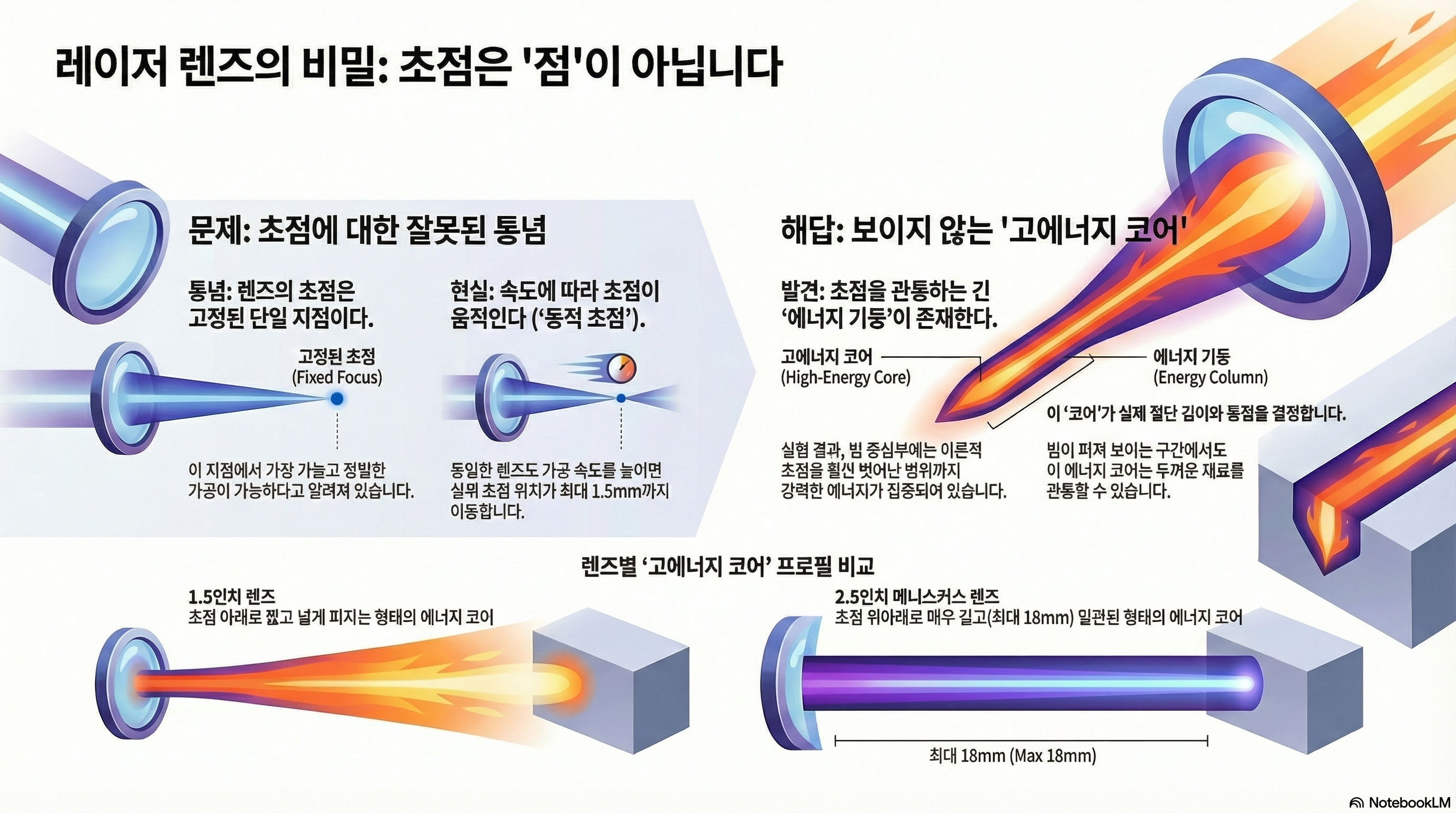 우리가 살펴본 것처럼, 레이저의 초점은 단순한 고정점이 아닙니다. 그것은 속도에 따라 변하는 역동적인 현상이며, 그 중심에는 이론적인 초점 영역을 훨씬 넘어서까지 강력한 에너지를 전달하는 '코어'가 숨어 있습니다. 그리고 바로 이 에너지 코어가 두꺼운 소재를 평행하게 절단하는 것과 같은 실제 가공 현상을 설명하는 열쇠입니다.