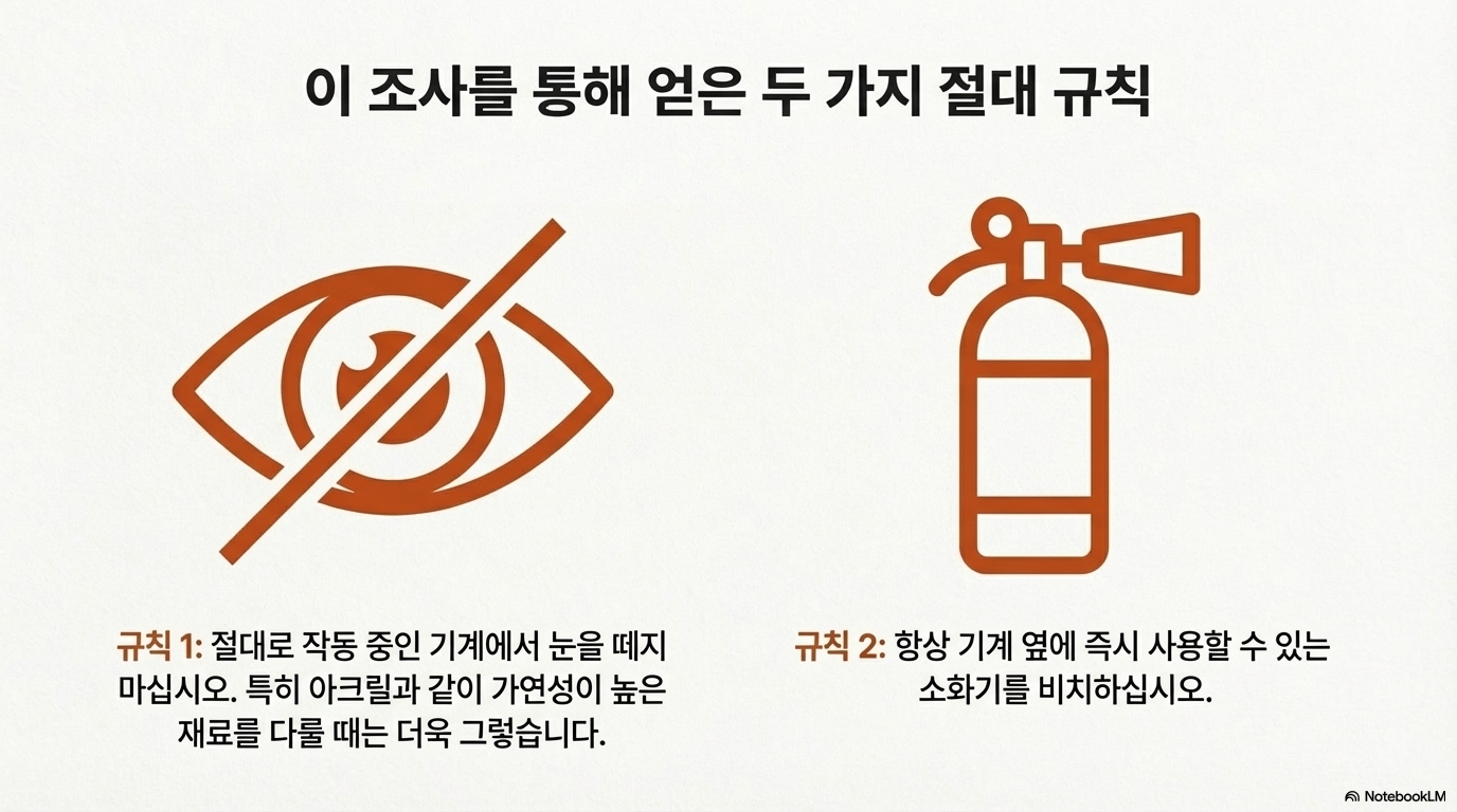 이 글을 마무리하며, 모든 레이저 커터 사용자에게 가장 중요한 두 가지 안전 수칙을 다시 한번 강조합니다.
