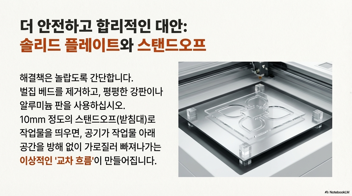 그렇다면 벌집 베드의 대안은 무엇일까요? 놀랍게도 해결책은 매우 간단합니다. 바로 기계 바닥에 단단한 금속판을 깔고, 그 위에 작은 블록(예: 10mm 두께의 아크릴 블록)을 놓아 작업물을 띄우는 것입니다.