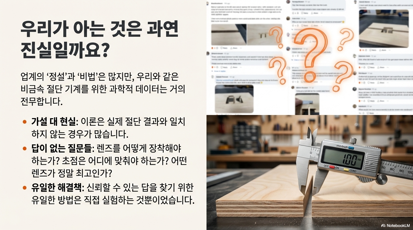 레이저 커터를 사용하는 분들이라면 온라인 포럼이나 커뮤니티에서 공유되는 수많은 '경험 법칙'과 '공통된 지식'에 익숙하실 겁니다. 어떤 렌즈를 써야 하는지, 어떤 설정이 최적인지에 대한 조언은 넘쳐나죠. 우리 대부분은 이러한 지혜를 의심 없이 받아들이고 작업에 적용합니다.