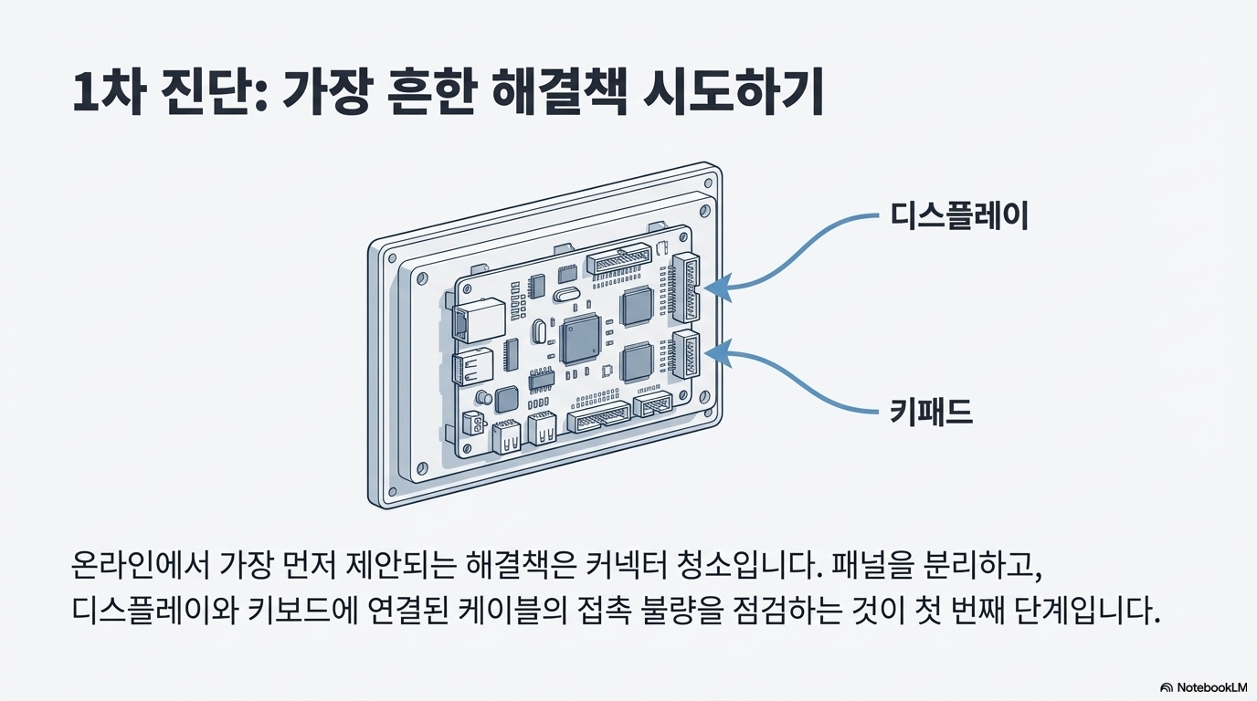 문제가 생겼을 때 가장 먼저 하는 일은 인터넷을 검색하는 것입니다. 많은 사람들이 디스플레이 패널의 플러그를 뽑아 깨끗하게 닦은 뒤 다시 연결하면 해결될 것이라고 조언했습니다. 저도 그 말을 믿고 시도해봤지만, 결과는 마찬가지였습니다. 혹시나 해서 키패드 필름에 연결되는 별도의 커넥터까지 확인하며 모든 간단한 해결책을 시도해봤지만, 화면은 여전히 먹통이었죠.