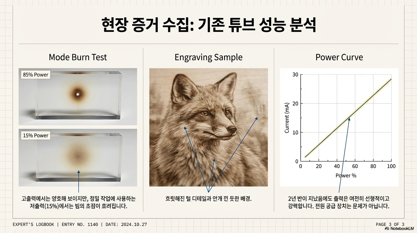 - 사례 1 (기존 튜브): 제 자신감마저 흔들리며 제가 미쳤다고 확신하게 만든 것은 바로 성능 측정 차트(calibration chart)였습니다. 놀랍게도, 제 기존 튜브의 성능 측정 차트는 2년 전보다 오히려 더 선형적이고 강력한 출력을 보여주었습니다. 수치상으로는 튜브가 더 좋아진 셈입니다. 하지만 아크릴 블록에 낮은 출력으로 빔을 쏘아 형태를 확인하는 '모드 번(mode burn)' 테스트를 해보니 진실이 드러났습니다. 빔의 초점이 흐트러져 날카로운 점을 만들어내지 못하고 퍼져버리는 문제가 명확히 보였습니다.