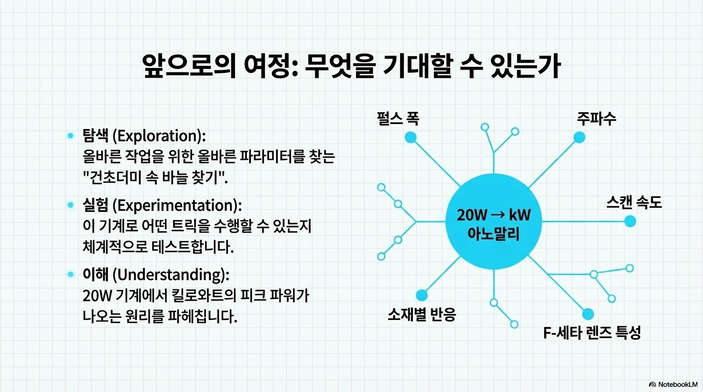 그리고 모든 기계적, 광학적 정렬이 끝난 후 노즐 끝에 마스킹 테이프를 붙여 마지막으로 펄스를 확인하는 최종 검증 단계에 이릅니다. 이 간단한 행위는 앞서 수행한 모든 복잡한 정렬 과정이 성공적으로 완료되었음을 증명하는 궁극적인 확인 사살과도 같습니다. 이 마지막 한 방이 정확히 중앙에 찍혔을 때, 비로소 모든 작업이 완벽하게 끝났다는 확신을 얻게 됩니다.