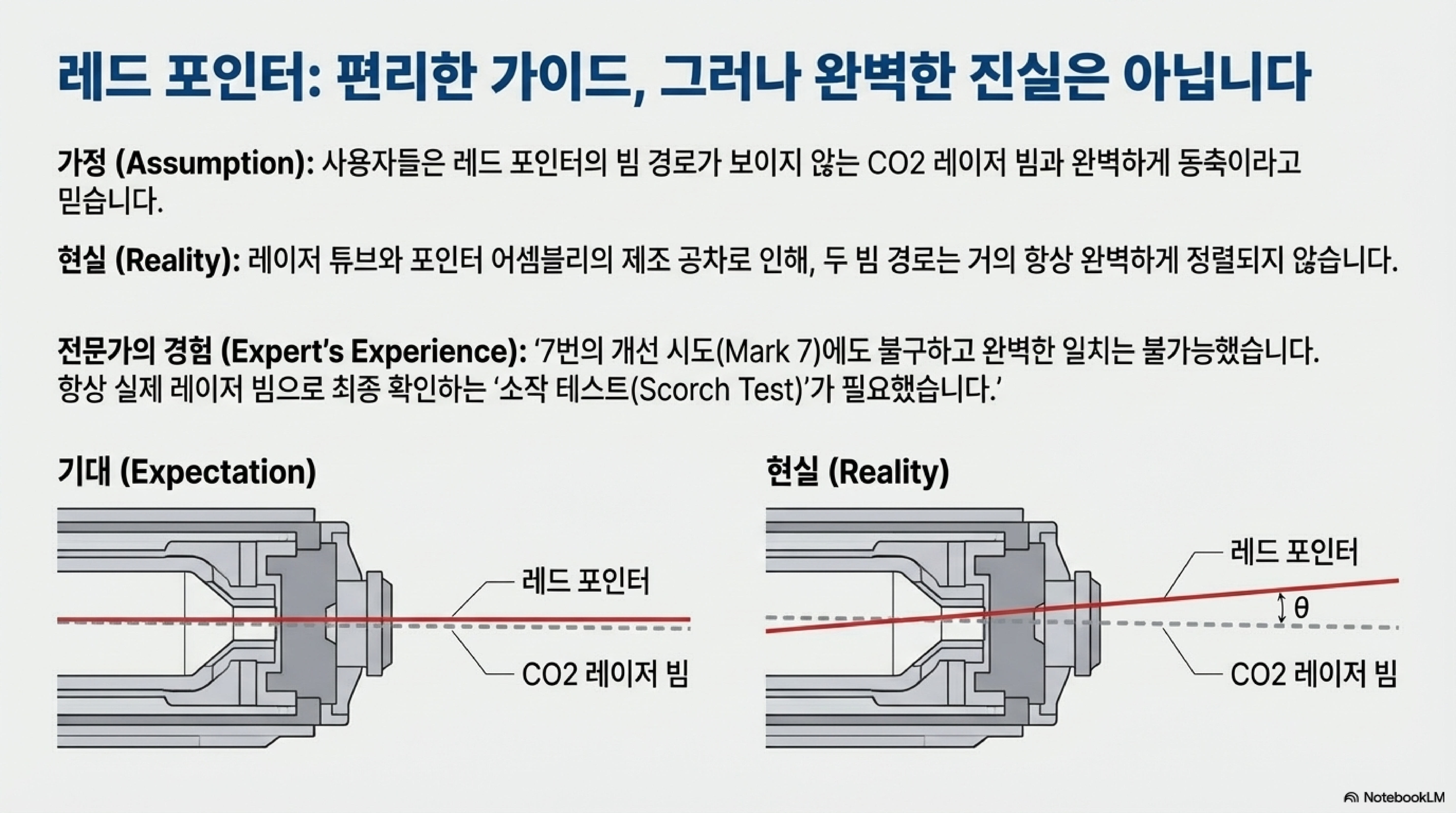 레드닷 포인터는 대략적인 위치를 잡는 데는 유용하지만, 최종 정밀 조정에는 신뢰할 수 없습니다. 유일한 진실의 기준은 언제나 실제 레이저 빔 그 자체, 즉 그을림 테스트의 결과입니다.