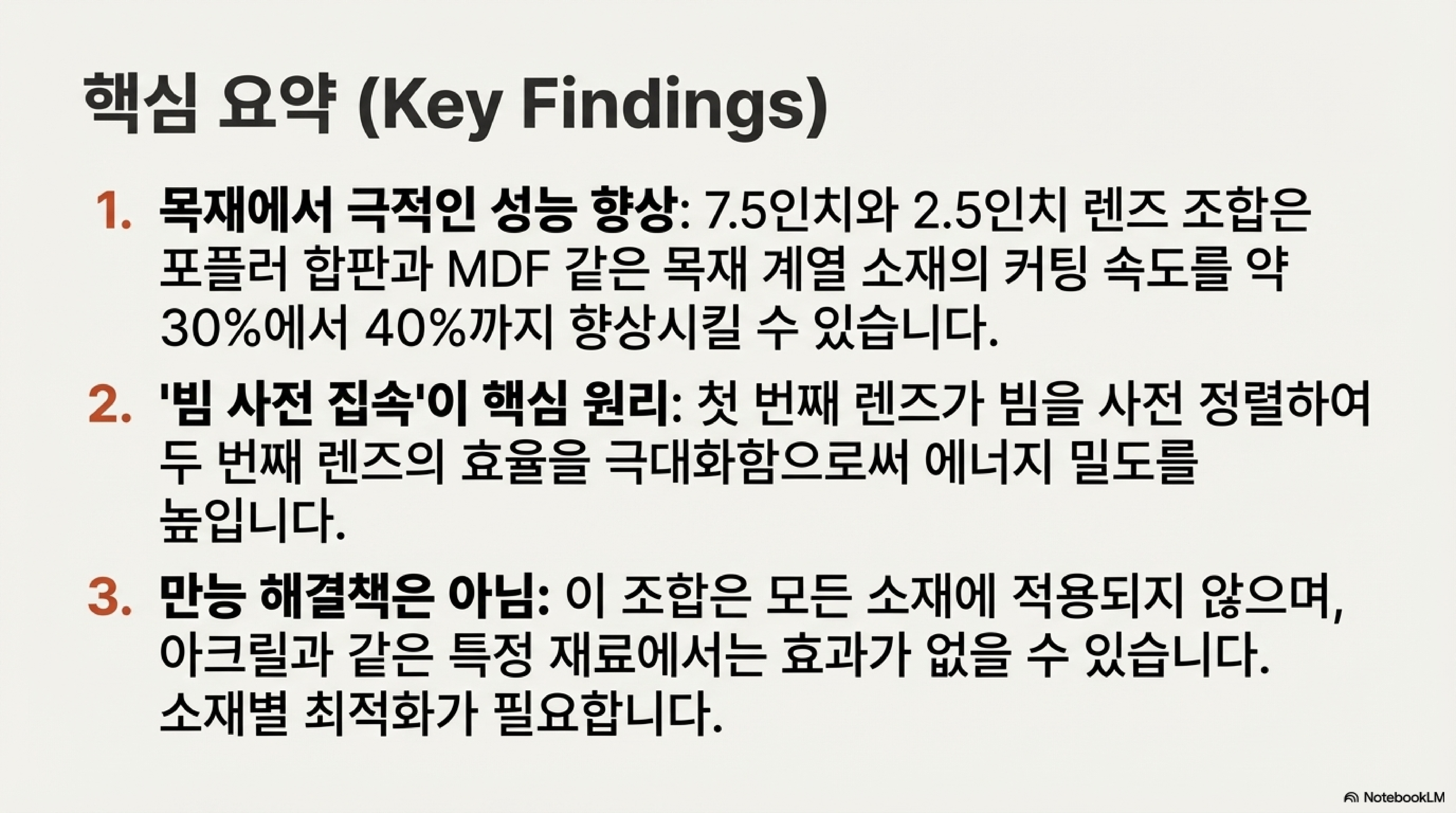 이번 실험을 통해 7.5인치와 2.5인치 렌즈 조합이 합판이나 MDF와 같은 특정 소재에서는 절단 속도를 30% 이상 극적으로 향상시킬 수 있다는 사실을 확인했습니다. 하지만 아크릴처럼 전혀 효과가 없는 경우도 있었습니다. 이는 고도로 집중된 에너지 빔이 목재의 섬유 구조를 효율적으로 절단하는 데는 효과적이지만, 아크릴과 같이 균일한 재료에는 큰 이점을 주지 못할 수 있음을 시사합니다. 결국 특정 렌즈 조합이 만능이 아니며, 최적의 결과를 얻기 위해서는 소재별 테스트가 필수적이라는 점을 보여줍니다.