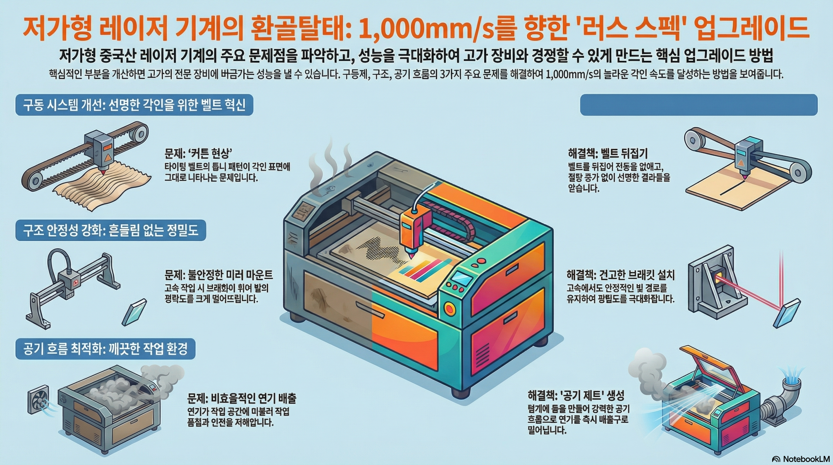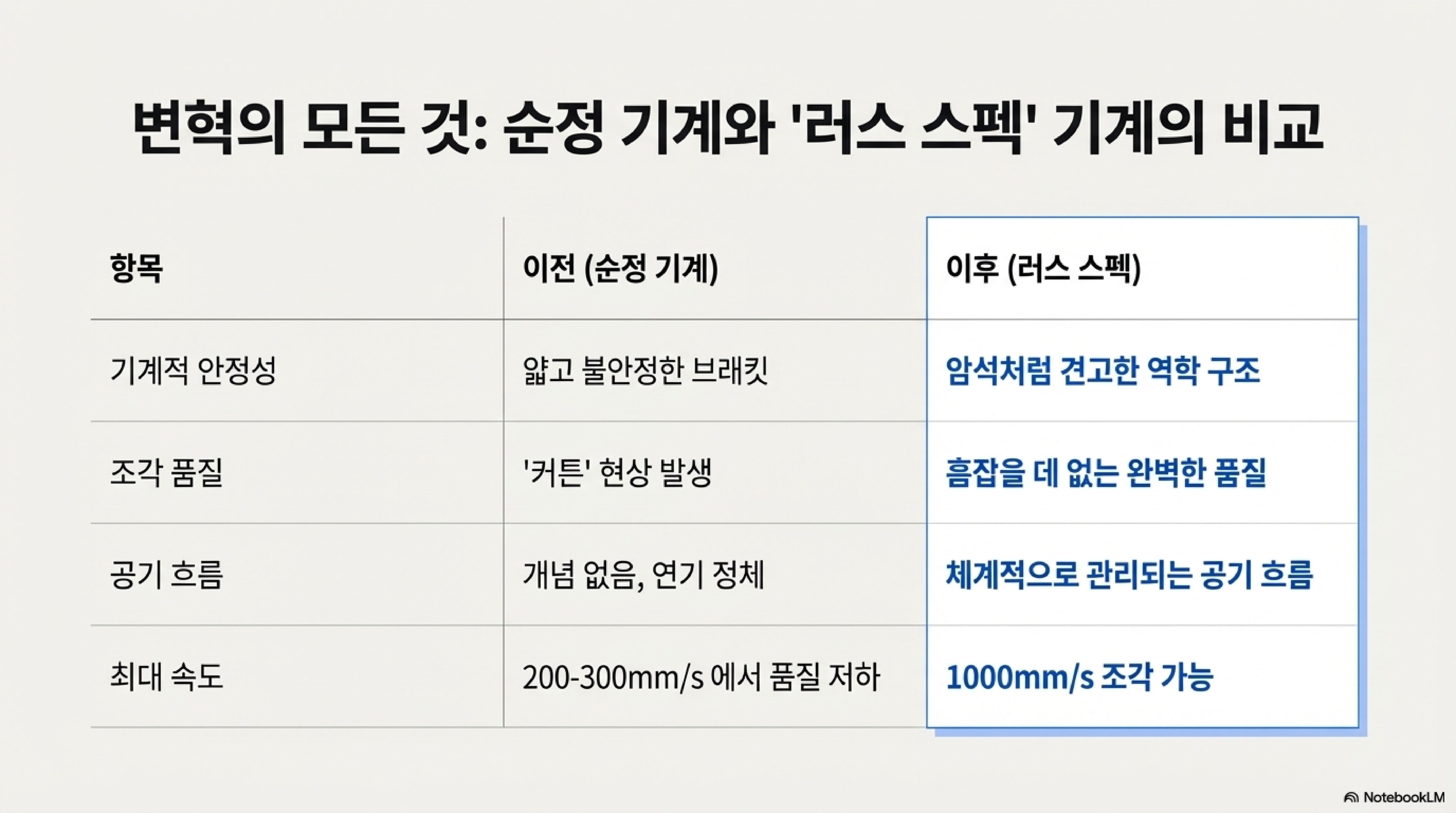 이 세 가지 핵심 원칙 외에도, 완전한 '러스 스펙'은 유연성을 위한 C-시리즈 렌즈 튜브로의 교체, 빔 반사를 줄이기 위한 두꺼운 냉연강판 베드 설치, 그리고 안정적인 25mm 미러 시스템으로의 업그레이드를 포함하여 하나의 최적화된 시스템을 완성합니다.