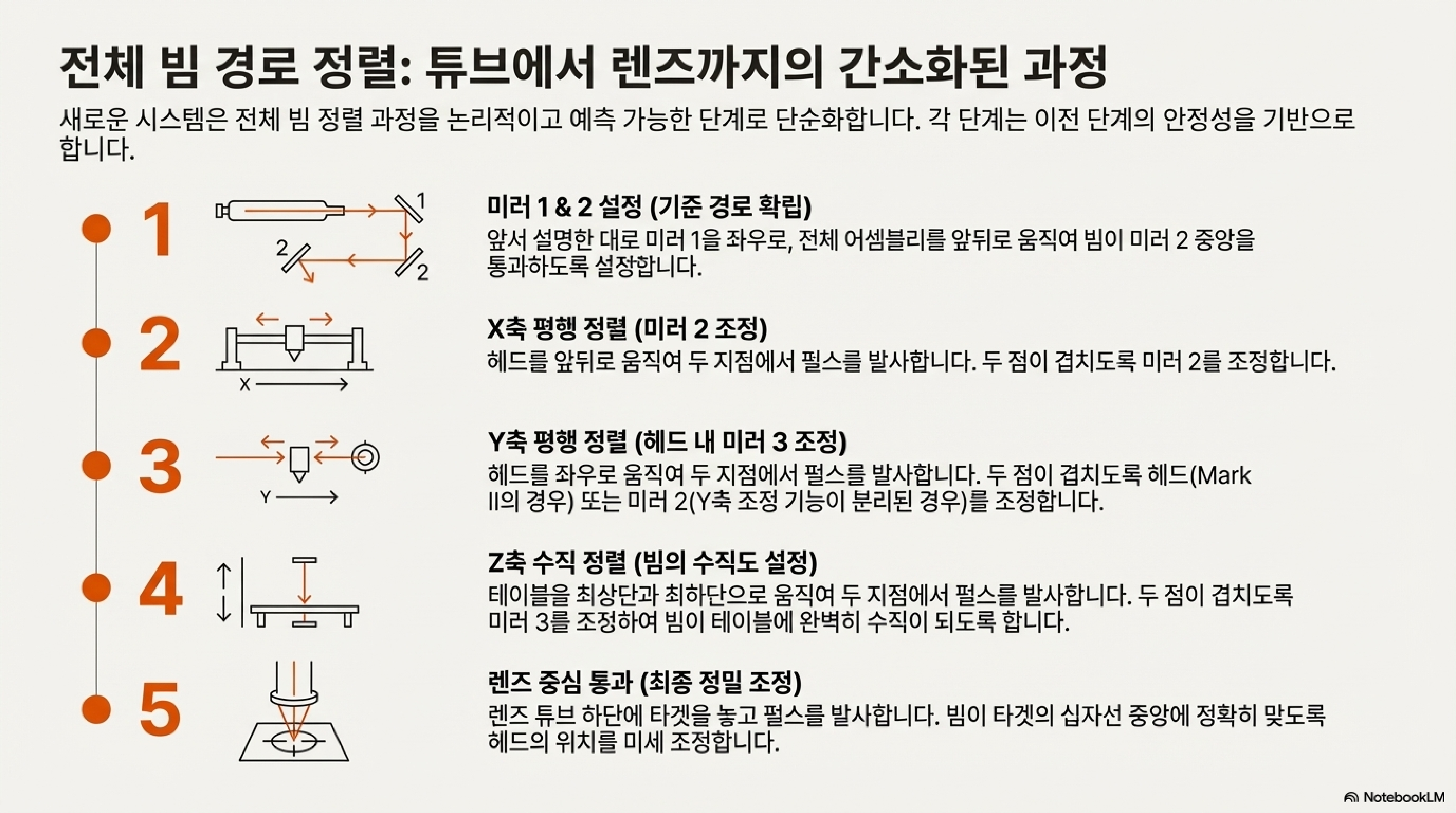 이 방식이 혁신적인 이유는 빔 경로의 핵심 축을 단 하나의 움직임으로 제어하기 때문입니다. 복잡한 다축 조정의 필요성을 제거하고, 빔 정렬을 훨씬 직관적이고 간단한 작업으로 바꾸어 놓습니다. 결국 3번 항목의 '견고함'과 4번 항목의 '단일 축 조정'은 '오류가 발생할 변수를 원천적으로 제거한다'는 동일한 엔지니어링 철학에서 비롯된 것입니다.