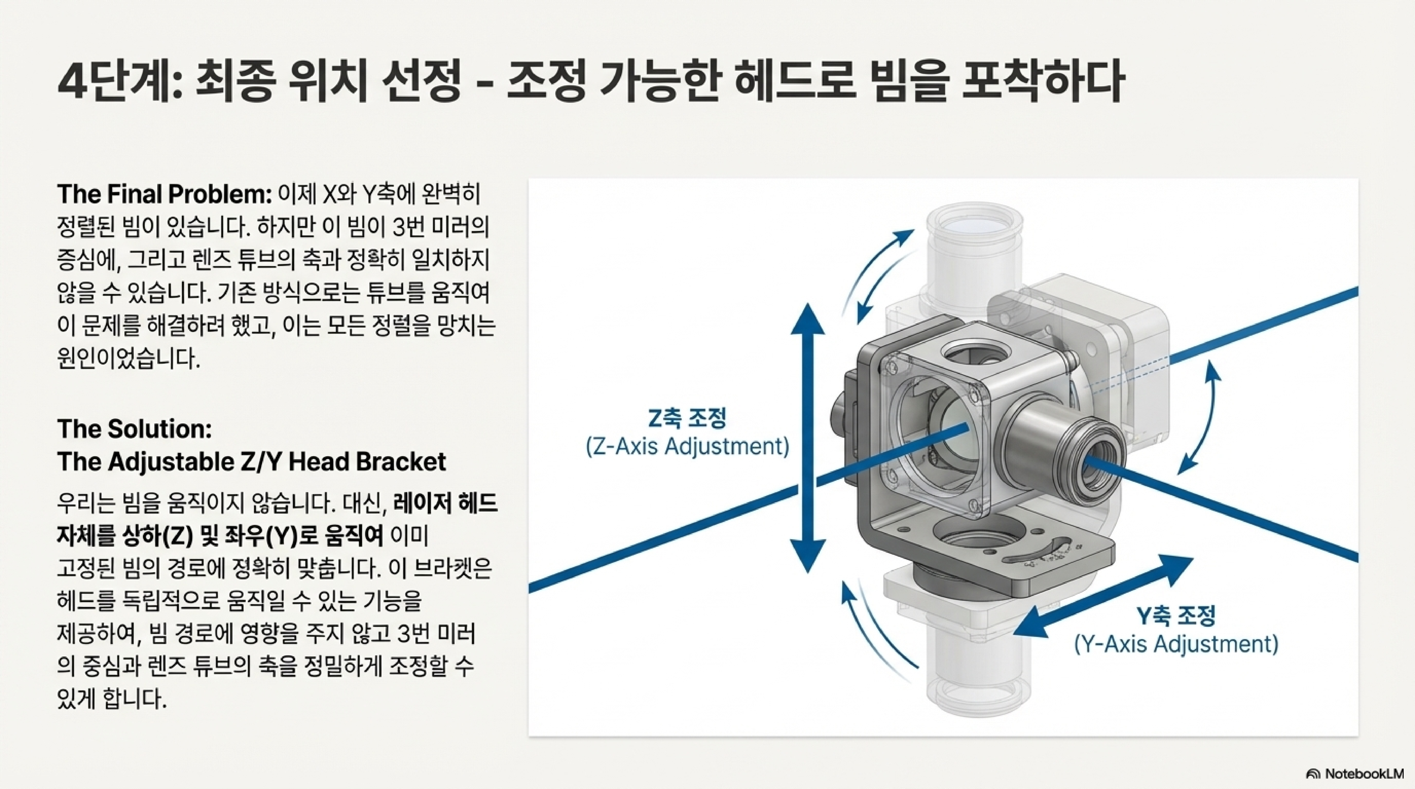 이 통찰은 단순한 아이디어가 아니라, 수년에 걸친 물리적인 엔지니어링과 개선의 결과물입니다. 전통적인 방식은 이미 X축과 Y축에 완벽히 정렬된 빔의 경로를 거울로 비틀어 레이저 헤드 중앙에 억지로 맞추려 합니다. 이는 전체 시스템의 기준을 망가뜨리는 최악의 접근법입니다. 그는 정반대의 전략을 택했습니다. 이미 정렬된 빔의 경로는 신성불가침의 기준으로 삼고, 대신 레이저 헤드가 장착된 브래킷 자체를 조정 가능하게 만들어 빔의 경로를 '잡도록' 만든 것입니다. 그는 "절대 뒤로 돌아가지 말고, 항상 앞으로 나아가라(never go backwards, always go forwards)"는 원칙으로 이를 요약합니다.