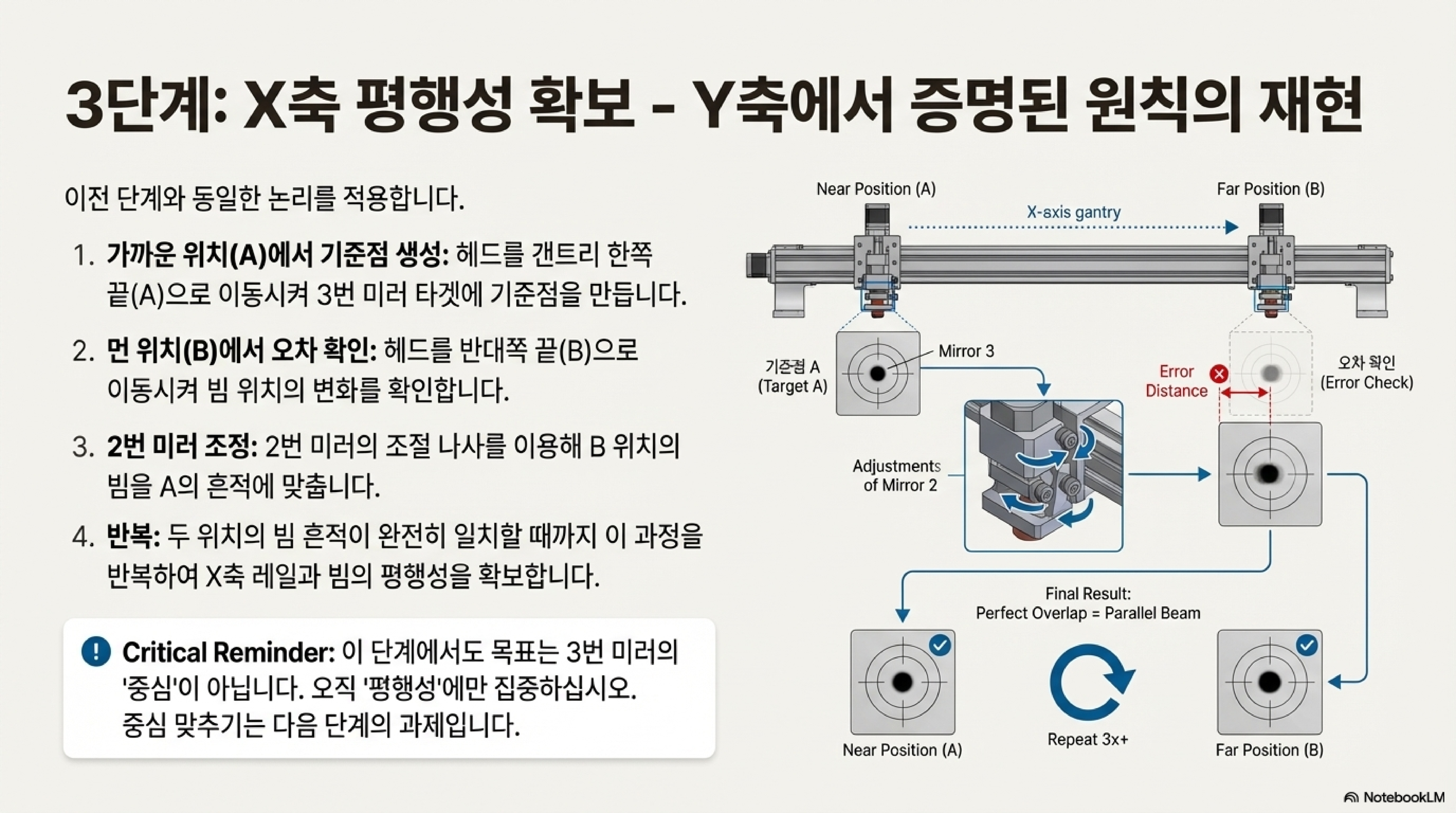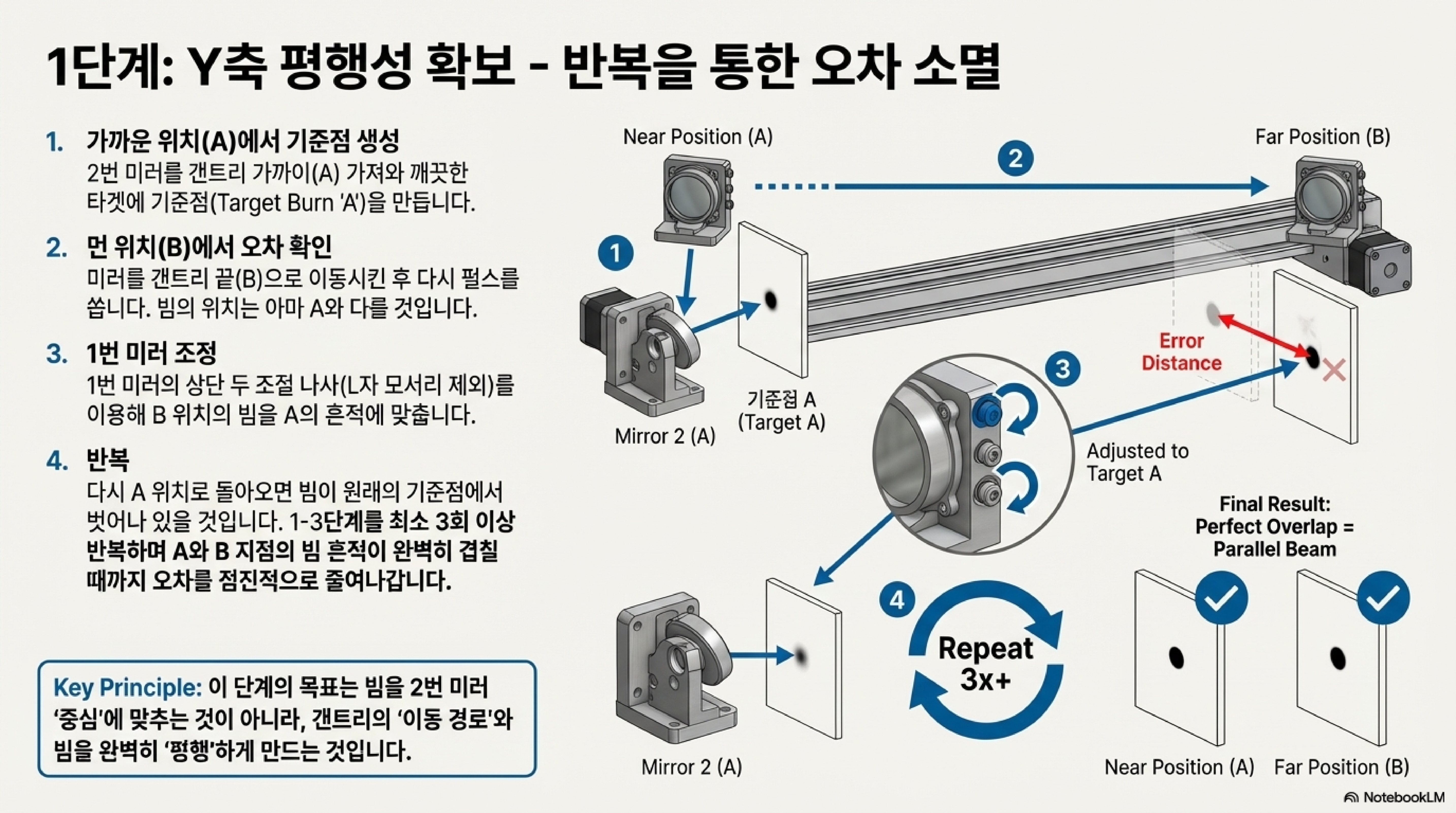 많은 사람들이 빔 정렬을 한두 번의 조정으로 끝낼 수 있는 작업이라 생각하지만, 현실은 전혀 다릅니다. 완벽한 정렬은 결코 단 한 번의 시도로 이루어지지 않습니다. 빔의 경로를 확인하는 두 지점(가까운 곳 A와 먼 곳 B) 사이를 끊임없이 오가며 오차를 점진적으로 줄여나가는 '반복(iteration)' 과정이 필수적입니다. 그는 현실적으로 최소 3~4번의 시도가 필요하다고 강조합니다.