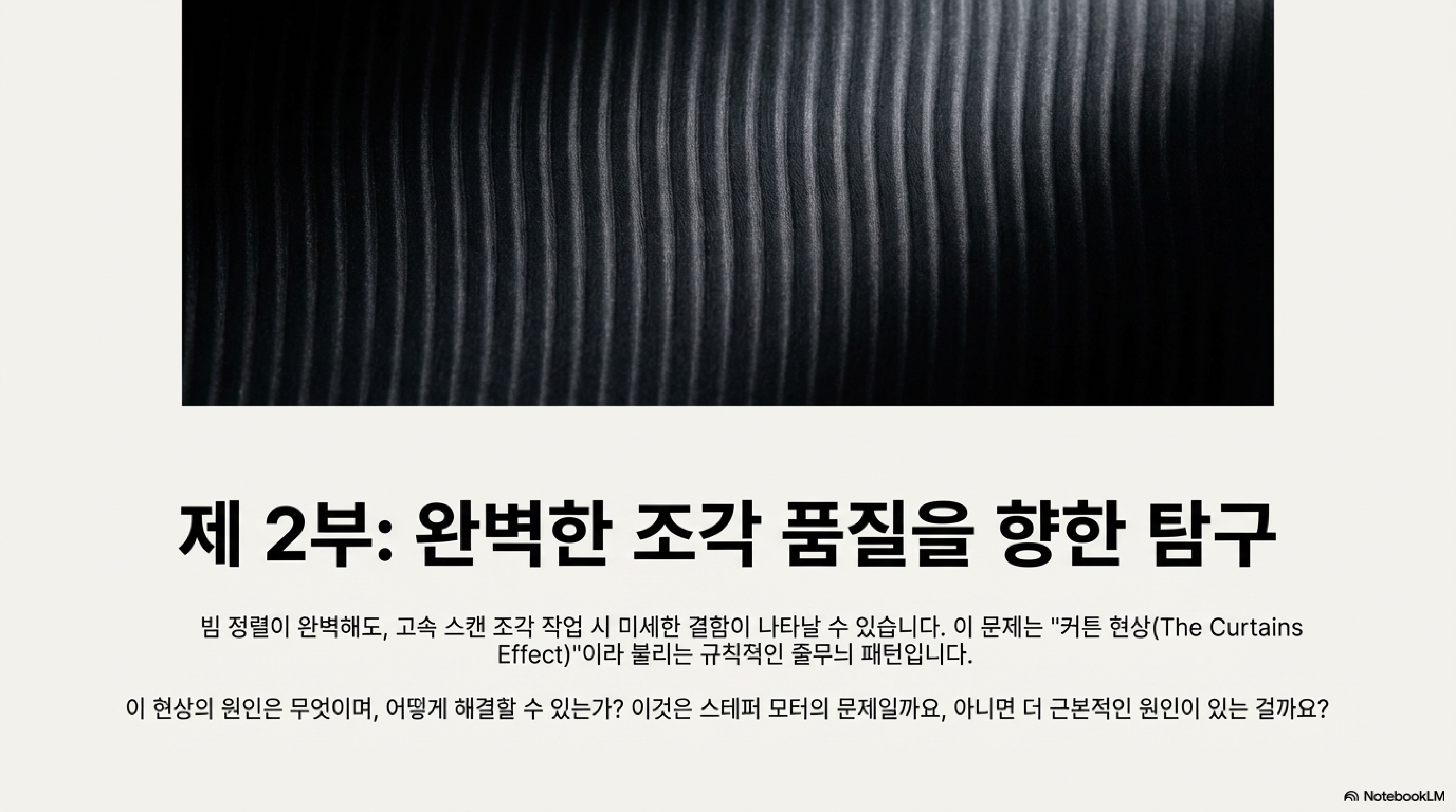 레이저로 이미지를 조각할 때 나타나는 미세한 세로줄 무늬, 이른바 '커튼(curtains)' 현상은 많은 사용자들을 괴롭히는 고질적인 문제였습니다. 그 원인은 타이밍 벨트의 톱니가 풀리와 맞물리는 순간 발생하는 아주 미세한 속도 변화(jattery motion) 때문이었습니다. 레이저 출력이 일정한 상태에서 헤드의 이동 속도가 미세하게 빨라지면 얕게 파이고, 느려지면 깊게 파이면서 줄무늬를 만드는 것입니다.