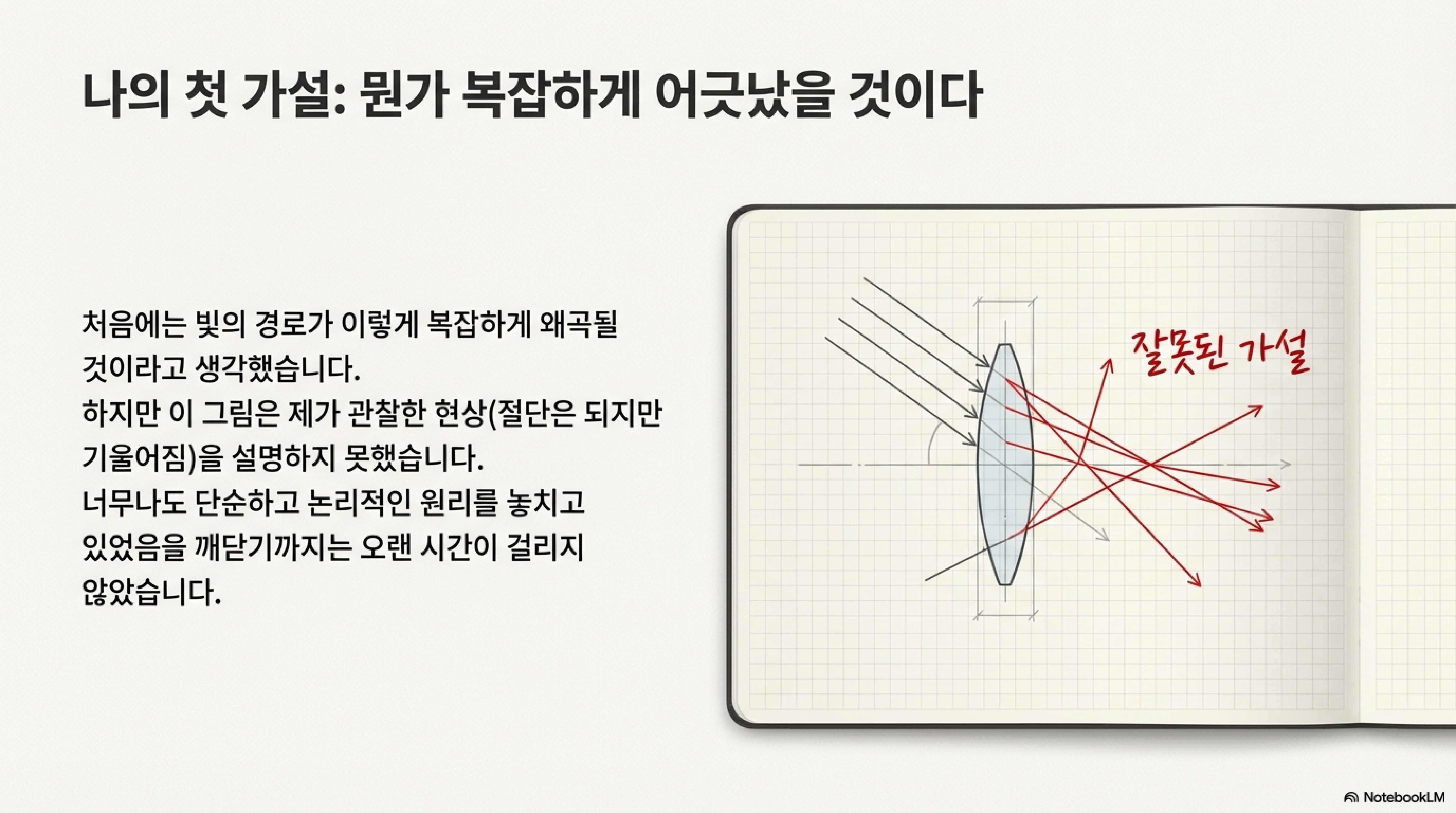모든 것은 제 차고에서 진행된 아주 간단한 실험에서 시작되었습니다. 저는 LED 포인터와 초점 거리 약 4인치의 렌즈를 이용해 조잡한 광학 실험대를 만들었습니다. 평행한 광선(레이저 빔)이 렌즈의 정확한 중심을 통과할 때, 빛은 목표물의 한 점에 정확히 초점을 맺었습니다. 여기까지는 예상대로였습니다. 진짜 놀라움은 이제부터 시작이었습니다.