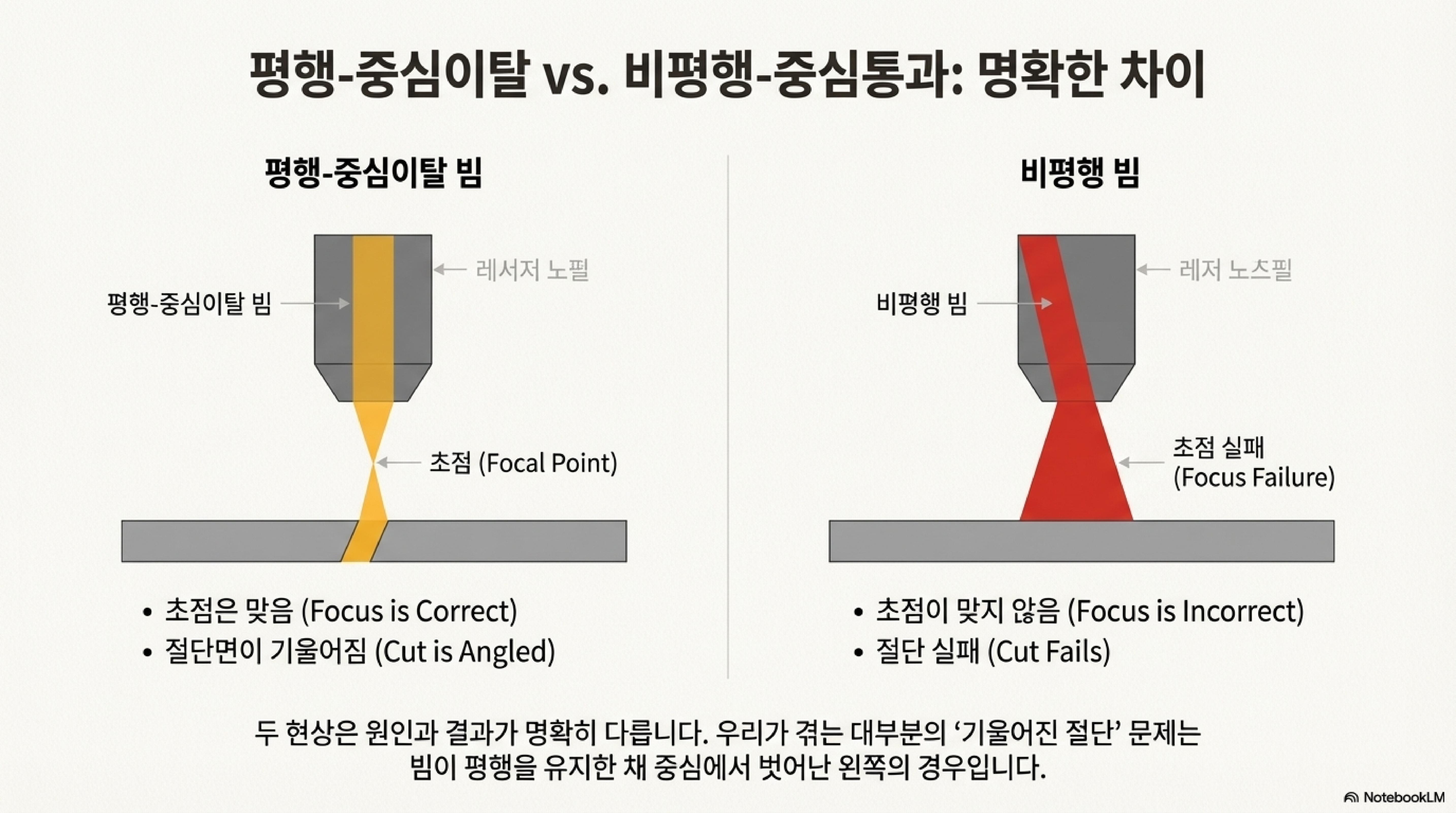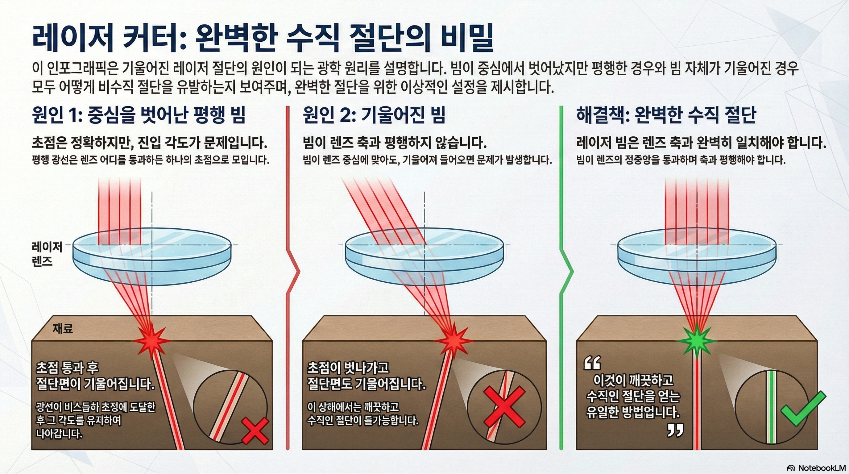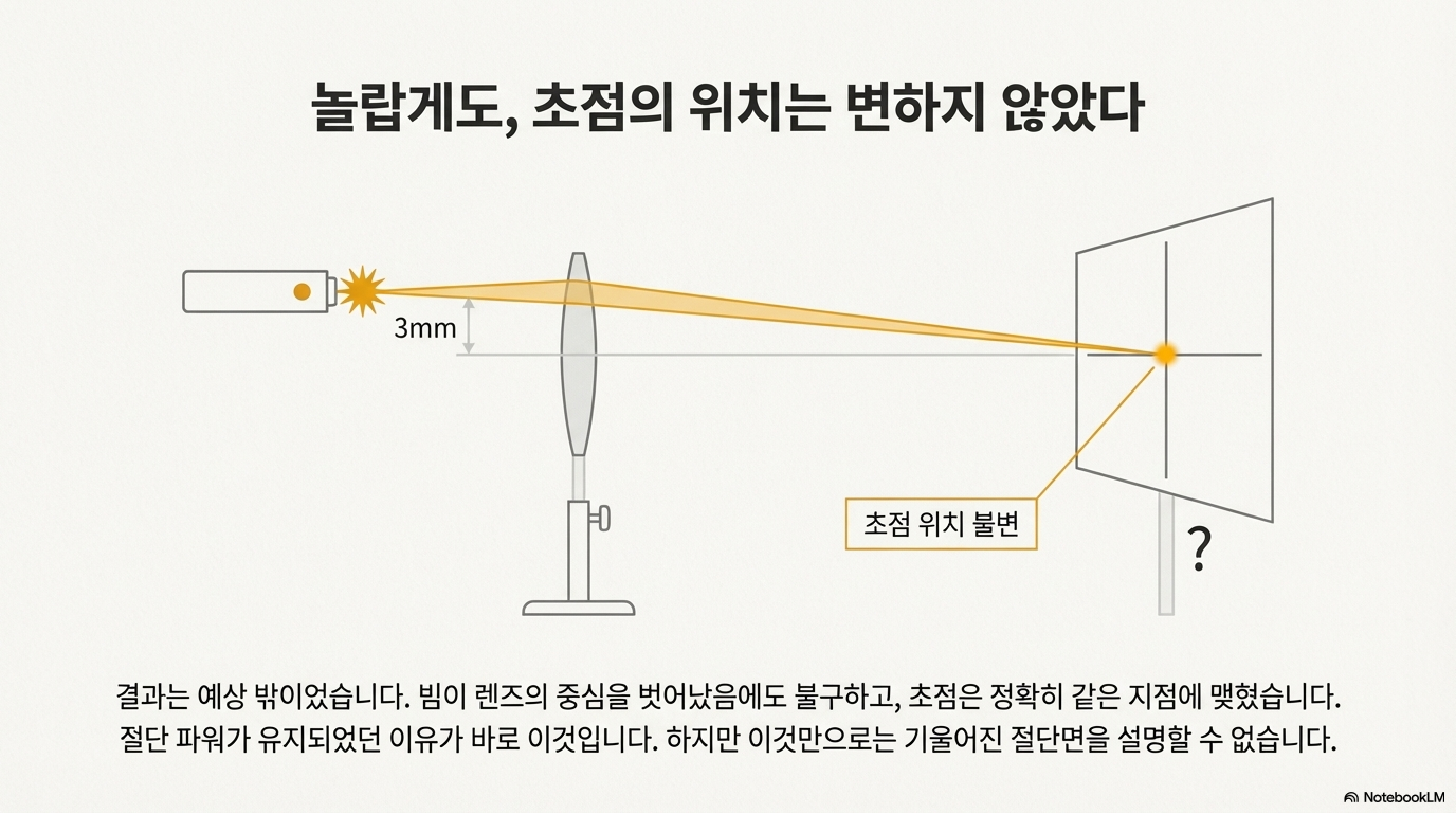 이 실험은 빔의 '평행성'이 얼마나 중요한지를 명확히 보여줍니다. 빔이 렌즈 축과 평행하지 않으면, 초점 자체가 엉뚱한 곳에 맺히게 되어 제대로 된 절삭이 불가능해집니다. 미스터리를 푸는 과정에서 우리는 빔의 평행성이 초점의 위치를 결정하고, 빔의 중심점이 절단의 각도를 결정한다는 사실을 분리해서 이해하게 된 것입니다.