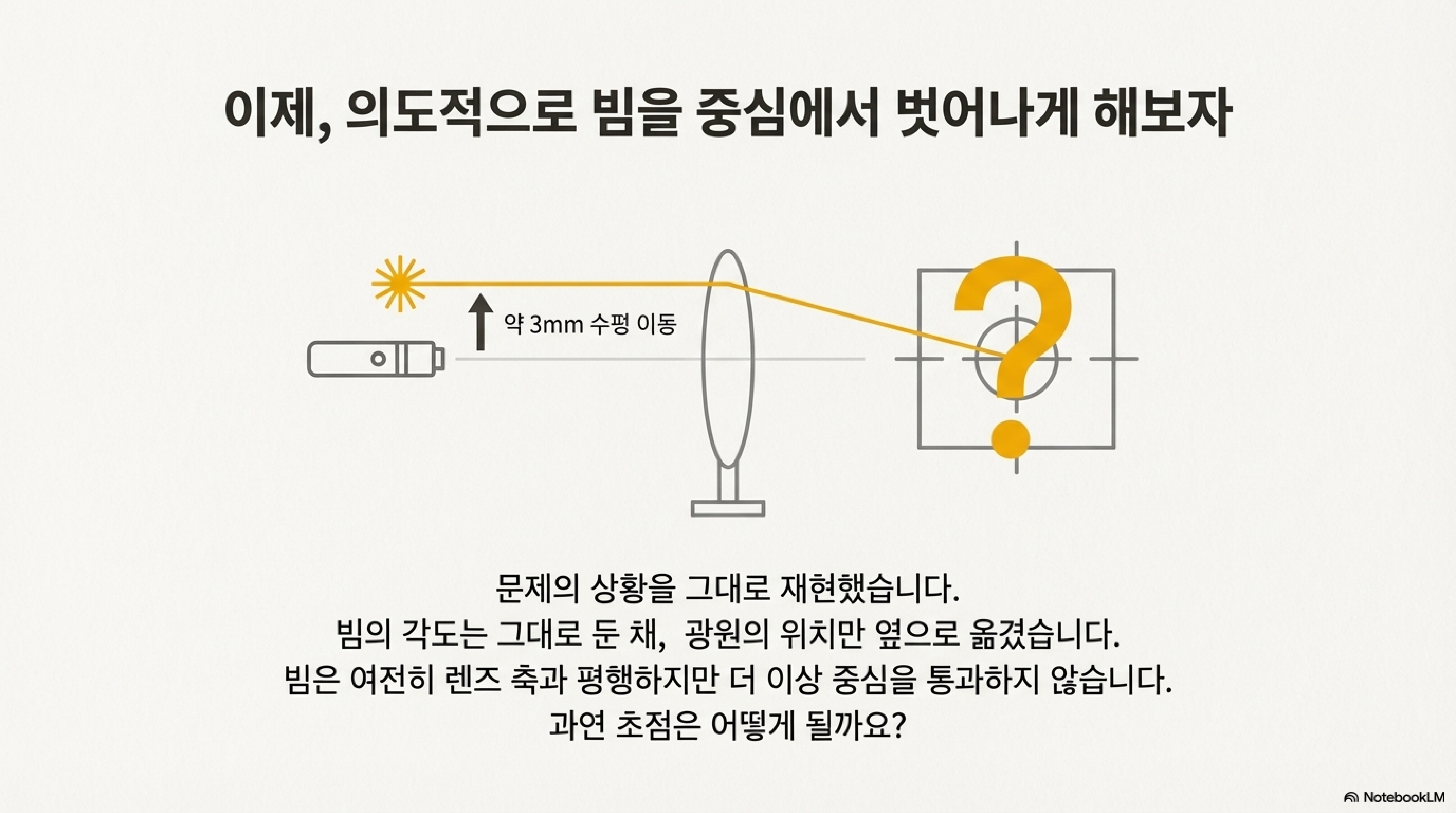 저는 빔 전체를 렌즈 중심에서 약 3mm 옆으로 평행하게 이동시켰습니다. 빔은 더 이상 렌즈의 중심을 통과하지 않았죠. 그런데 놀랍게도, 초점의 위치는 전혀 변하지 않았습니다. 이것이 저에게 '당혹스러울 만큼' 단순한 깨달음을 준 순간이었습니다.