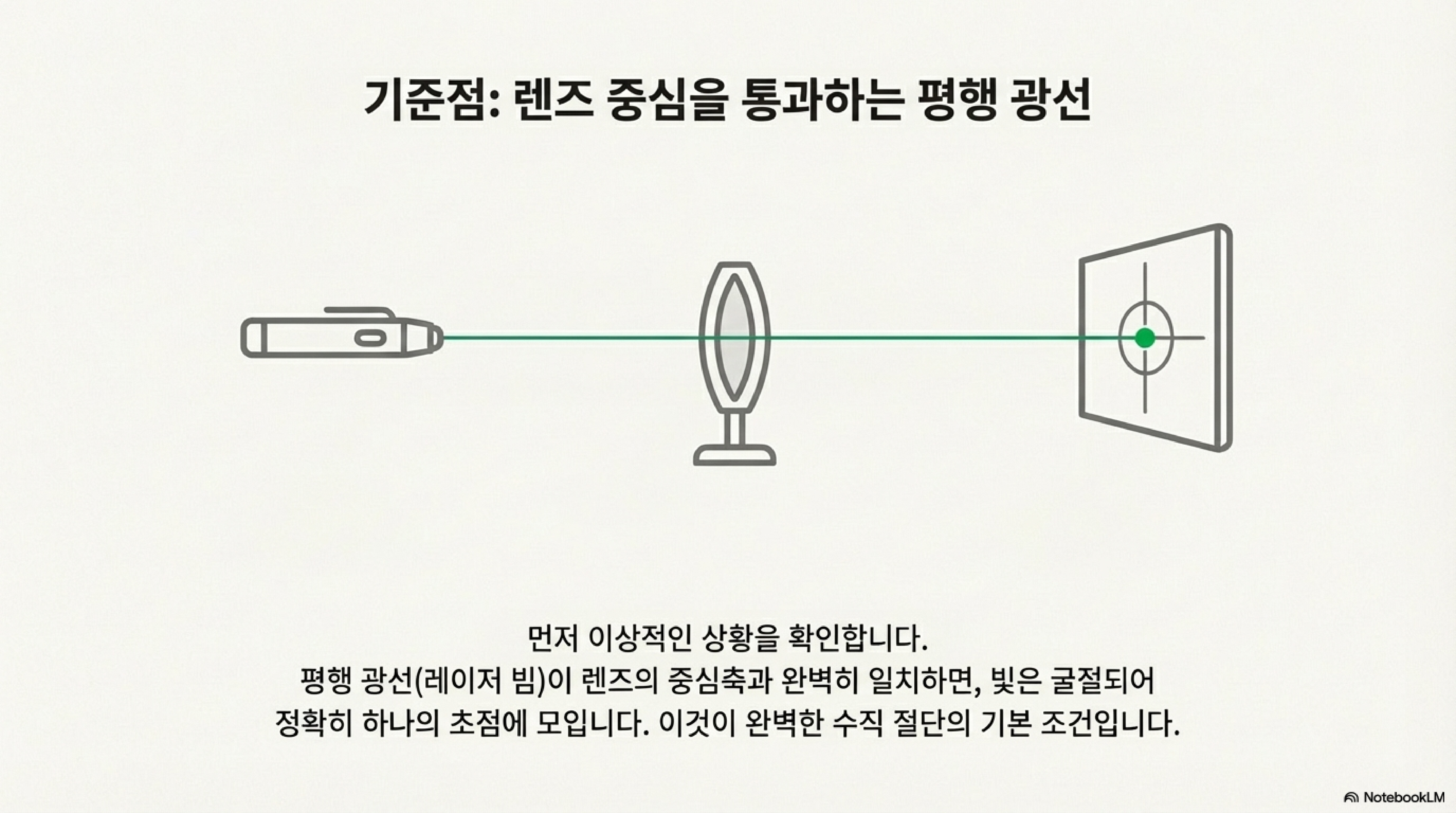 '일치(Coincident)'라는 이 한 단어에 모든 해답이 담겨 있습니다. 이는 빔이 렌즈 축과 평행하여(parallel) 초점 위치를 정확히 맞추고, 동시에 중심을 통과하여(centered) 절단면을 수직으로 유지해야 한다는 두 가지 조건을 모두 만족시키는 유일한 상태이기 때문입니다.