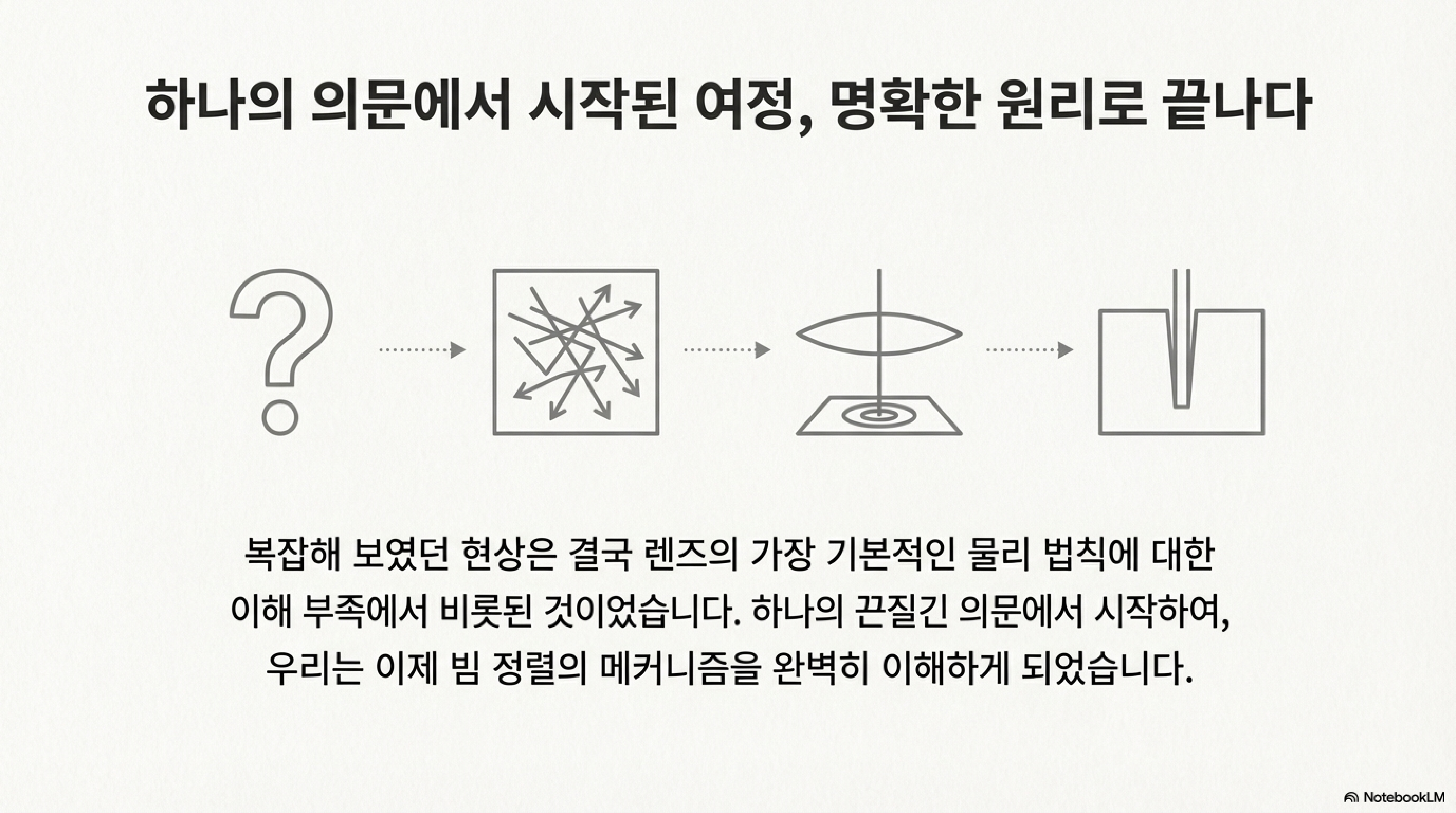 복잡해 보였던 레이저 빔 정렬 문제가 결국에는 가장 기본적인 광학 원리로 귀결되는 여정이었습니다. 때로는 가장 어려운 문제의 해답이 가장 기본적인 원리 속에 숨어있는 것 같습니다.