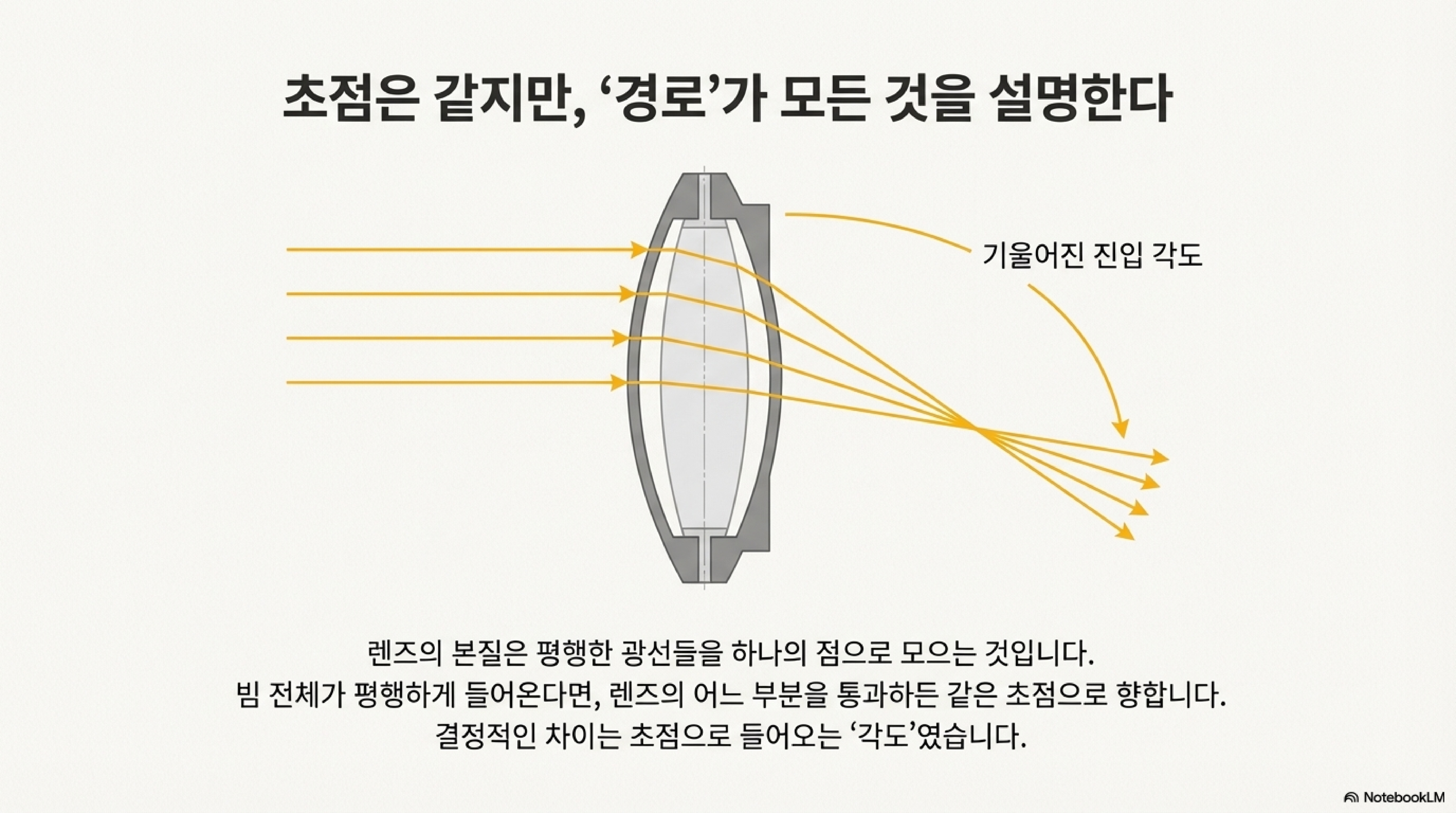왜일까요? 답은 렌즈의 가장 본질적인 기능에 있었습니다. 렌즈의 역할은 바로 "평행한 광선을 하나의 점으로 모으는 것"입니다. 렌즈를 평행 광선을 모으는 '중력 우물'이라고 생각해보면 쉽습니다. 광선이 우물의 정중앙으로 들어오든, 가장자리로 들어오든, 평행하기만 하다면 결국 같은 바닥(초점)으로 떨어지는 것과 같은 이치입니다. 초점의 위치는 변할 이유가 없었던 것입니다.