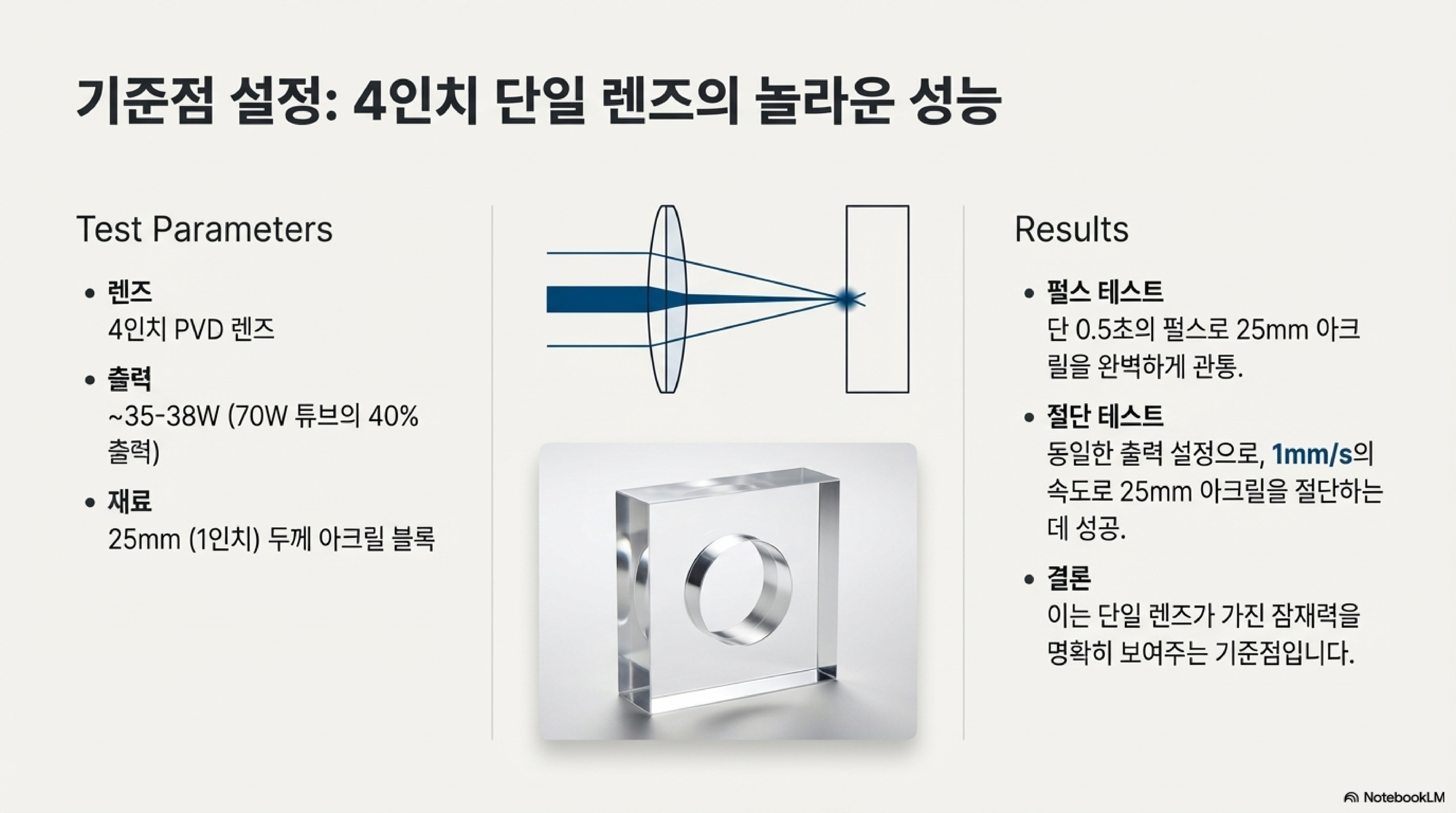 이 강력한 중심부의 광선은 렌즈의 곡률에 의한 굴절 효과를 가장 적게 받습니다. 그 결과, 명목상의 초점 거리보다 훨씬 더 멀리까지 강력한 에너지를 전달하는 '힘의 스파이크(spike of power)'를 만들어냅니다. 이것이 바로 낮은 출력으로도 두꺼운 재료를 관통할 수 있는 비밀입니다. 실제로 단 35와트의 낮은 출력과 4인치 렌즈를 사용하여 25mm(1인치) 두께의 아크릴을 단 1초 만에 관통하는 실험이 이를 증명합니다. 놀랍게도 이 원리는 긴 초점 렌즈에도 동일하게 적용됩니다. 동일한 35와트 출력으로 7.5인치 렌즈를 사용했을 때도 25mm 아크릴을 1초 만에 관통하는 경이로운 결과를 보여주었습니다. 이는 빔 중심부의 강력한 에너지가 렌즈의 초점 거리에만 의존하는 것이 아님을 증명합니다.