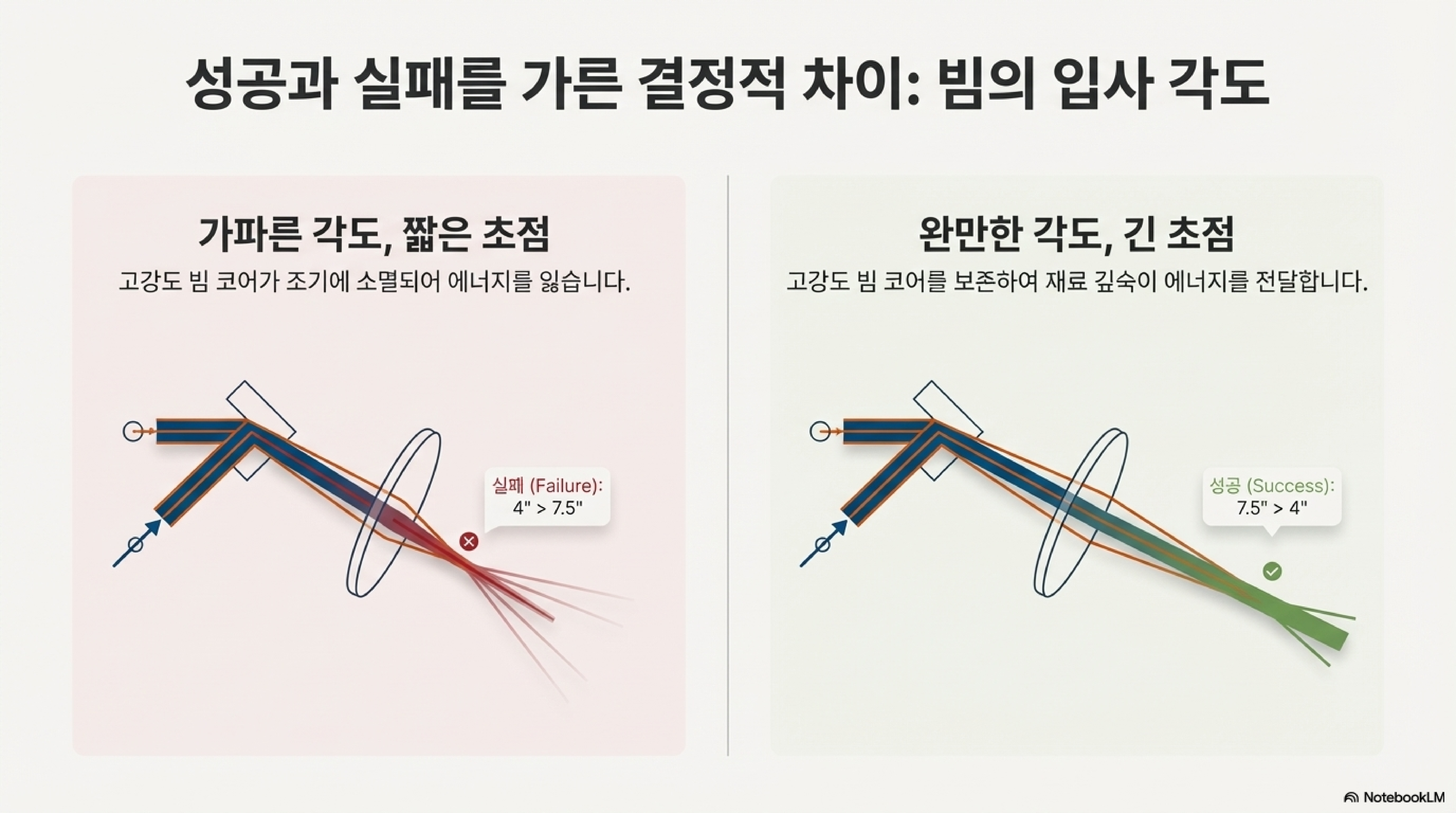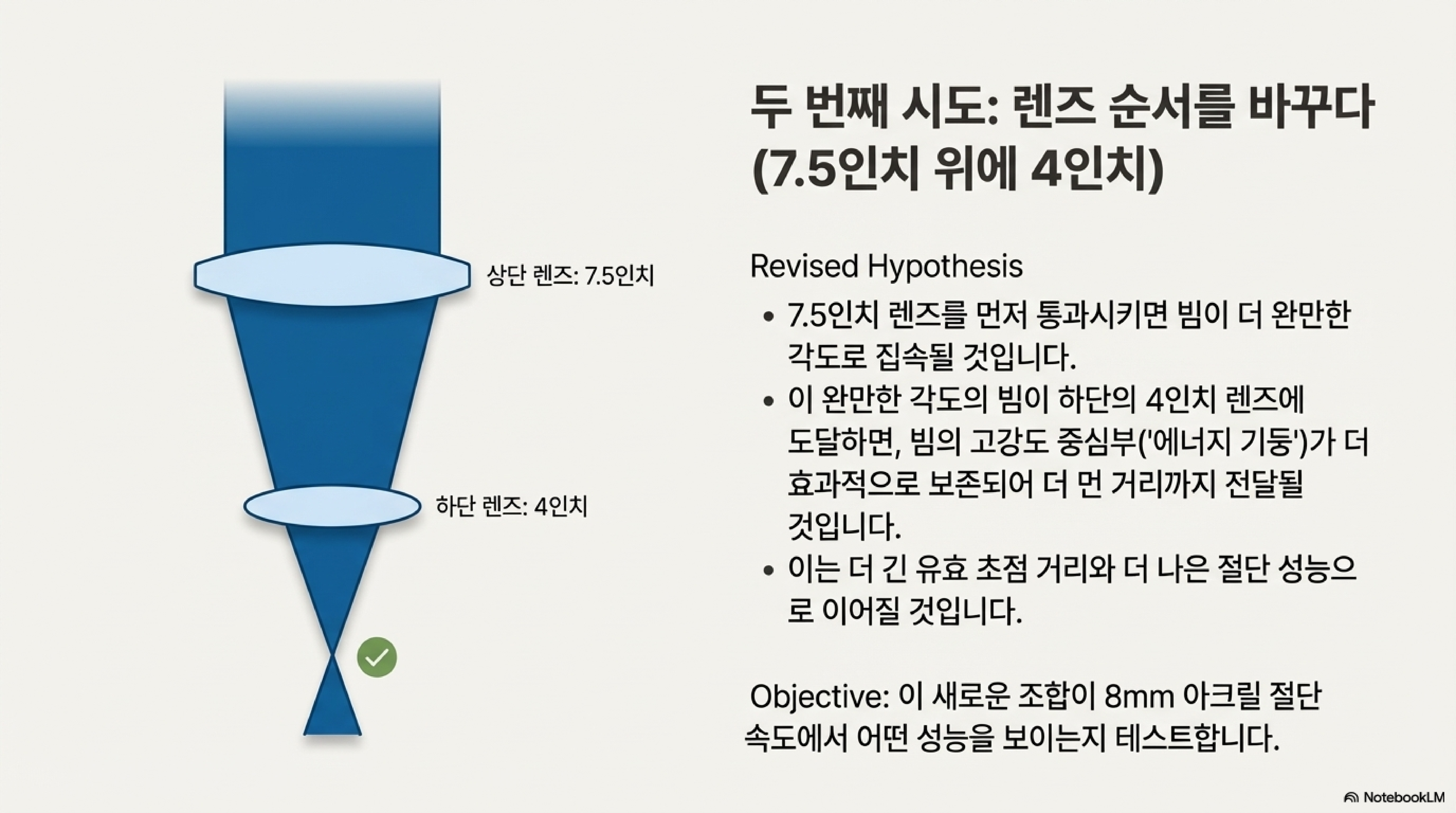 이것이 가능한 이유는 앞서 설명한 '렌즈 중심부의 힘'과 깊은 관련이 있습니다. 첫 번째 7.5인치 렌즈는 레이저 빔을 공격적으로 꺾지 않고 완만하게 모아주는 '컨디셔닝' 역할을 합니다. 그 결과, 두 번째 4인치 렌즈에 도달하는 빔의 중심부 광선들은 거의 평행에 가까운 상태를 유지하게 됩니다. 이 '준비된' 광선들은 두 번째 렌즈의 중심부를 통과하며 과도하게 굴절되지 않고, 그 강력한 '힘의 스파이크'를 온전히 보존한 채 더 멀리까지 전달될 수 있게 됩니다. 이것이 절단 성능을 폭발적으로 증가시킨 핵심 원리입니다.