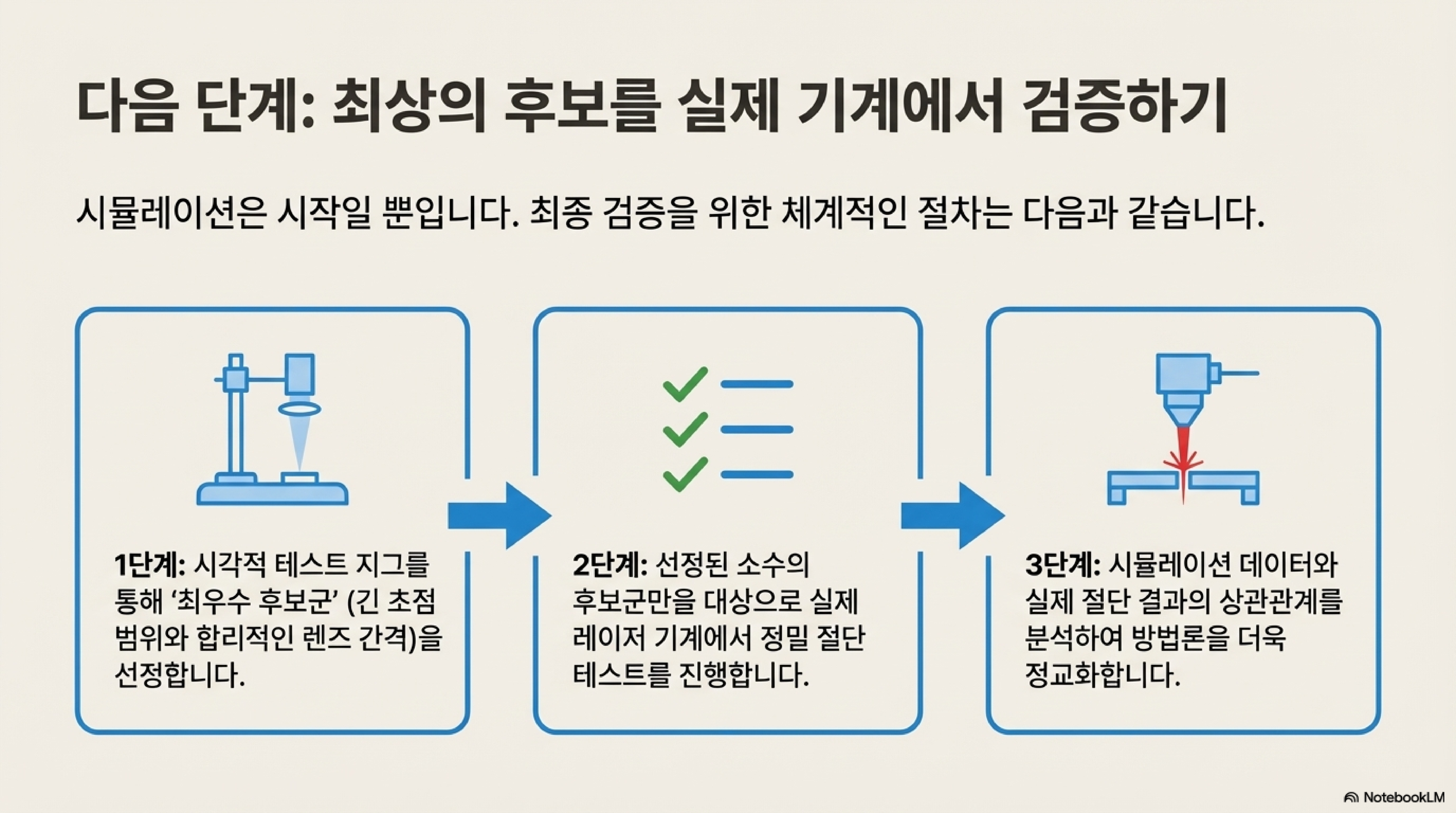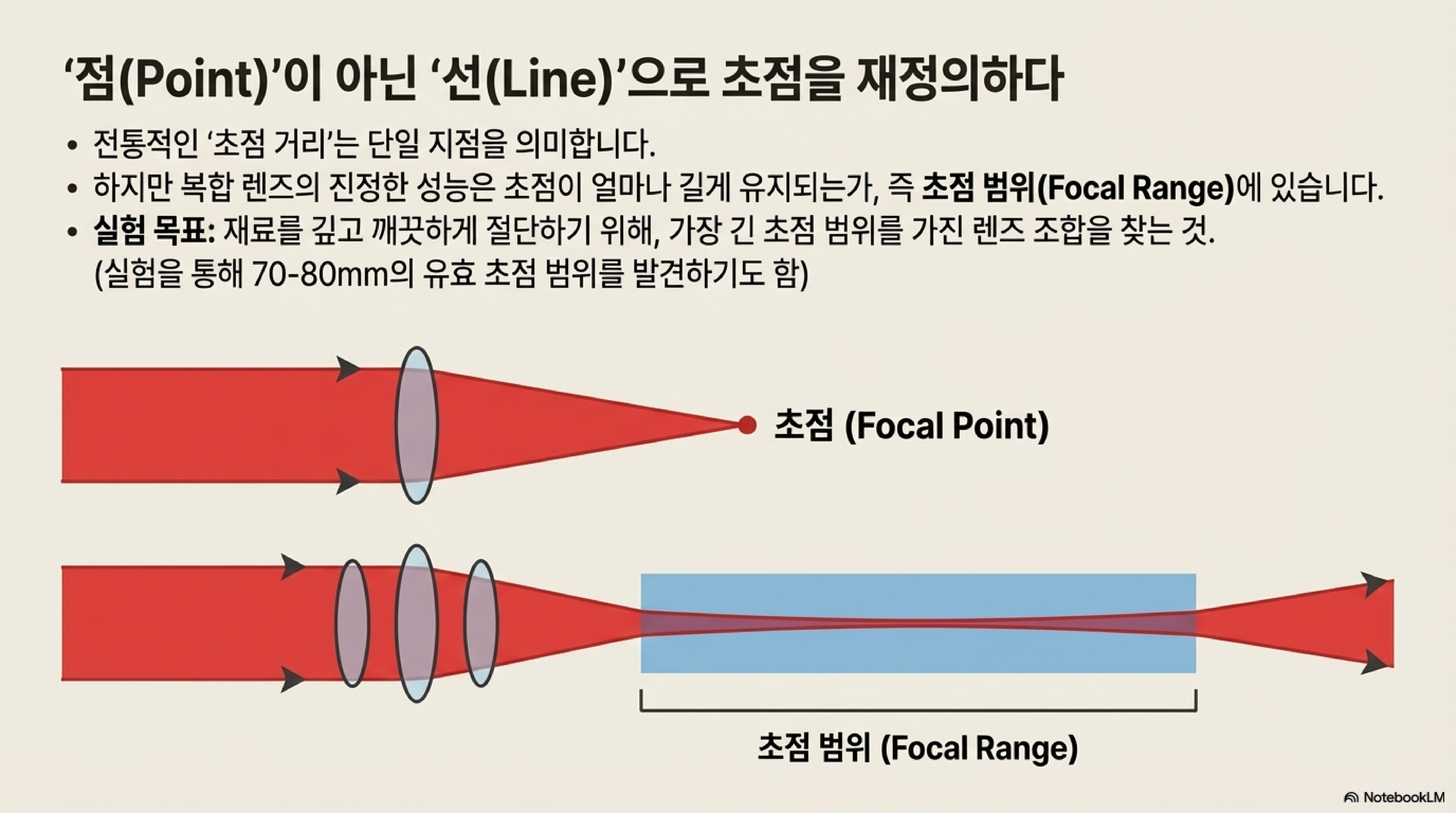 테스트를 진행하며 저는 기존의 '초점(focal point)'이라는 개념이 복합 렌즈 시스템에서는 "잘못된 명칭"이라는 것을 깨달았습니다. 단 하나의 완벽한 지점이 존재하는 것이 아니었습니다. 대신, 렌즈는 "매우 가느다란 고에너지 빛의 빔"을 유지하는 긴 '초점 범위(focal range)'를 만들어냈습니다. 어떤 조합은 이 범위가 무려 70mm에 달하기도 했습니다. 이때 저는 중요한 사실을 깨달았습니다. 초점 범위가 이렇게 길면 이론상의 '중간 지점'을 찾는 것은 거의 불가능하고 무의미하다는 것을요. 실제 작업에서는 빔이 날카로운 초점으로 들어오기 시작하는 지점을 찾고, 거기서부터 70mm 전체 구간을 활용하는 것이 훨씬 실용적인 방법이었습니다. 이 발견은 단순히 과학적 호기심을 넘어, 기계의 초점을 맞추는 방식 자체를 바꾸는 실용적인 기술이 되었습니다.