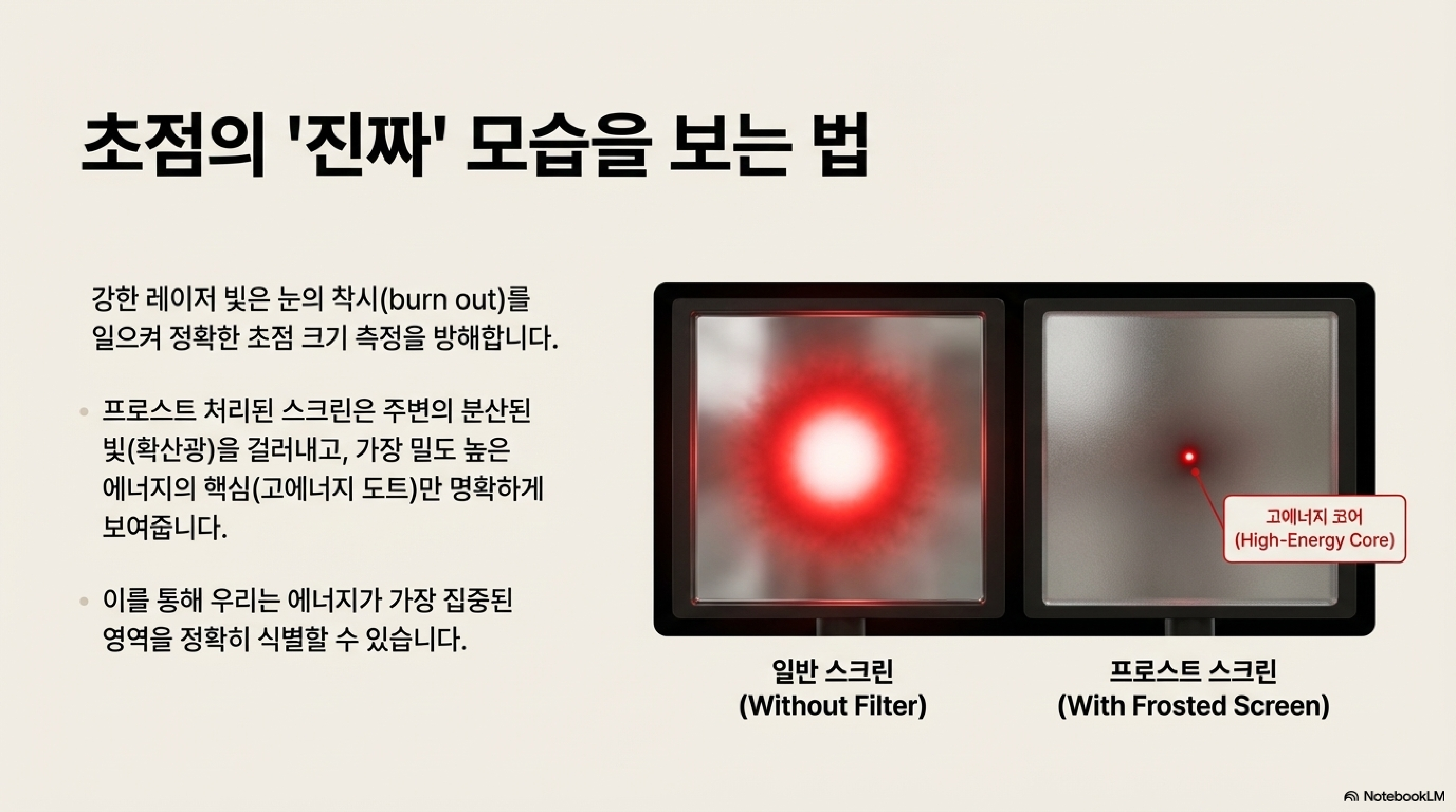여기에 선글라스까지 끼고 보면 주변의 рассеянный свет(산란광)이 더욱 걸러져 에너지 밀도가 가장 높은 중심점의 형태를 훨씬 더 명확하게 관찰할 수 있었습니다. 덕분에 값비싼 장비 없이도 맨눈으로 레이저 빔의 품질을 정확하게 평가할 수 있었죠.