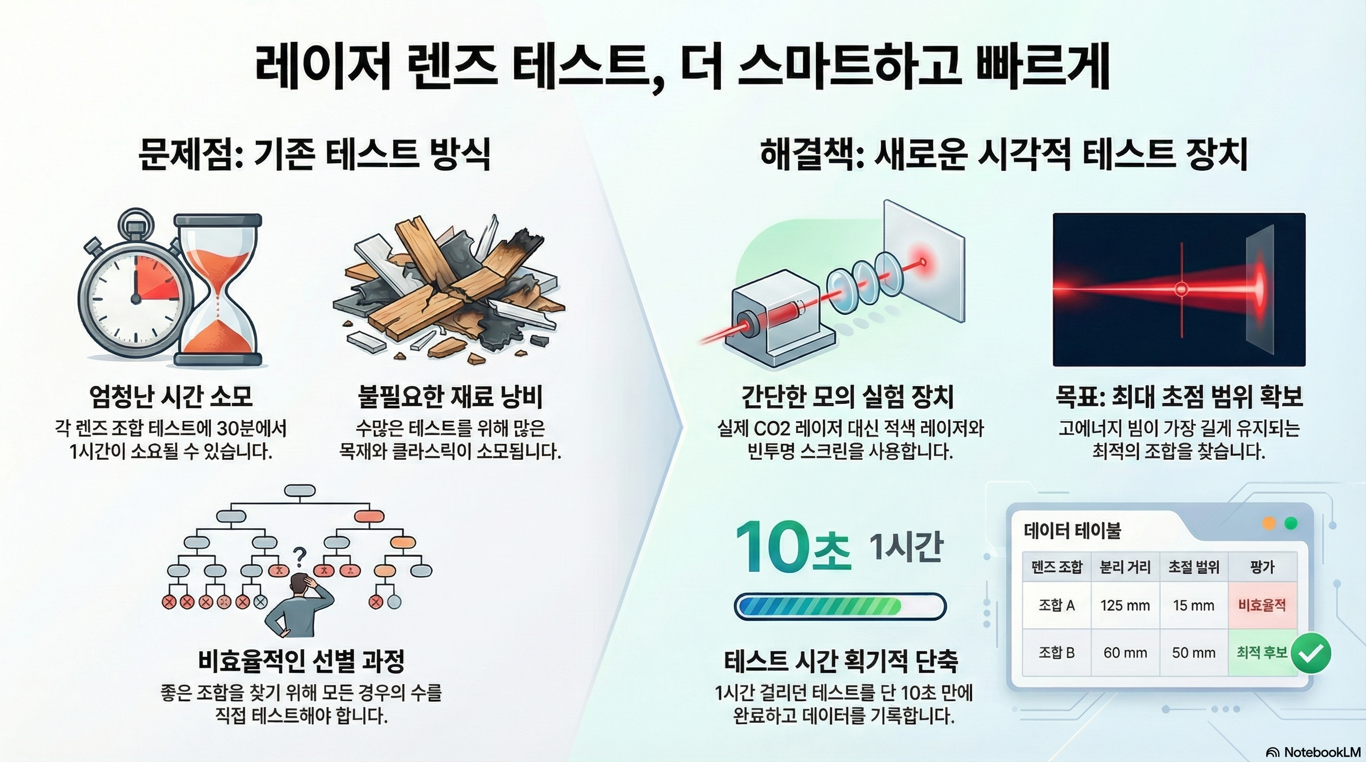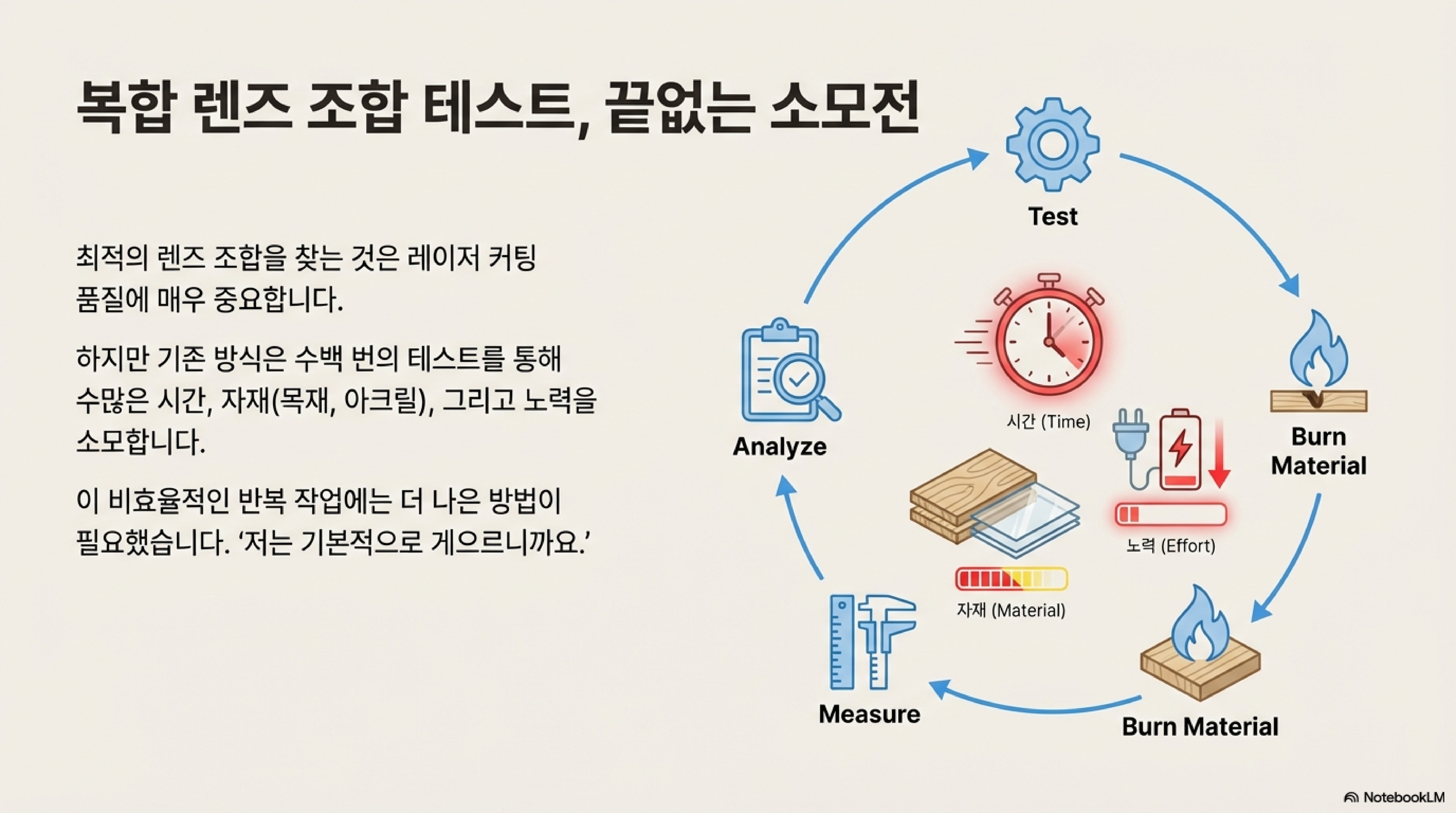레이저 커터를 사용하는 메이커라면 누구나 공감할 만한 순간이 있습니다. 바로 최적의 렌즈 조합을 찾기 위해 수백 번의 테스트를 반복하며 귀중한 시간과 재료를 소모하는 일이죠. 저 역시 추운 작업실에서 수많은 나무와 플라스틱 조각을 태워가며 이 과정을 거쳐야 한다는 생각에 눈앞이 캄캄했습니다. 하지만 저는 기본적으로 게으른 사람이라, 이런 비효율적인 상황을 참을 수 없었습니다. 그래서 생각했습니다. '더 나은 방법이 분명 있을 거야.' 결국 저는 차가운 작업실 대신 따뜻한 사무실에서 이 문제를 해결할 독창적인 방법을 찾아냈습니다. 이 '게으른' 노력이 어떤 놀라운 발견으로 이어졌는지 지금부터 이야기해 보겠습니다.
