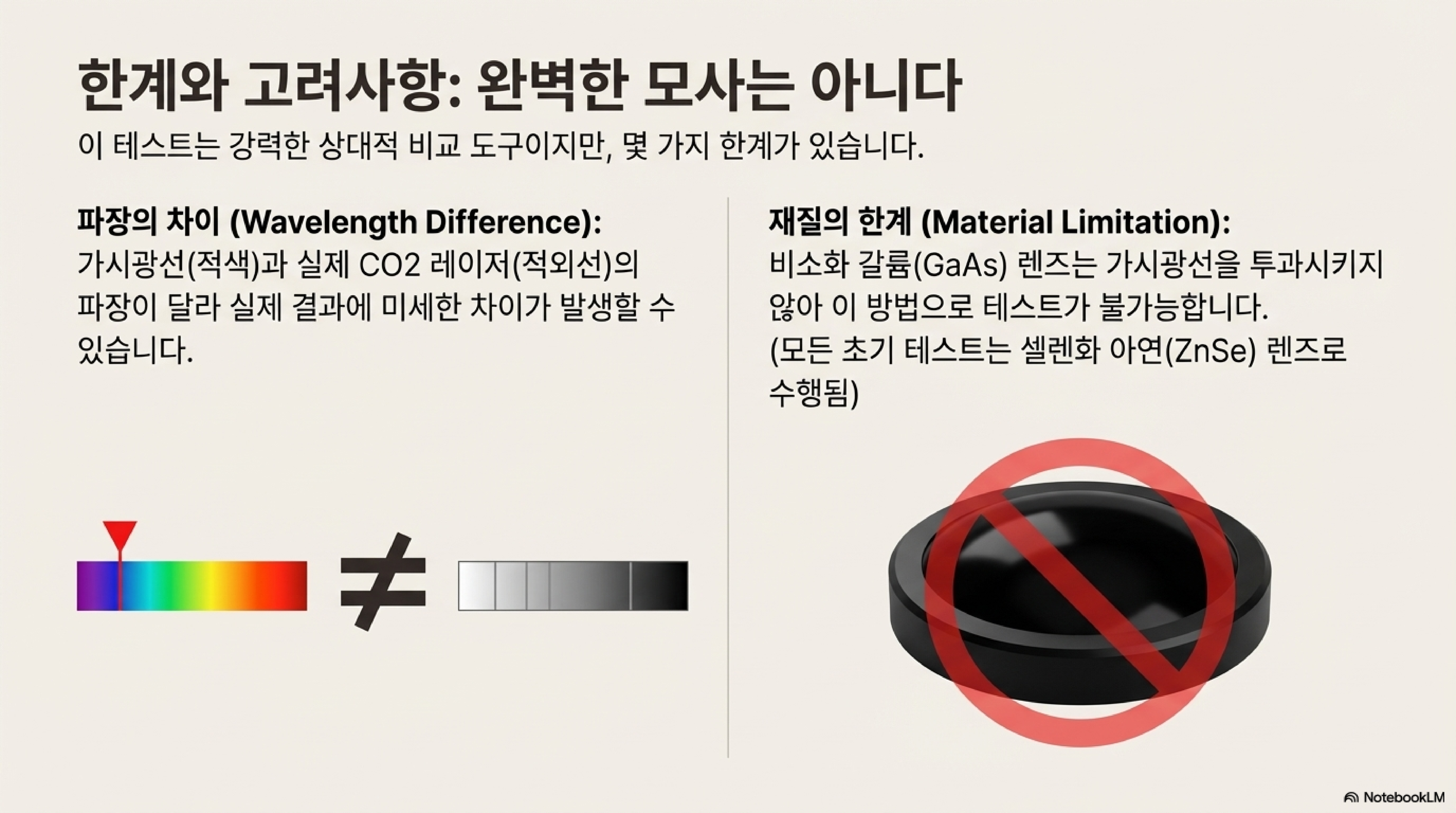 제 테스트 방법론이 가진 명확한 한계점이자 흥미로운 과학적 사실도 발견했습니다. 고출력 레이저에 주로 사용되는 '갈륨 비소(Gallium Arsenide)' 렌즈는 적외선은 훌륭하게 투과시키지만, 가시광선은 전혀 통과시키지 못하는 "완전히 검은색" 물질입니다. 즉, 제 빨간색 가시광선 레이저 테스트 장비로는 이 렌즈의 성능을 전혀 확인할 수 없었습니다. 이 역설적인 상황은 제 시각적 테스트 방법이 모든 종류의 렌즈에 적용될 수 없다는 한계를 명확히 보여주었습니다. 이는 과학적 원리가 어떻게 실제 도구의 적용 범위를 제한하는지 보여주는 좋은 예시였습니다.