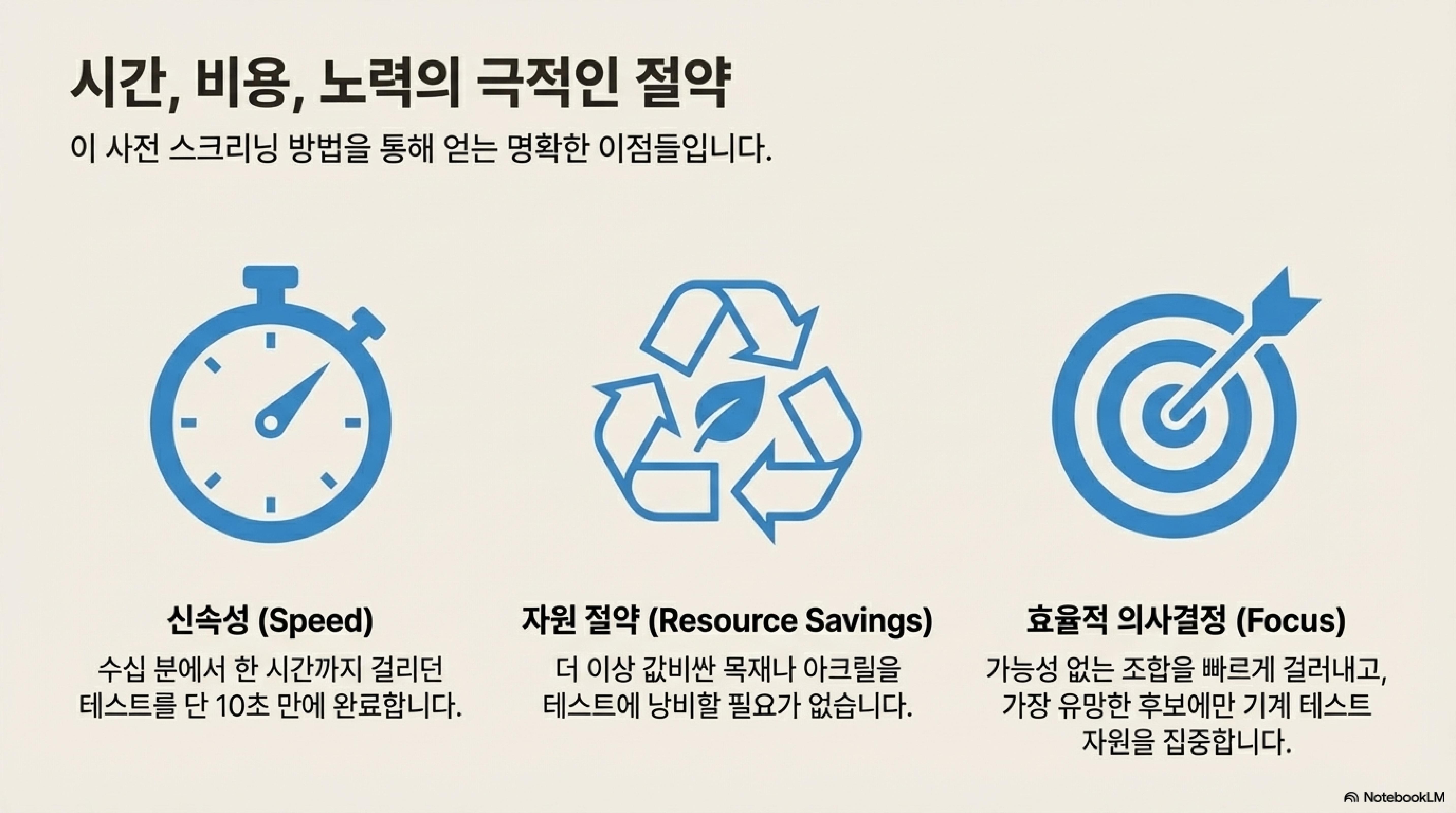 수백 번의 테스트와 그로 인한 재료 낭비를 피하고 싶다는 강한 동기에서 모든 것이 시작되었습니다. 실제 기계에서라면 한 번에 30분에서 1시간까지 걸릴 수 있는 테스트를 단 10초 만에 끝낼 수 있는 시뮬레이션 장치를 만들기로 결심한 것이죠. 이 간단한 아이디어는 테스트 과정을 극적으로 바꾸어 놓았습니다. 이는 단순히 시간을 절약하는 것을 넘어, 기존 방식으로는 불가능했을 만큼 폭넓은 실험을 가능하게 했습니다. 수많은 조합을 빠르고 효율적으로 검토하며 최적의 해답으로 가는 길을 가속할 수 있었죠. 결국 '똑똑한 게으름'이야말로 진정한 혁신의 원동력이 될 수 있음을 증명한 셈입니다.
