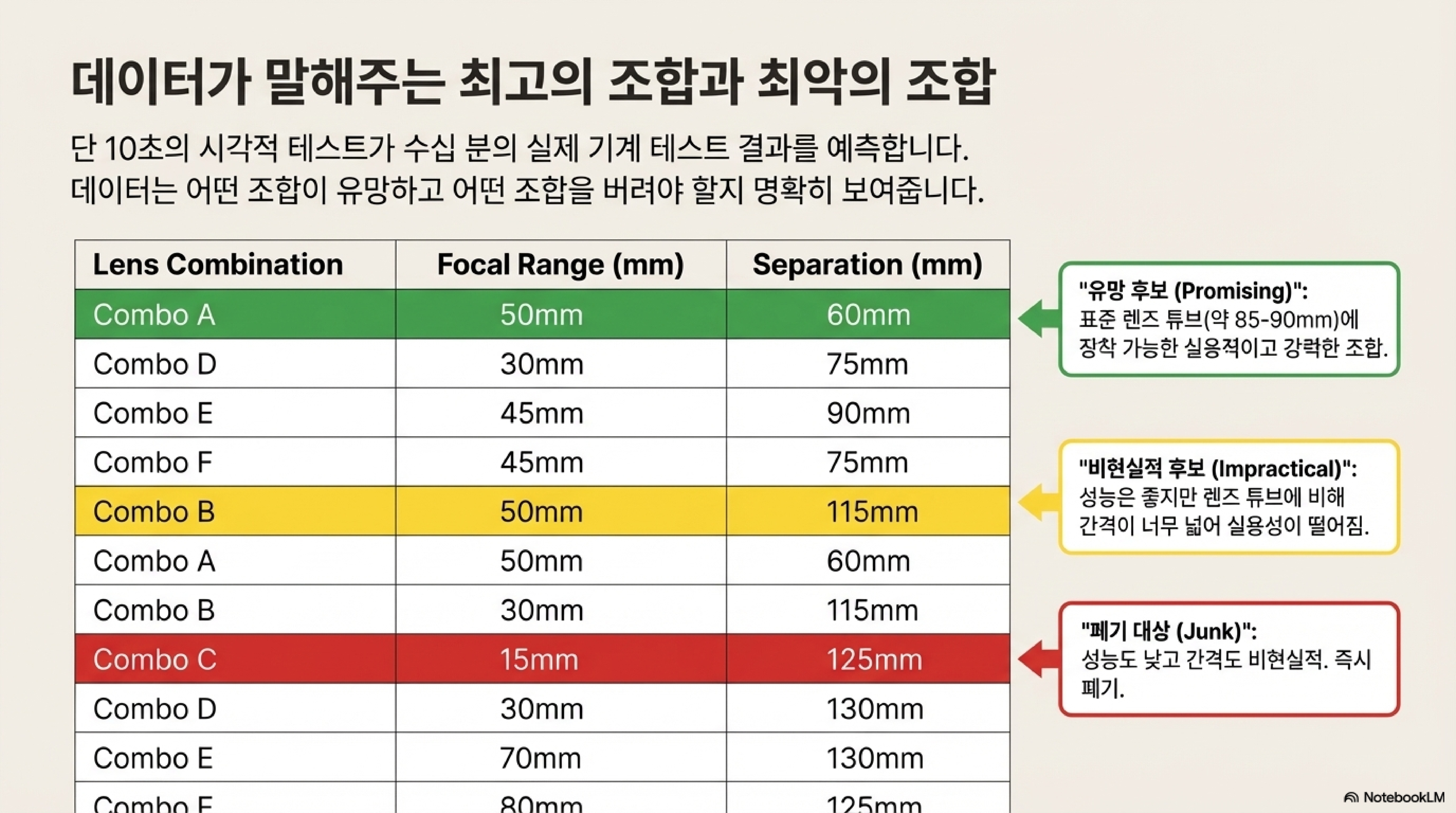 이론적으로 가장 좋은 결과가 항상 현실에서 가장 실용적인 해결책은 아니라는 중요한 교훈도 얻었습니다. 예를 들어, 50mm라는 훌륭한 초점 범위를 가진 렌즈 조합을 찾았지만, 렌즈 사이의 간격이 115mm나 필요했습니다. 일반적인 레이저 커터의 렌즈 튜브 길이가 약 85~90mm인 것을 감안하면, 이 조합은 물리적으로 장착이 불가능했죠. 반면, 똑같이 50mm의 초점 범위를 가지면서도 렌즈 간격이 60mm에 불과한 실용적인 조합도 있었습니다. 이 조합은 표준 렌즈 튜브에 편안하게 장착할 수 있었죠. 한편, 15mm라는 짧은 초점 범위에 125mm의 간격이 필요한 조합은 그야말로 "쓰레기"였습니다. 이 경험을 통해 저는 성능 수치뿐만 아니라 실제 장비에 적용 가능한지 여부를 함께 고려하는 엔지니어링의 트레이드오프(trade-off)를 체감할 수 있었습니다.