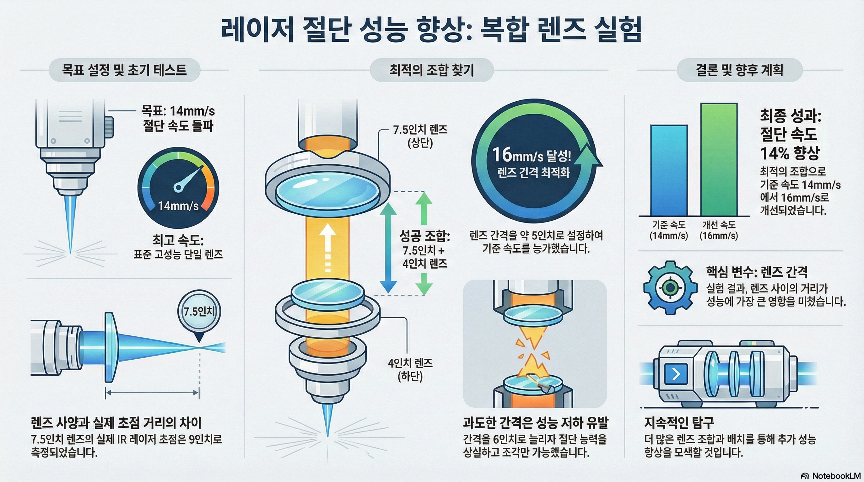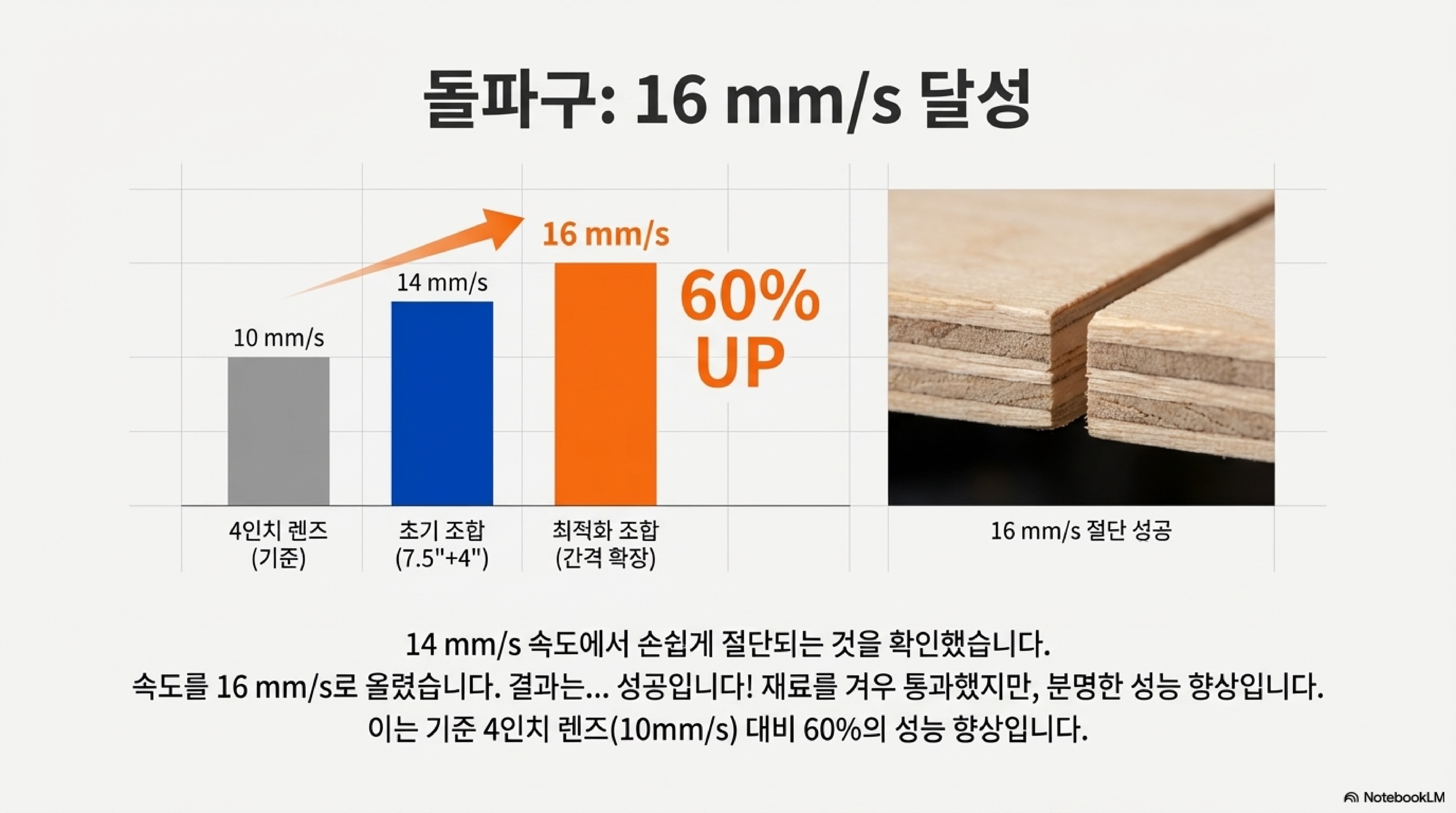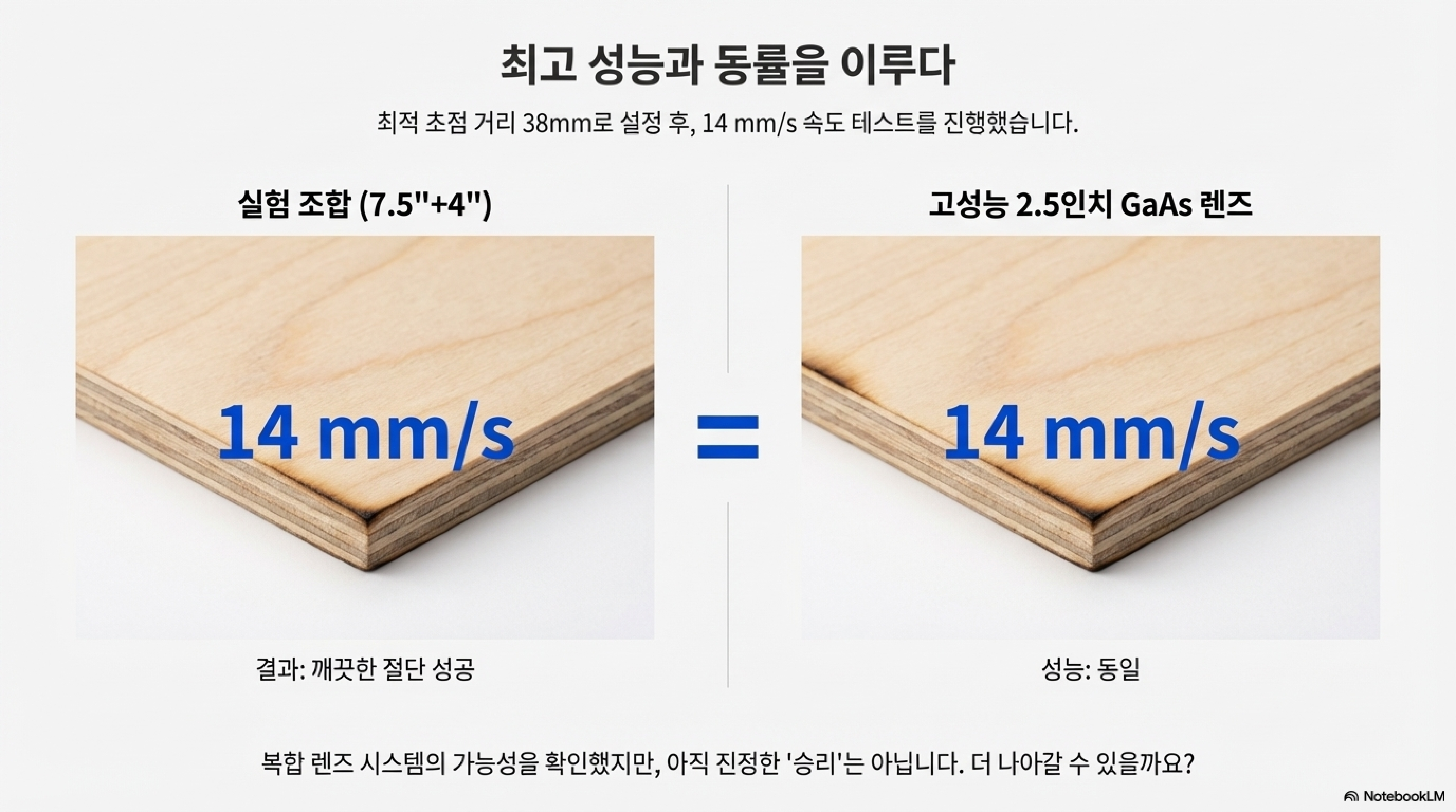 이러한 끈질긴 실험을 통해 기존 4인치 단일 렌즈의 한계였던 10mm/s의 절단 속도를 16mm/s까지 끌어올려 무려 60%의 성능 향상을 이뤄냈습니다. 마법이 아니라, 끈기 있고 지적인 탐구를 통해 얻어낸 결과입니다. 여러분의 작업실에 잠자고 있는 장비들에는 과연 어떤 잠재력이 숨어 있을까요? 약간의 호기심과 실험 정신이 그 잠재력을 깨울 수 있을지도 모릅니다.