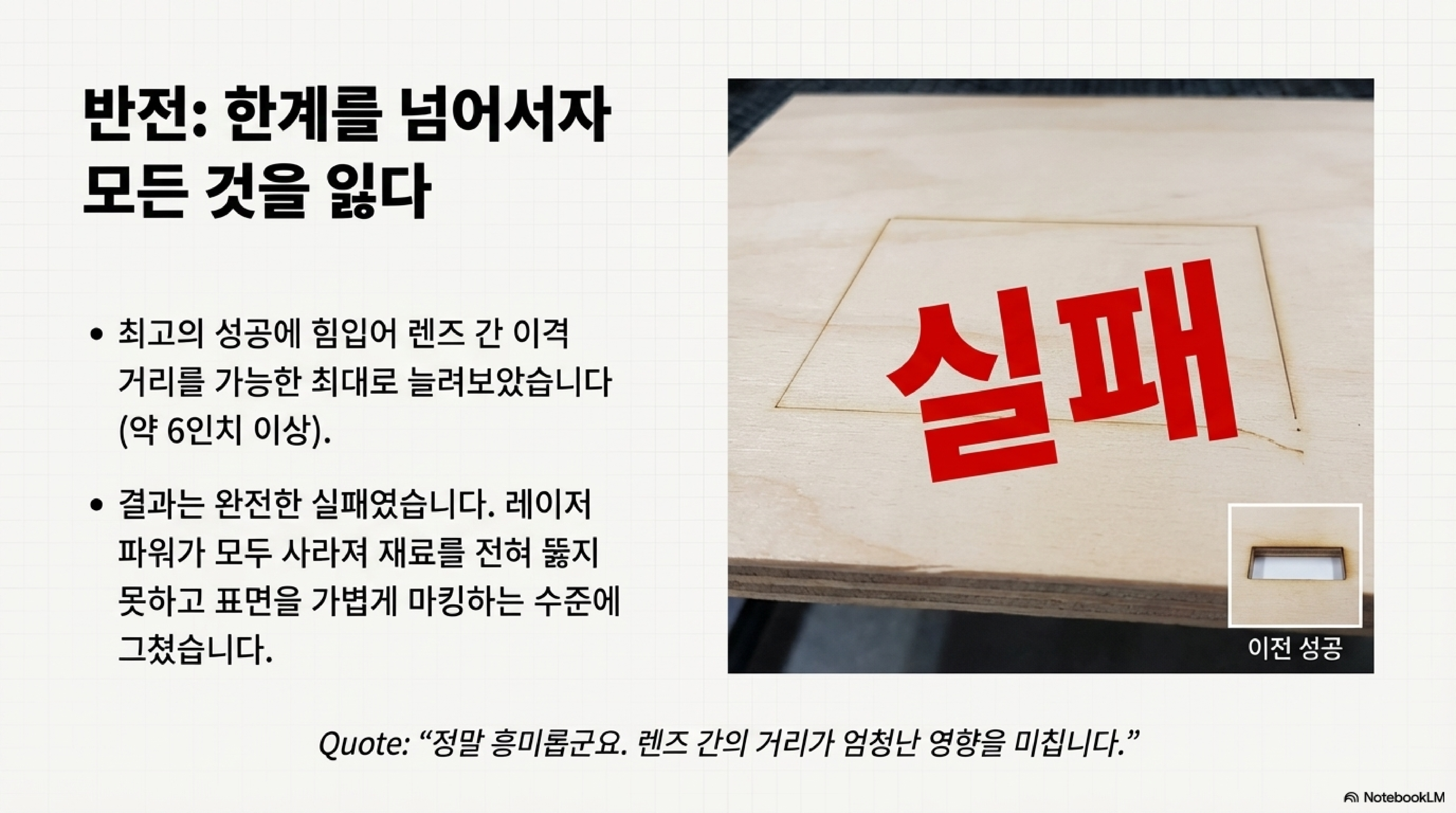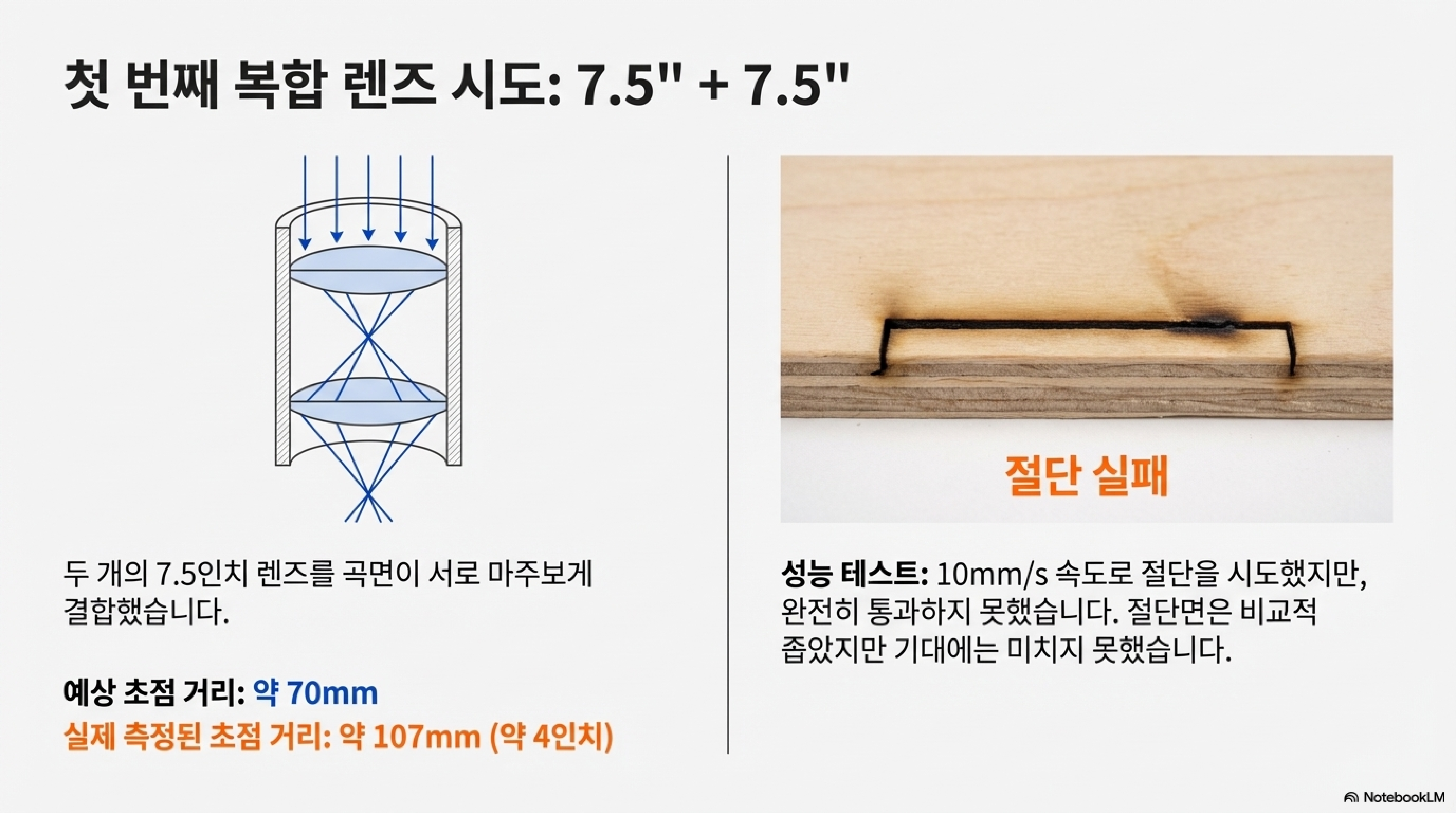 놀랍게도, 두 렌즈를 결합한 복합 렌즈의 첫 테스트부터 결과는 성공적이었습니다. 절단 속도가 즉시 14mm/s로 향상된 것입니다. 단번에 40%의 성능 개선을 이룬 셈이죠. 이에 고무되어 렌즈 사이의 간격을 조금 더 늘려보자, 절단 속도는 16mm/s까지 올라갔습니다. 성능이 계속해서 좋아지는 것을 보고, 간격을 약 6인치까지 최대로 벌려보았습니다. 그런데 믿을 수 없는 일이 벌어졌습니다. 강력했던 절단력은 온데간데없이 사라지고, 재료 표면에 희미한 각인 자국만 남긴 것입니다.