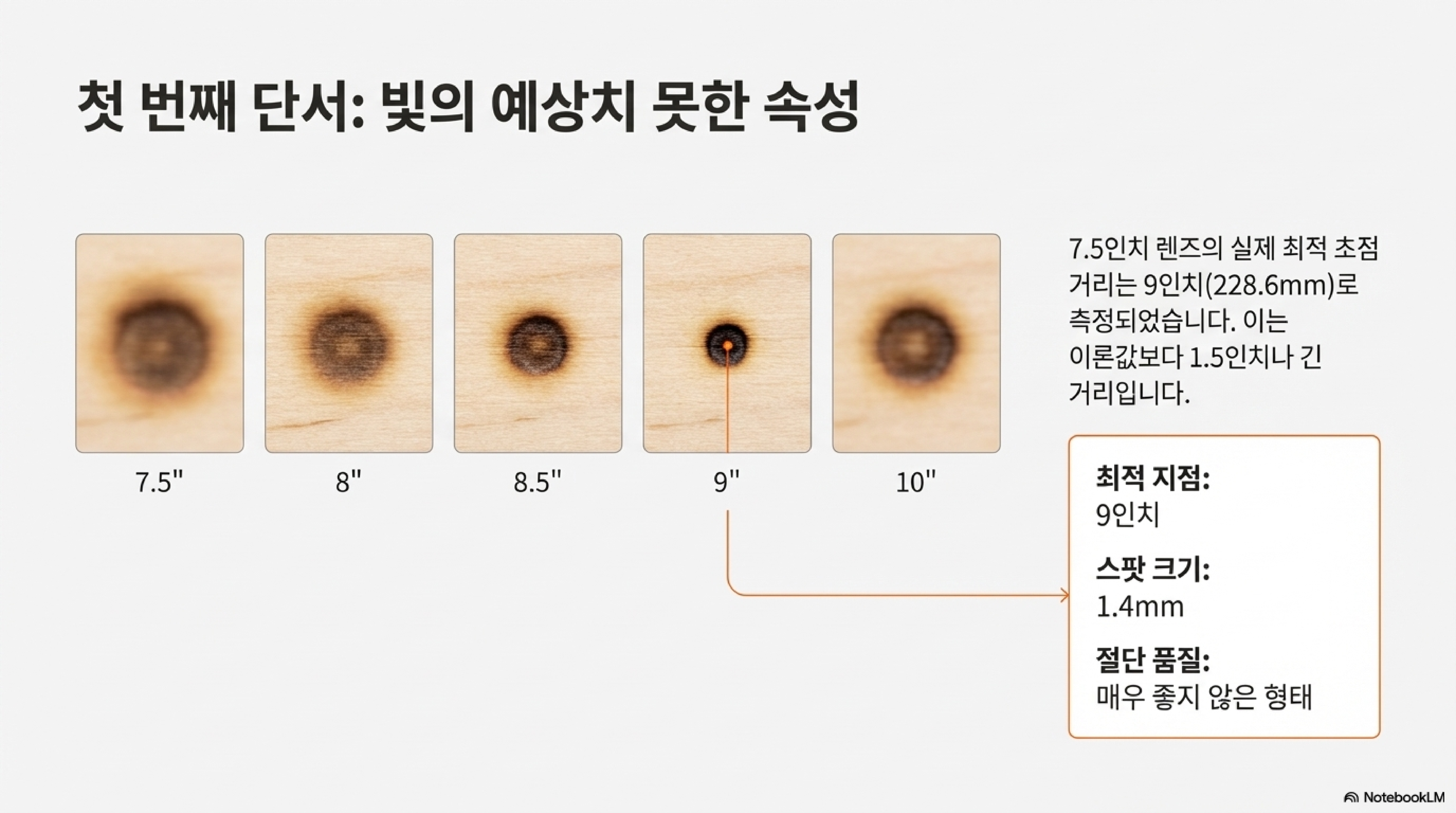 뭔가 잘못되었다는 직감에 거리를 8인치, 8.5인치로 점차 늘려가며 테스트를 반복했습니다. 거리가 멀어질수록 점은 점점 작고 선명해졌습니다. 마침내 9인치 거리에서 가장 작고 강력한 점을 얻을 수 있었습니다. 제조사 사양보다 무려 1.5인치(약 3.8cm)나 차이가 났던 것입니다. 이는 레이저 사용자에게 매우 중요한 교훈을 줍니다. 단순히 렌즈에 적힌 사양을 맹신하면 장비의 성능을 제대로 끌어낼 수 없으며, 최적의 결과를 얻기 위해서는 반드시 직접 테스트를 통한 경험적 데이터 확보가 필수적이라는 사실입니다.