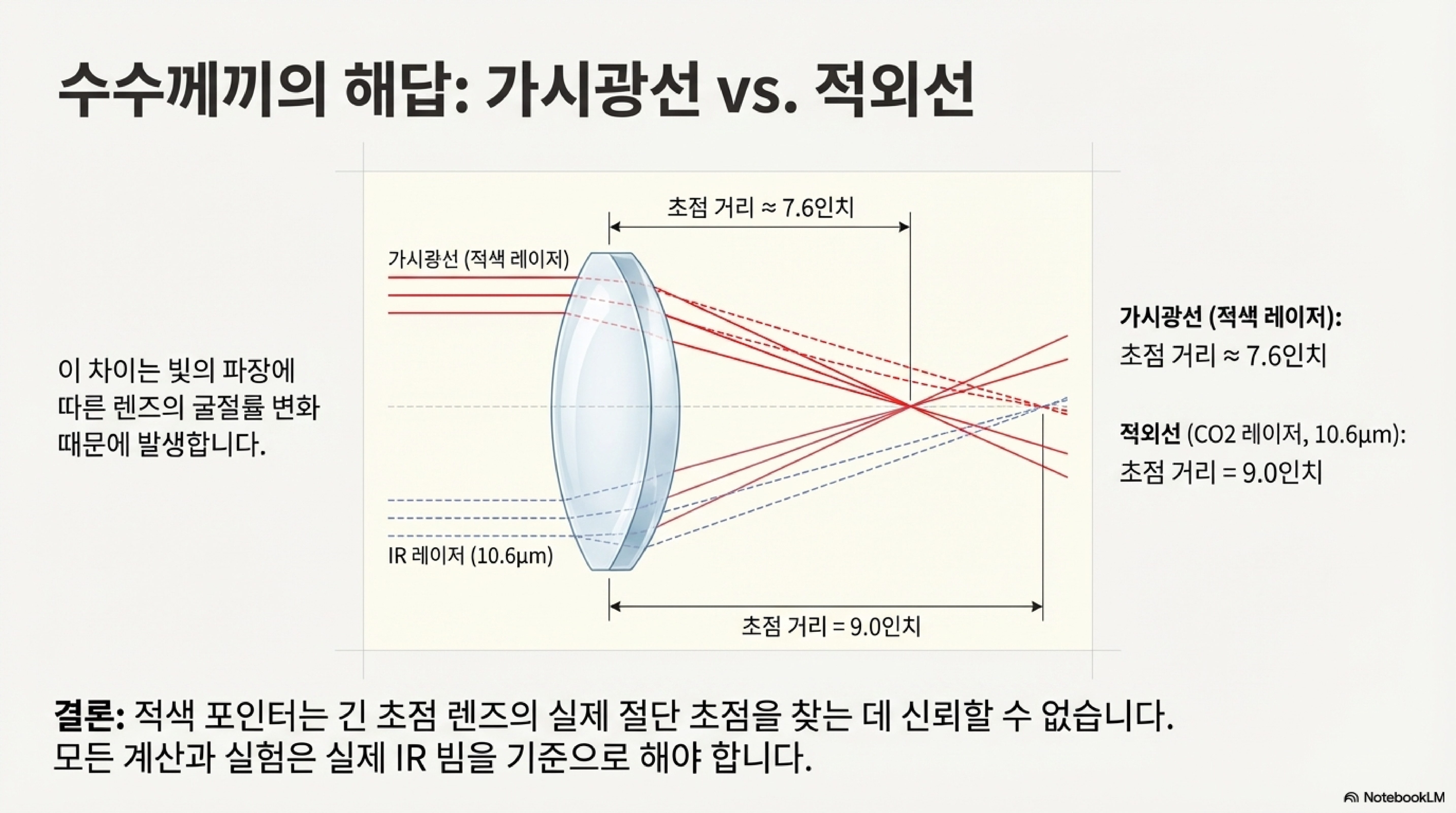 그렇다면 왜 실제 절단용 적외선(IR) 레이저의 초점은 9인치였을까요? 그 이유는 가시광선과 적외선이 렌즈를 통과할 때 굴절되는 정도가 다르기 때문입니다. 이 발견은 꽤 실망스러운 것이었습니다. 만약 그동안 빨간 점을 기준으로 초점을 맞추고 데이터를 수집해왔다면, 그 모든 노력이 실제 절단 작업에서는 아무 쓸모가 없었을 수도 있다는 의미이기 때문입니다.