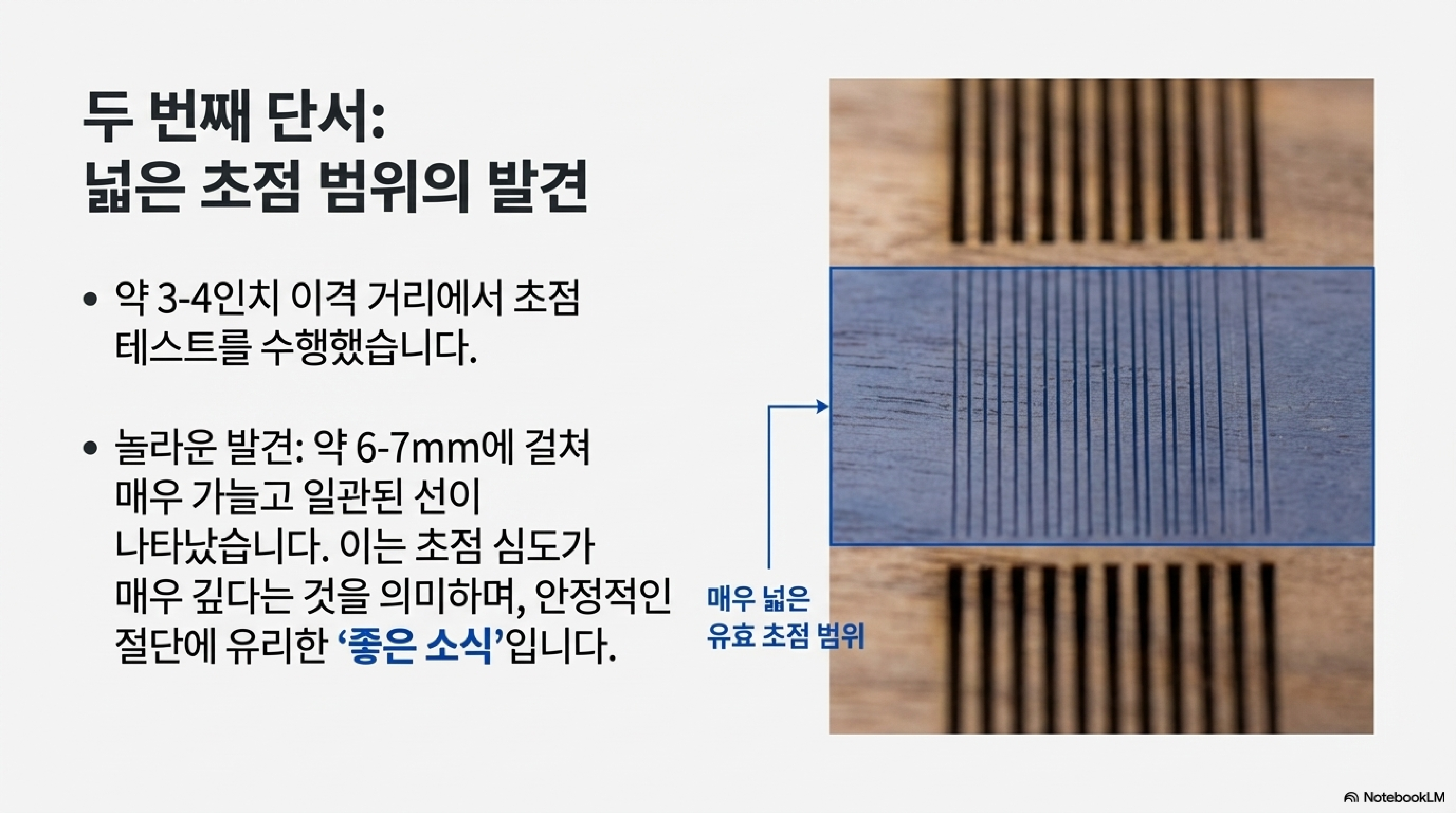 수많은 테스트 끝에 찾아낸 최적의 조합(7.5인치 + 4인치 렌즈를 적절한 간격으로 배치)은 단순히 절단 속도만 빠른 것이 아니었습니다. 이 '슈퍼 렌즈' 조합이 가진 또 다른 놀라운 장점이 발견되었습니다.