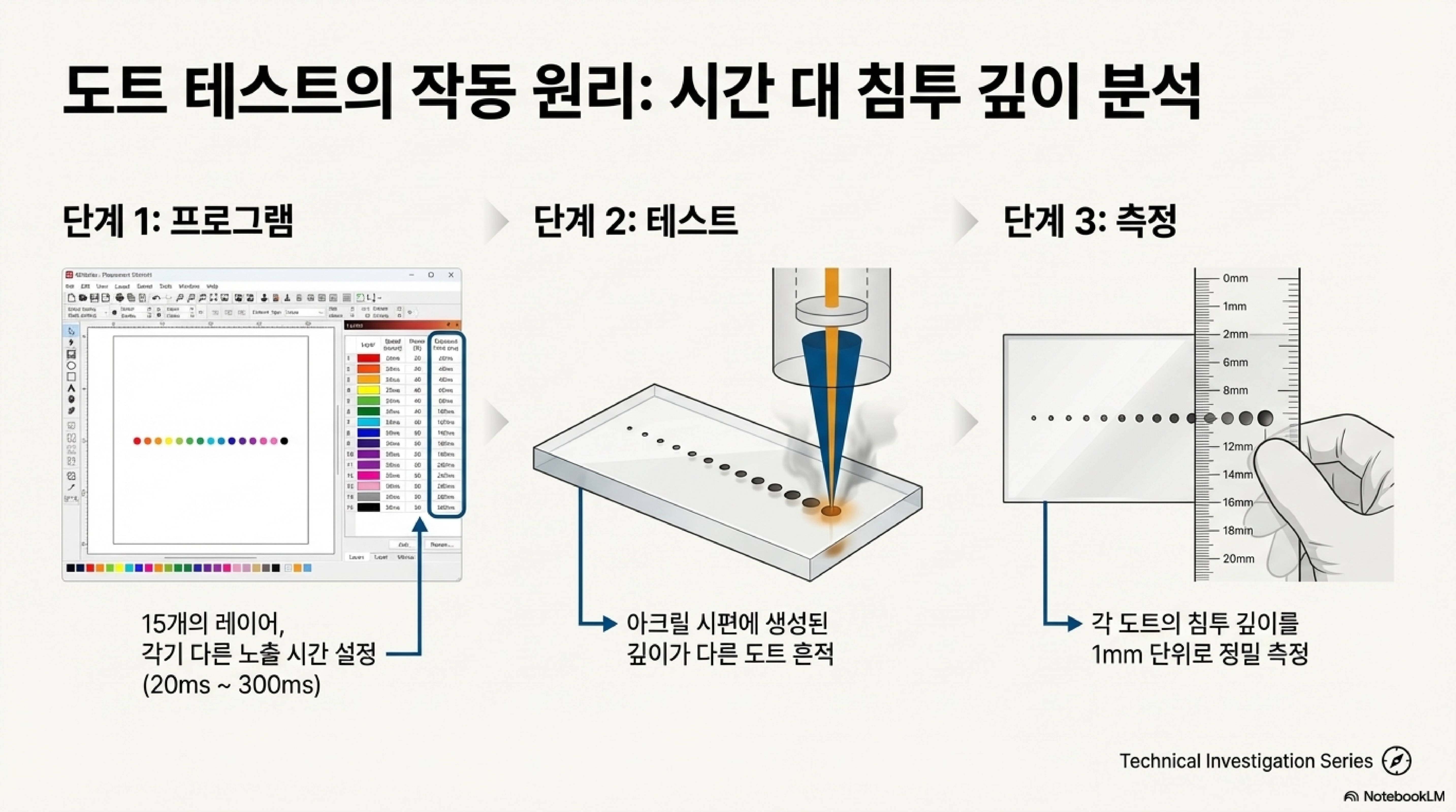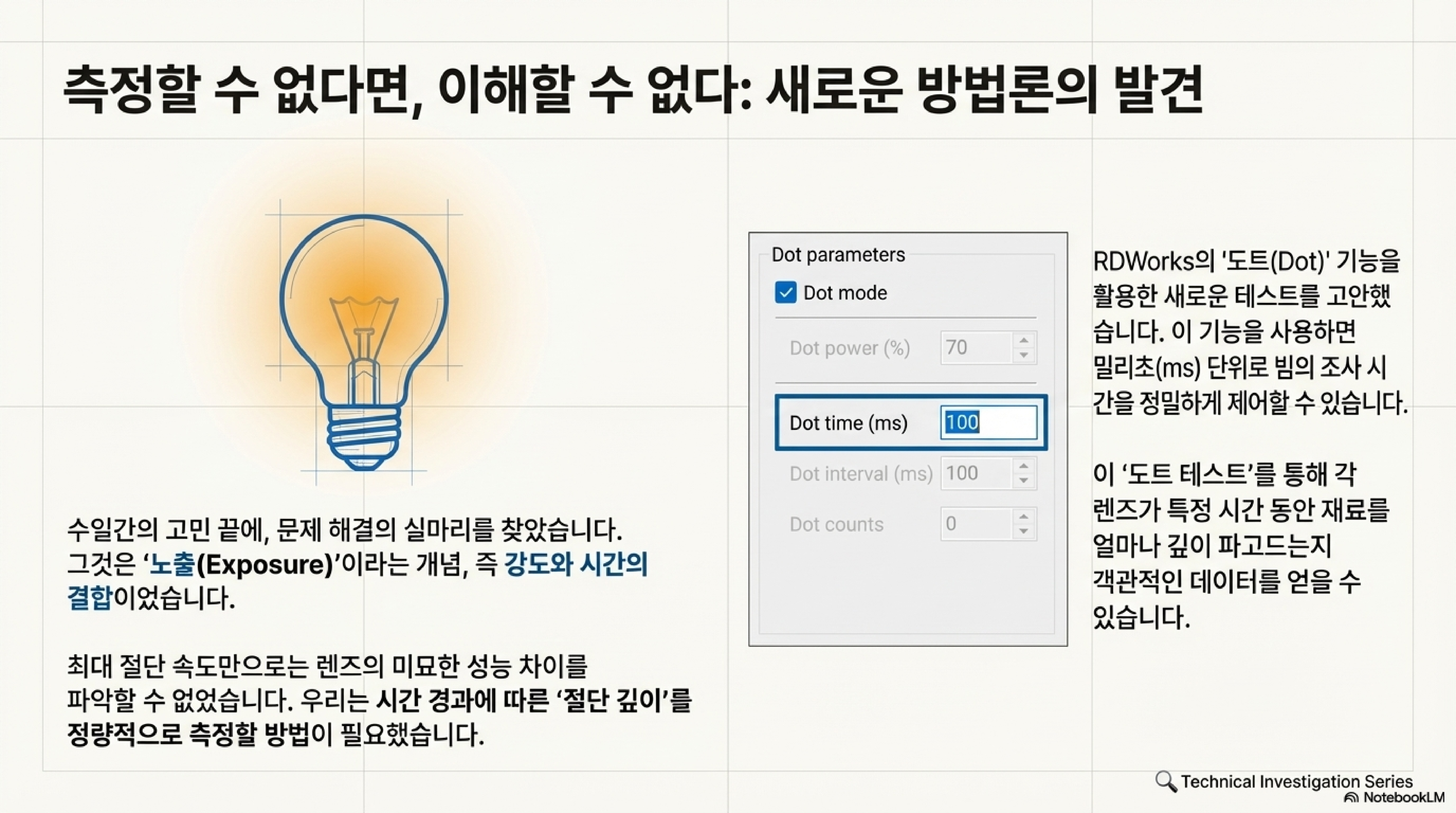 계속되는 혼란스러운 결과에 좌절한 끝에, 저는 '감'이 아닌 데이터로 렌즈를 평가할 객관적인 방법이 필요하다는 것을 깨달았습니다. 그래서 고안한 것이 바로 '도트 테스트(Dot Test)'입니다. 이 방법은 주관적인 '느낌'이나 오해의 소지가 있는 '라인 속도 테스트'를 대체하고, 특정 장비에서 각 렌즈의 고유한 성능 '지문(fingerprint)'을 데이터로 만들어내는 혁신적인 접근법입니다.