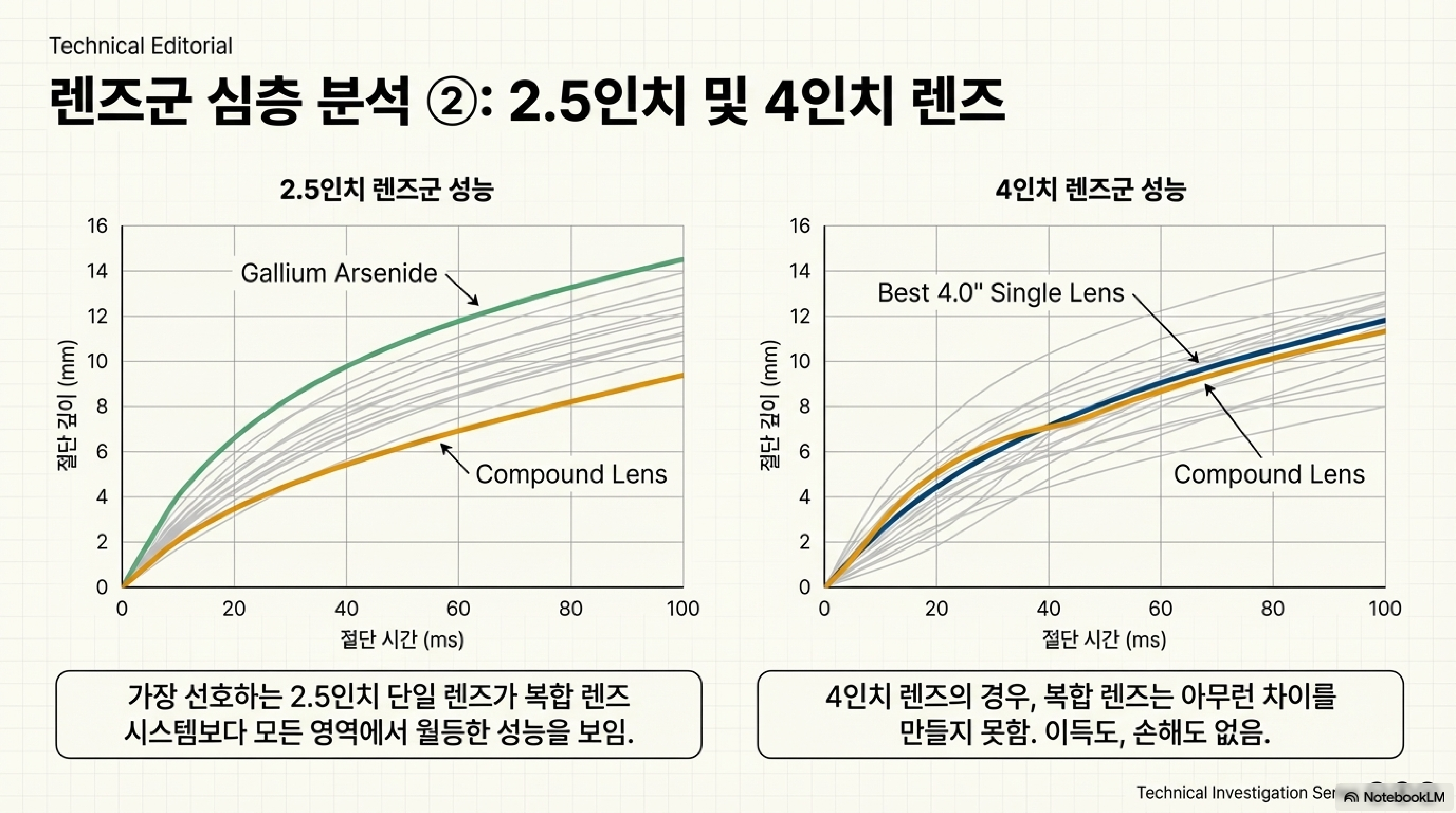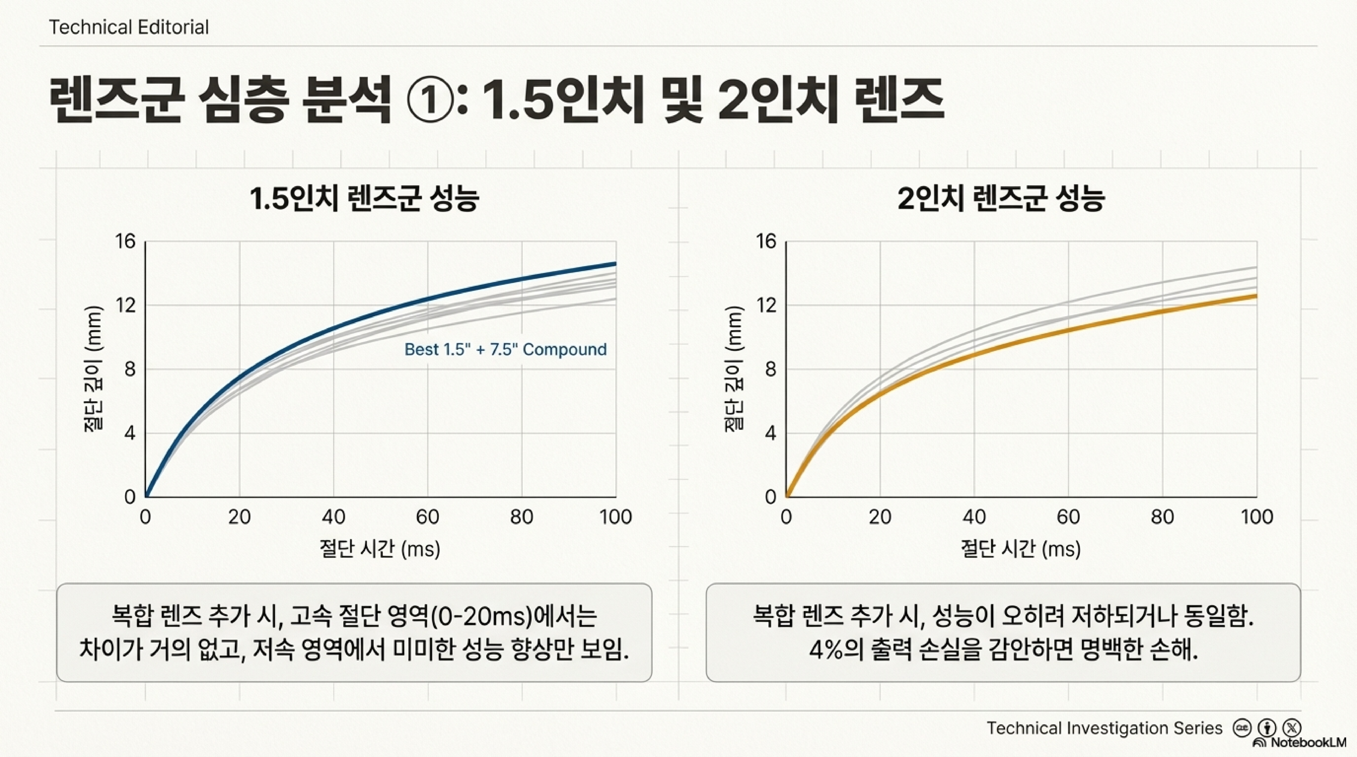 이론적으로는 완벽해 보였습니다. 하지만 광범위한 테스트 결과는 예상과는 완전히 달랐고, 솔직히 말해 충격적이었습니다. 1.5인치, 2인치, 2.5인치, 4인치 등 다양한 렌즈 조합에 보조 렌즈를 추가했지만, 절단 속도나 깊이에서 어떤 유의미한 이점도 발견되지 않았습니다. 오히려 렌즈가 추가될 때마다 약 4%의 출력 손실이 발생하여 성능이 저하되는 경우도 있었습니다. 결론적으로, 복합 렌즈를 통해 절단 속도를 향상시키려는 전략은 막다른 길이었습니다.
