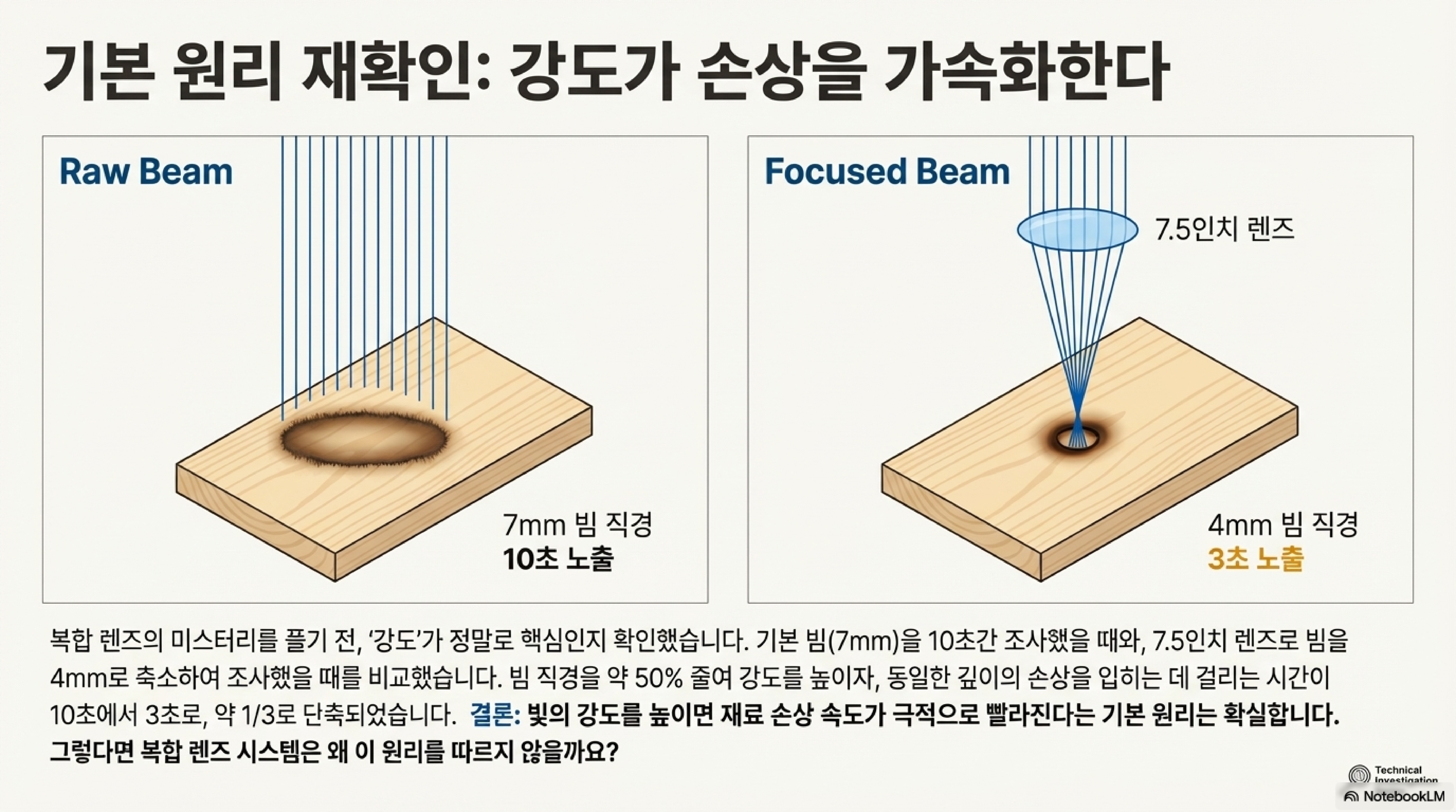 그렇다면 빔의 강도를 높일 방법은 없을까요? 한 가지 논리적인 가설은 복합 렌즈를 사용하는 것이었습니다. 그 발상은 간단했습니다. 돋보기(사전 초점 렌즈)로 햇빛을 모아 또 다른 더 강력한 돋보기(주 절단 렌즈)에 비추면 훨씬 더 강렬한 열점을 얻을 수 있다는 논리였습니다. 이 실험은 동일한 원리를 레이저 빔에 적용해 보려는 시도였습니다. 긴 초점 거리의 렌즈(예: 7.5인치)를 사용해 주 절단 렌즈에 도달하기 전에 빔을 미리 모아주면, 주 렌즈에 닿는 빔의 단면적(footprint)이 줄어들어 강도가 높아지고, 결과적으로 절단 속도가 빨라질 것이라는 가설이었습니다.