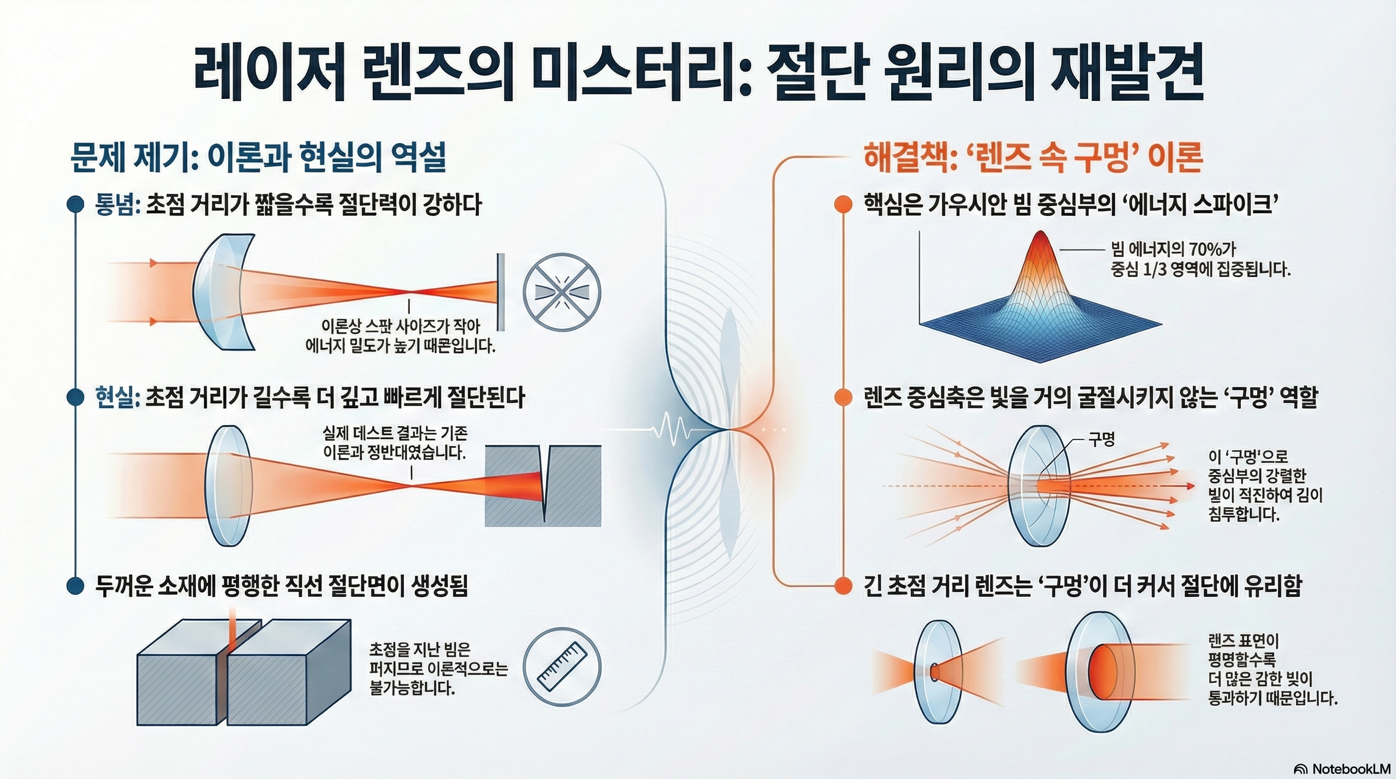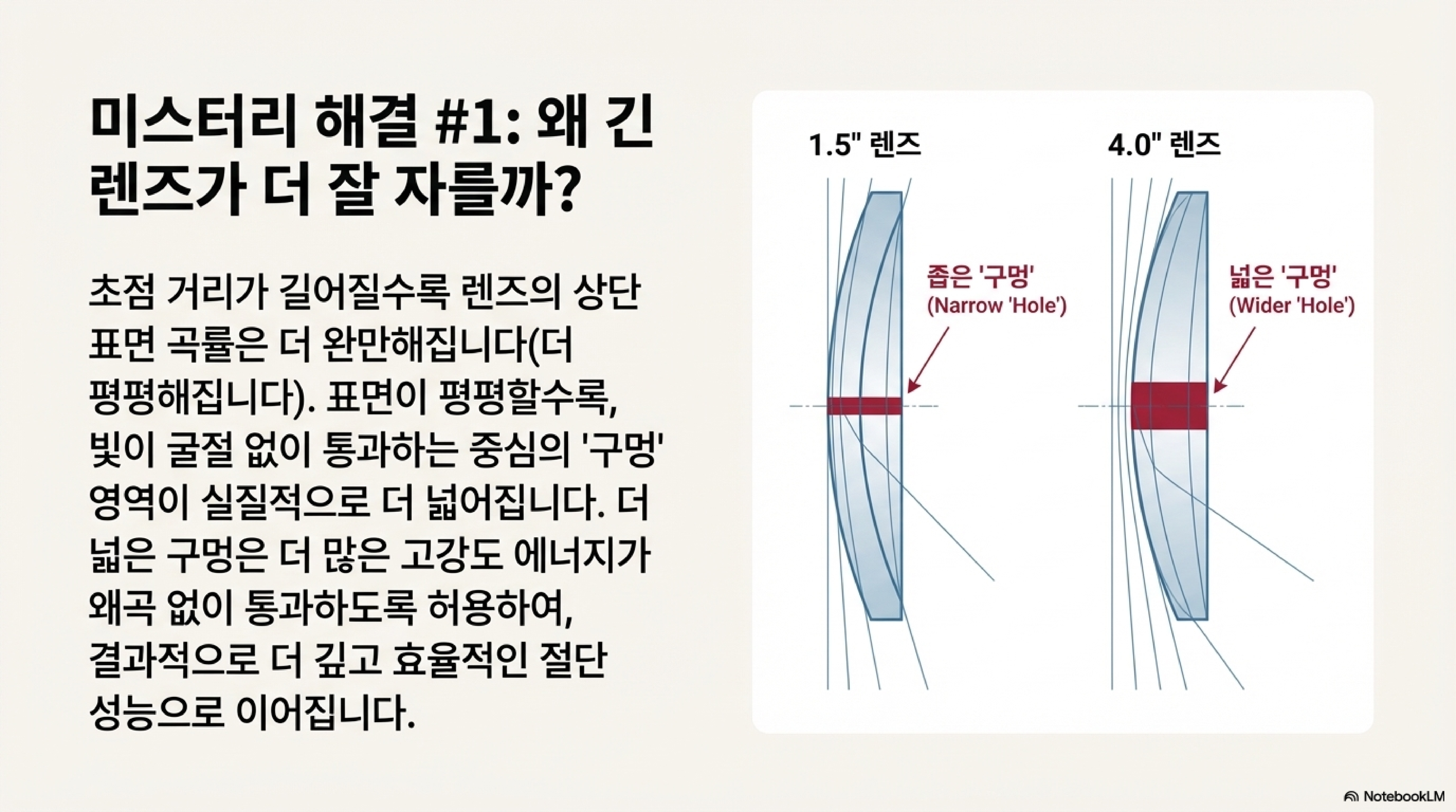 이 '구멍' 이론이 단지 추측이 아니라는 결정적인 증거는 렌즈의 재질과 모양에서 나타났습니다. 이 이론은 왜 초점 거리가 긴 렌즈가 커팅을 더 잘하는지에 대한 명쾌한 해답을 제시합니다.