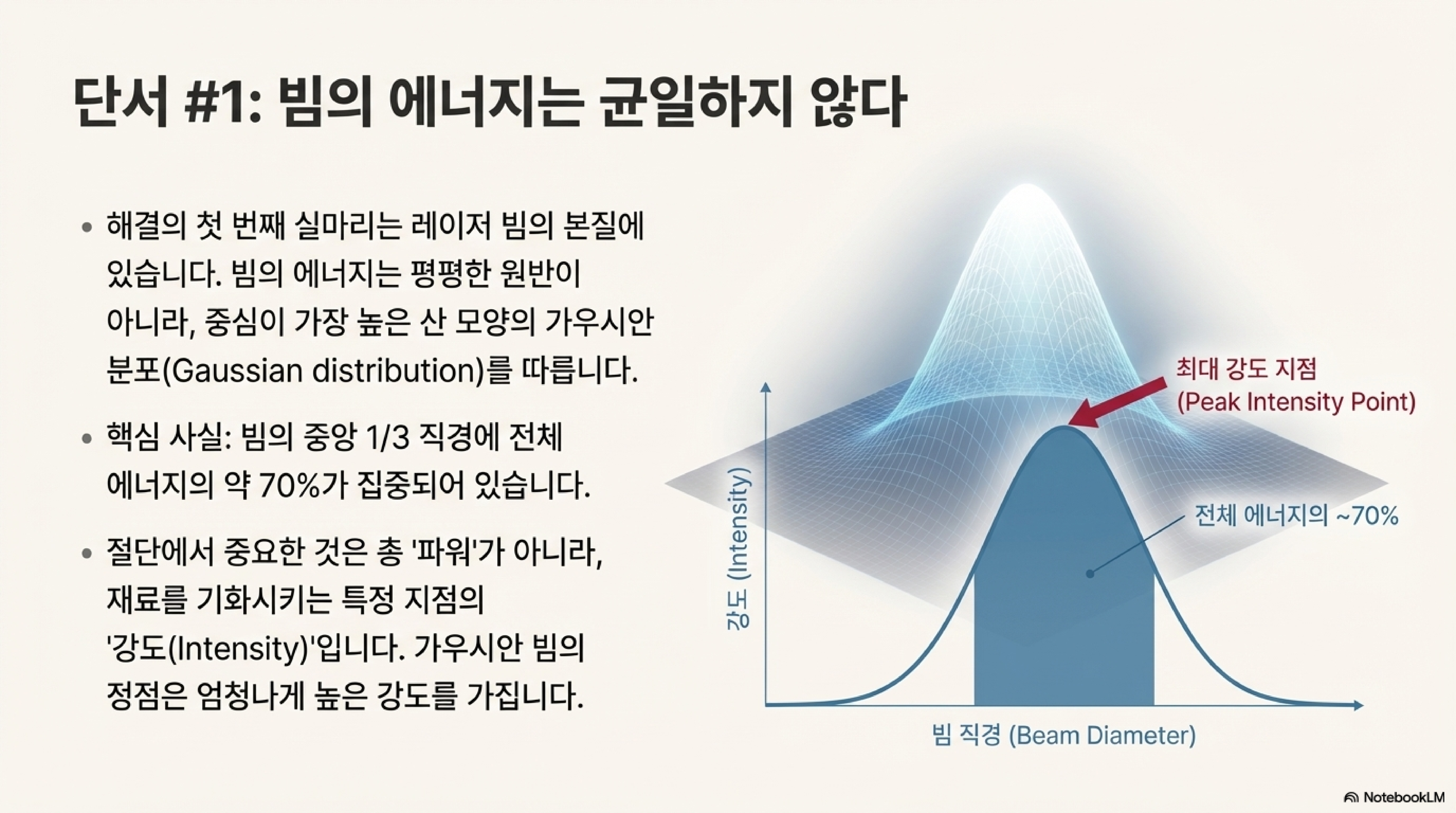 레이저 빔은 균일한 빛 덩어리가 아닙니다. 실제로는 중심부로 갈수록 에너지가 급격히 강해지는 '가우시안(Gaussian)' 분포를 가집니다. 예를 들어, 일반적인 6mm 직경의 빔에서 전체 에너지의 약 70%가 중심부 2mm 영역에 놀라울 정도로 집중되어 있습니다.