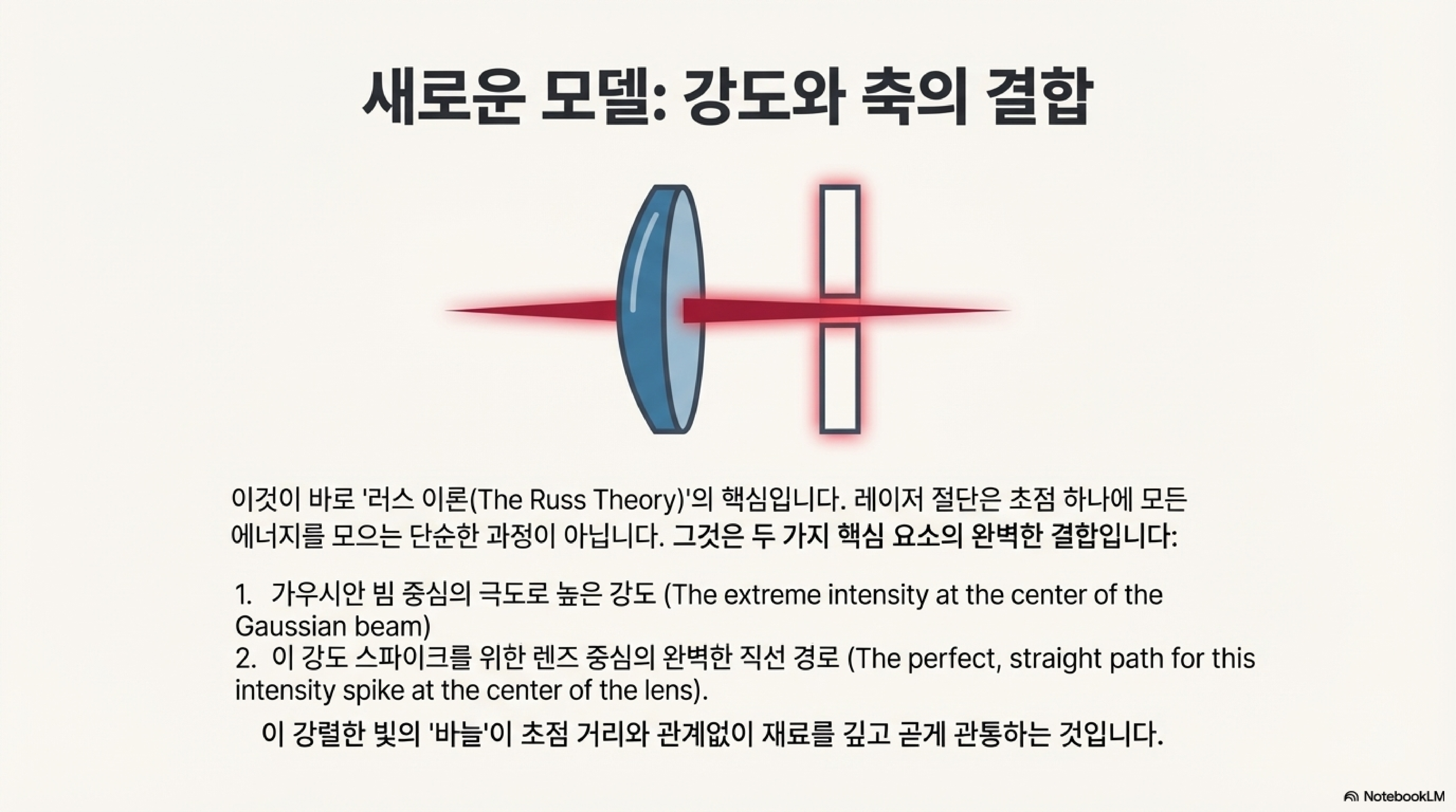 지난 2년간의 끈질긴 탐구 끝에 Russ가 찾아낸 비밀은 바로 이것입니다. 레이저 커팅의 핵심은 레이저 빔의 가장 강력한 '중심 광도'와 렌즈의 불완전함이 만들어낸 '중심축 구멍'이 만나는 '천생연분(a marriage made in heaven)'에 있었습니다.