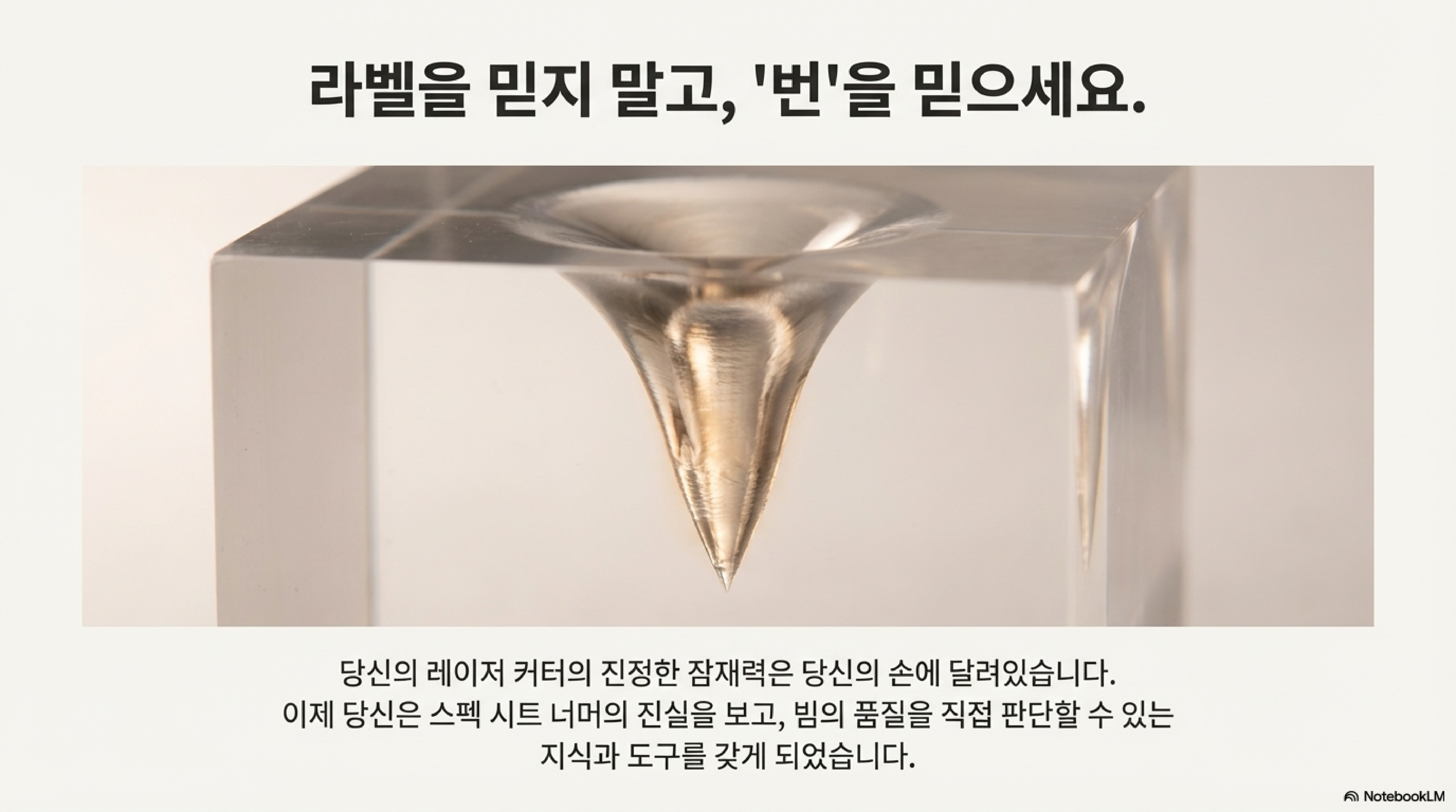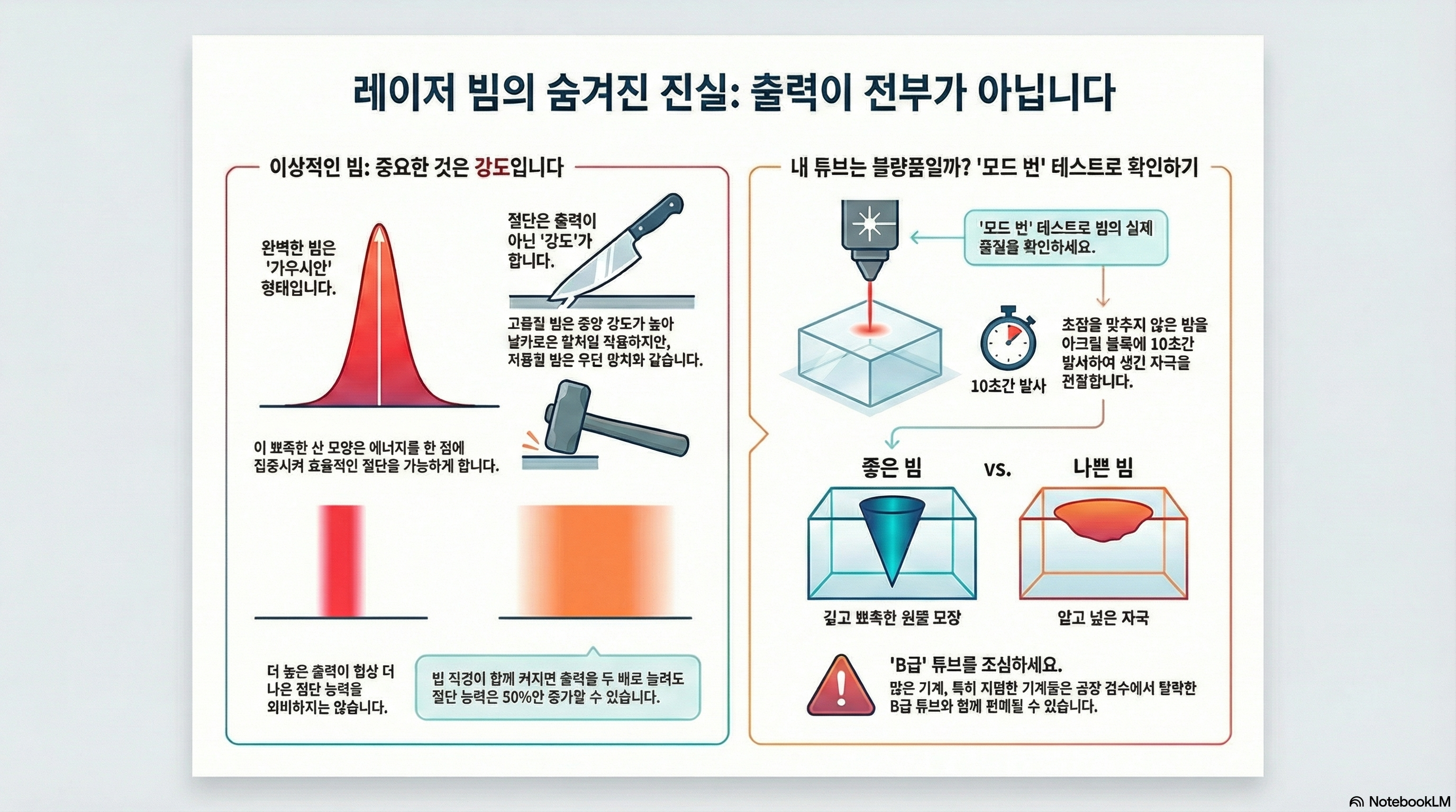 결론적으로, 레이저 커터의 성능을 제대로 이해하려면 판매자가 광고하는 단순한 출력 수치를 넘어, 레이저 빔의 본질적인 특성—그 모양, 강도, 그리고 발산—을 깊이 있게 파악하는 것이 훨씬 더 중요합니다. 겉으로 보이는 사양에 현혹되지 않고, 빔의 실제 품질을 평가할 수 있는 능력을 기르는 것이야말로 당신의 기계를 100% 활용하는 첫걸음입니다.