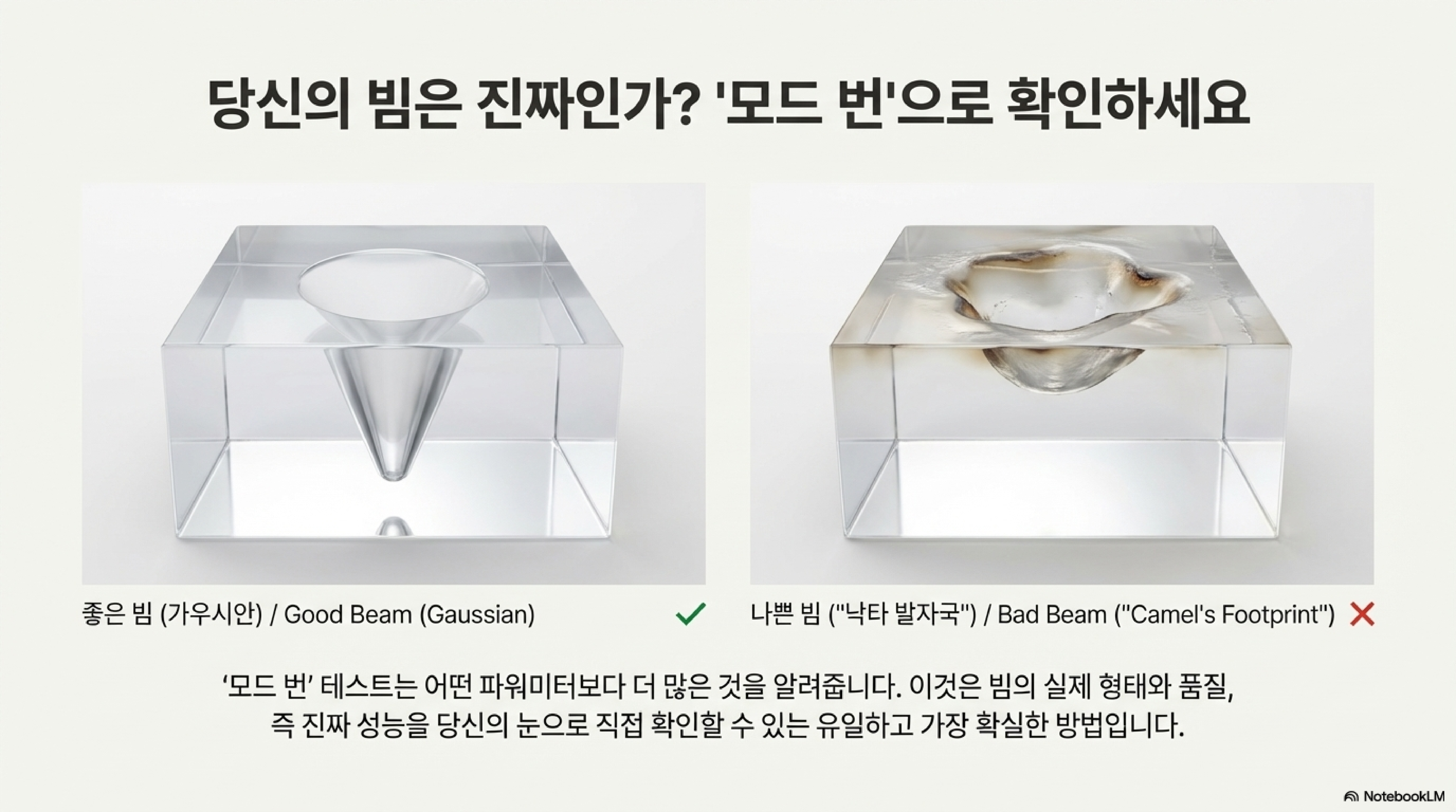 모드 번 테스트는 초점을 맞추지 않은 순수한 레이저 빔을 아크릴 블록에 10초간 쏘아 그을린 형태를 확인하는 것입니다. 이 그을린 자국의 모양은 빔의 에너지 분포, 즉 강도를 그대로 보여줍니다. 이상적인 빔은 날카로운 산봉우리처럼 보이는 "가우시안(Gaussian)" 형태로, 모든 에너지가 중앙에 완벽하게 집중되어 있음을 의미합니다.