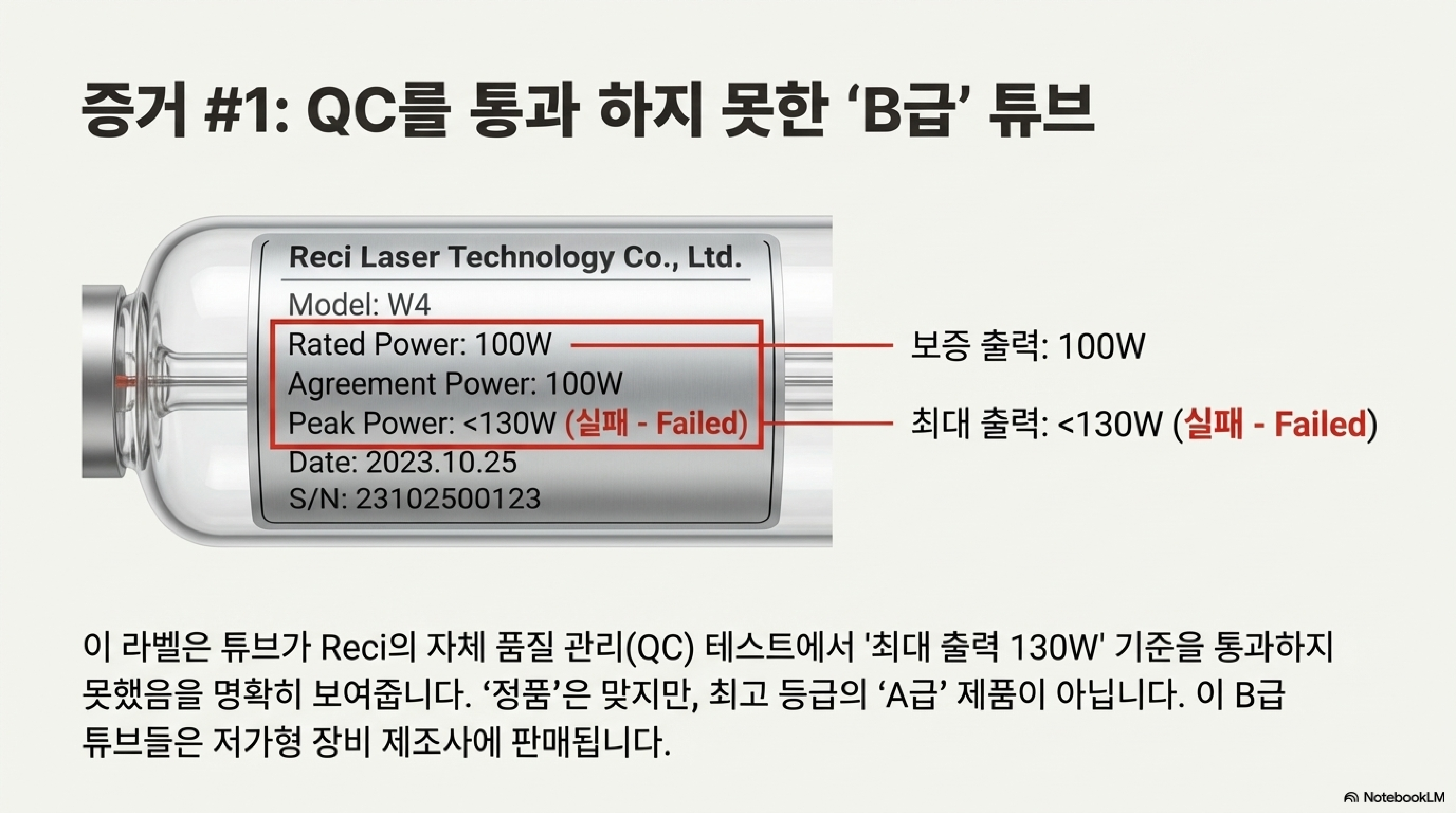 이것이 어떻게 가능할까요? 예를 들어, W-4 튜브가 사양서의 최대 출력인 130W에 도달하지 못하면, Reci는 이 튜브를 보증 대상에서 제외합니다. 하지만 폐기하는 대신, 이 B급 튜브를 기계 조립 업체에 판매합니다. 그러면 조립 업체들은 "Reci 튜브 장착!"이라고 자랑스럽게 광고하면서도, 그것이 제조업체의 기준에 미달한 B급 제품이라는 사실은 결코 밝히지 않습니다.