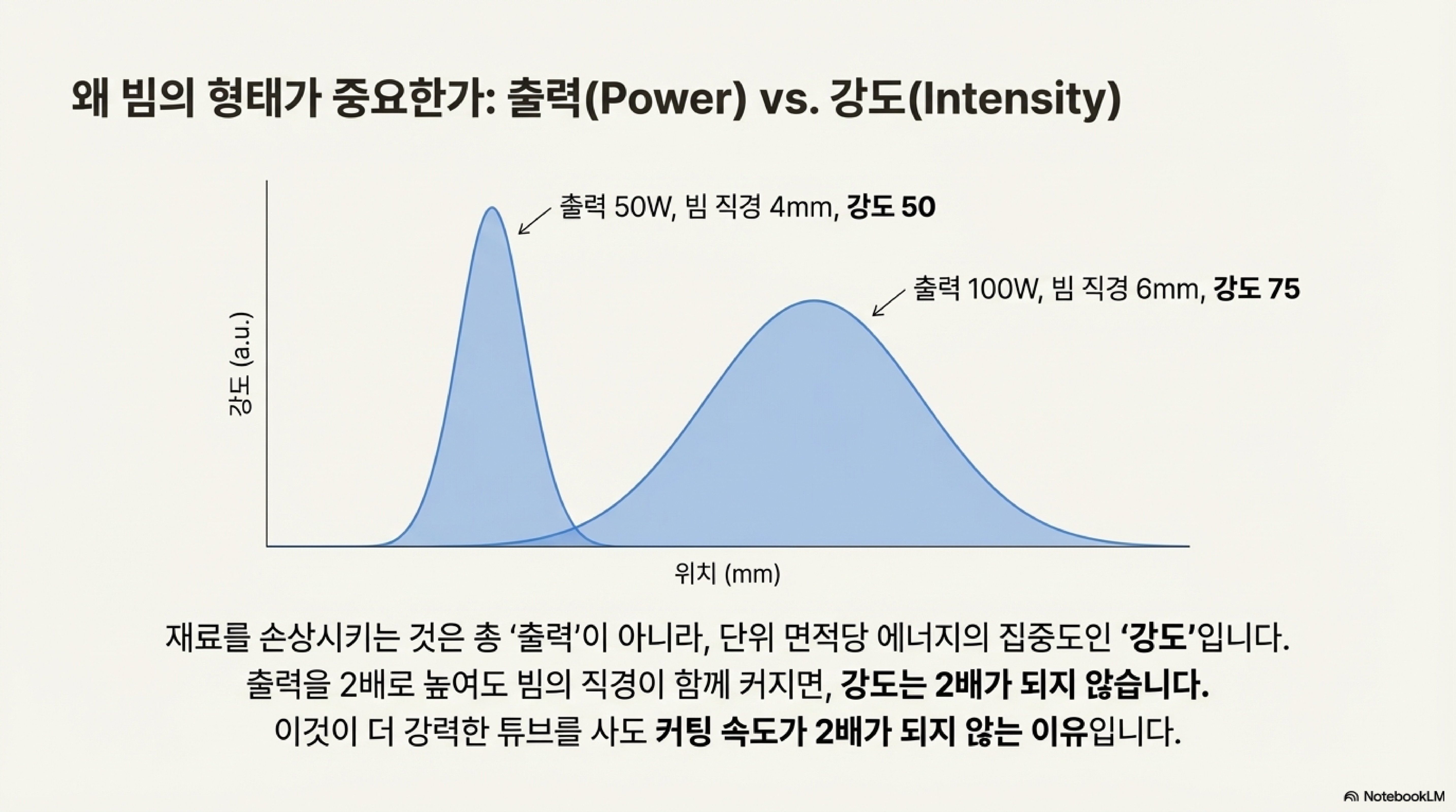 여기서 중요한 함정이 있습니다. 일반적으로 레이저 튜브의 출력이 높아질수록 빔의 직경도 함께 커지는 경향이 있습니다. 이것이 바로 50W 튜브를 100W 튜브로 바꾼다고 해서 절단 속도가 두 배가 되지 않는 이유입니다. 출력을 두 배로 늘려도 빔 직경이 함께 커진다면, 단위 면적당 에너지의 집중도인 '강도'는 고작 50% 증가에 그칠 수 있습니다. 결국 더 비싼 돈을 주고 더 높은 출력의 튜브를 샀지만, 실제 절단 능력의 향상은 기대에 훨씬 못 미치게 되는 것입니다.