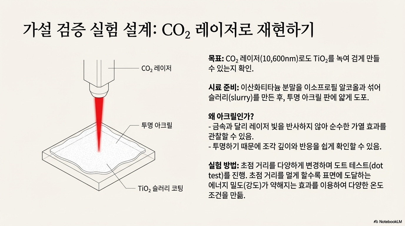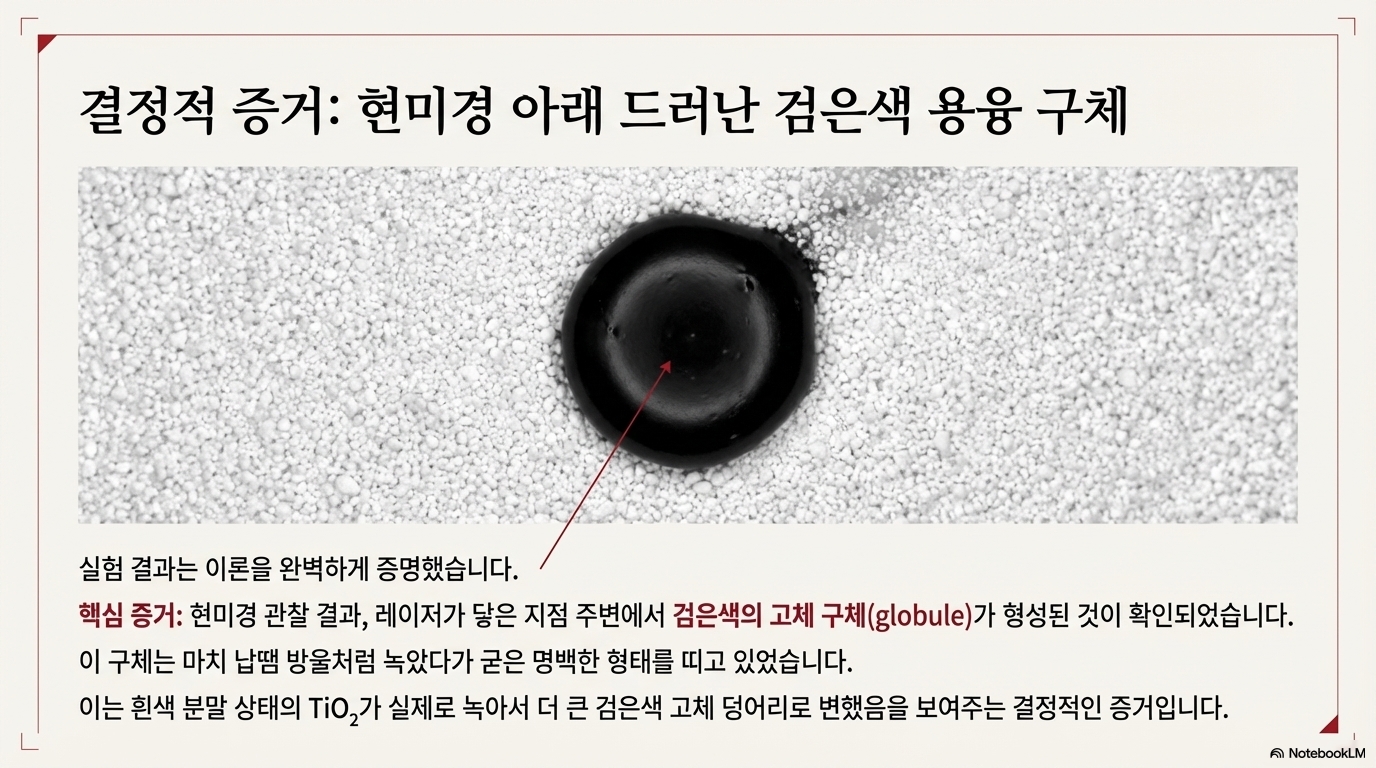 이 가설을 증명하기 위해, 저는 노턴 프로세스에 주로 사용되는 블루 다이오드 레이저가 아닌 CO2 레이저를 사용하여 실험을 진행했습니다. 그 결과, 이산화 티타늄 가루를 녹여 검고 단단한 구슬 형태의 물질을 만드는 데 성공했습니다. 이는 이 현상이 특정 파장의 빛이 아닌, 물질을 녹일 수 있을 만큼의 충분한 온도를 달성하는 것이 핵심임을 증명하는 것입니다.