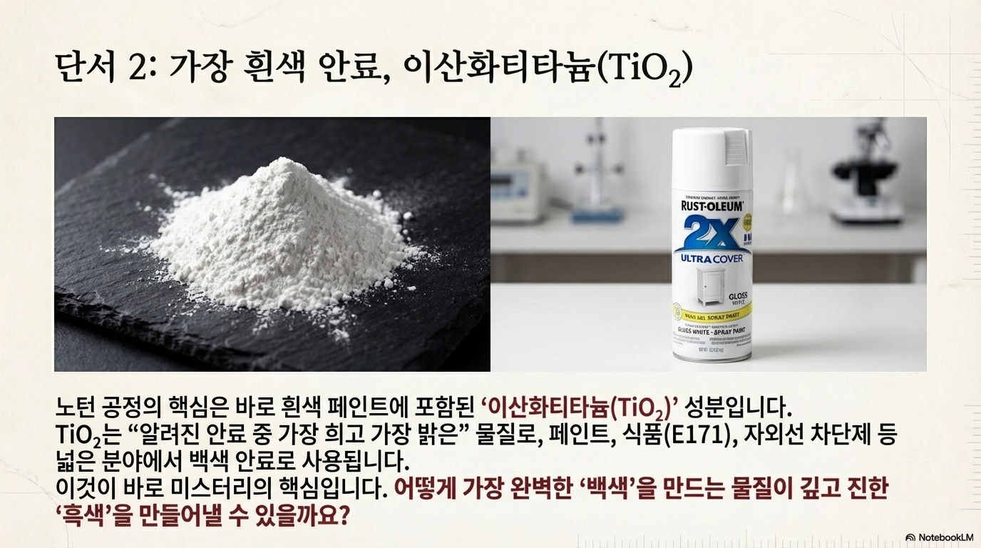 여기서 또 하나의 역설이 등장합니다. 이산화 티타늄은 현존하는 안료 중 가장 희고 밝은 물질로 유명하기 때문입니다. 페인트, 자외선 차단제, 플라스틱은 물론 식품 첨가물(E171)로도 사용될 만큼 '완벽한 흰색'을 만드는 데 쓰이는 대표적인 재료입니다. 무언가를 하얗게 만드는 데 쓰이는 이 하얀 가루가 검은색을 만드는 열쇠라는 사실은 미스터리를 더욱 깊게 만들었습니다.