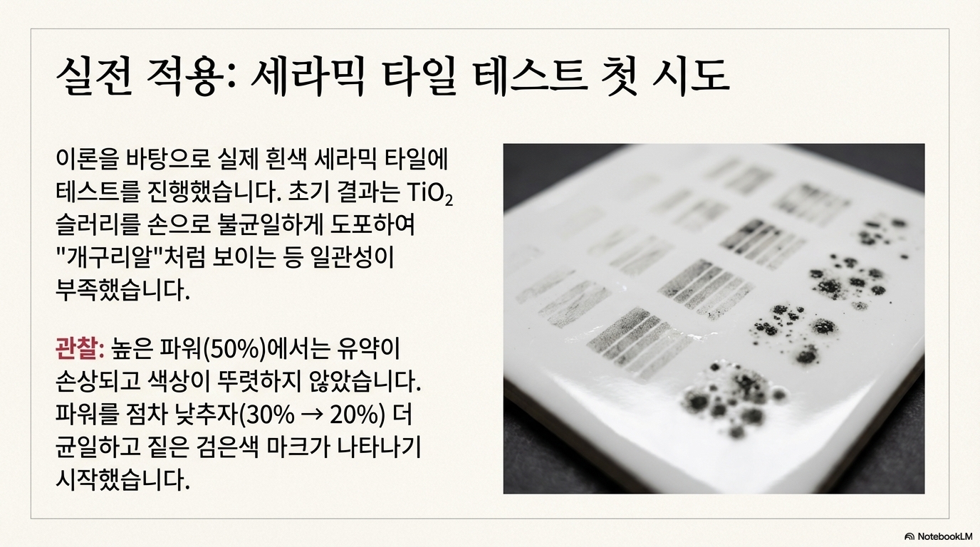 저의 탐구는 흰색 타일의 유약층에 영구적인 검은색을 녹여 붙이려는 시도에서 시작되었습니다. 가장 논리적인 접근법은 검은색 안료를 사용하는 것이었습니다. 저는 흑연(카본 블랙) 분말부터 도자기 유약에 검은색을 내는 데 쓰이는 이산화 망간(manganese dioxide)까지, 여러 검은색 재료들을 시도해 보았습니다. 하지만 결과는 한결같이 '완벽한 실패'였습니다. 어떤 검은색 분말도 타일의 유리질 유약층에 녹아 붙지 않았습니다.