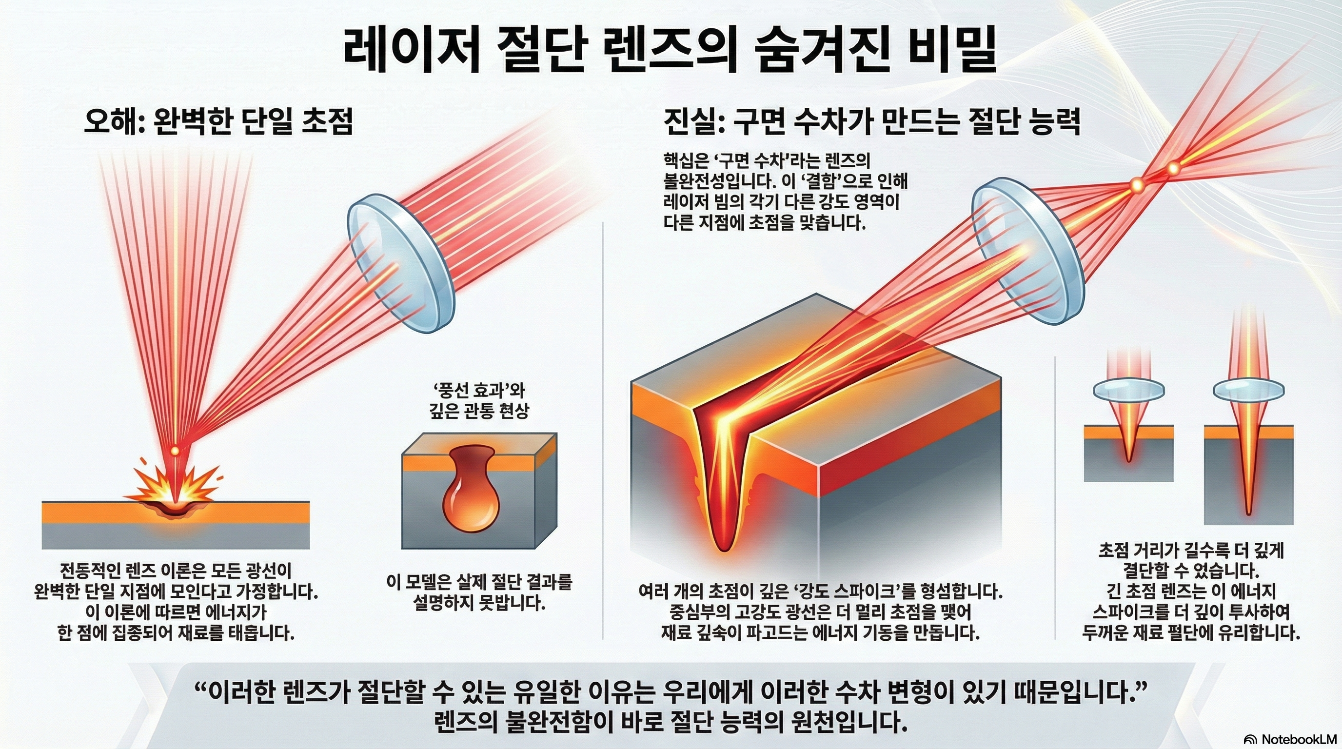 광학에서 '구면 수차(spherical aberration)'는 일반적으로 렌즈의 결함으로 간주됩니다. 렌즈의 구면 형태 때문에 빛이 완벽하게 한 점에 모이지 못하고 흩어지는 현상을 말하죠. 하지만 놀랍게도, 이 '약점'이야말로 렌즈가 효과적으로 재료를 절단할 수 있게 만드는 핵심적인 속성입니다.