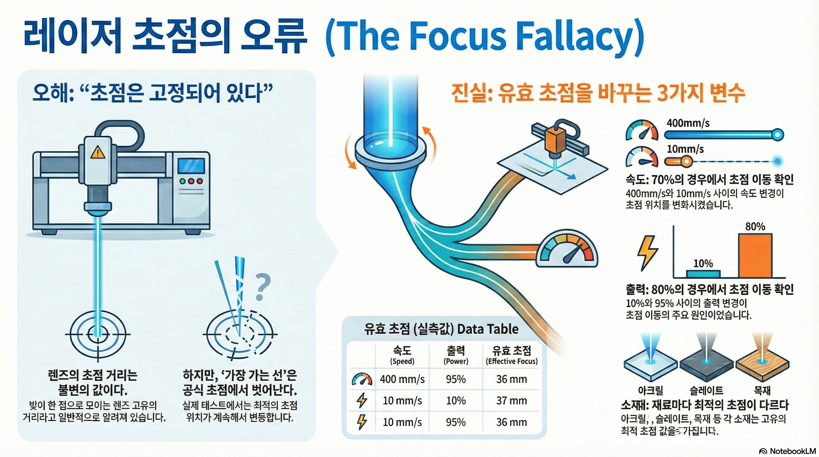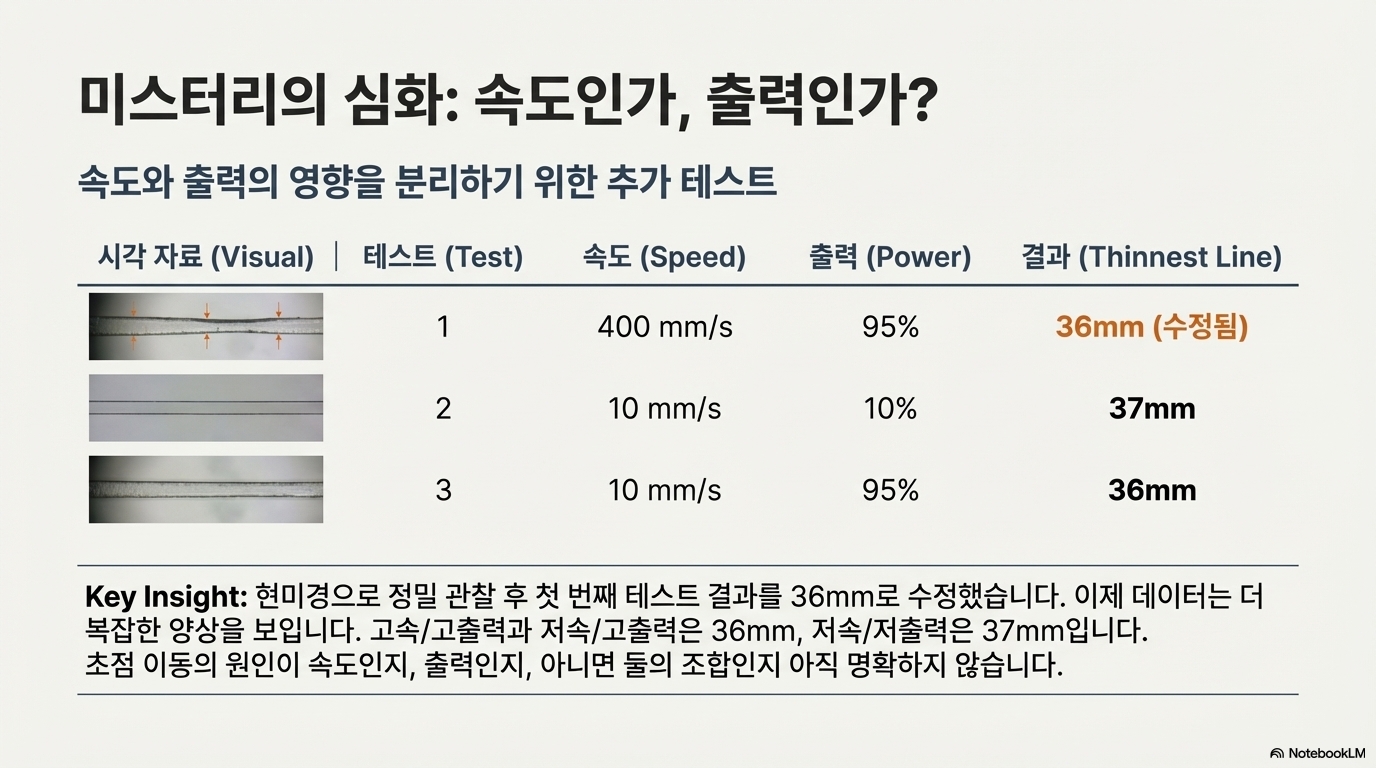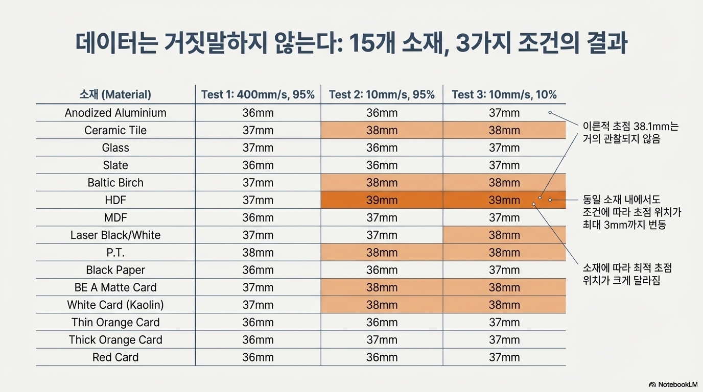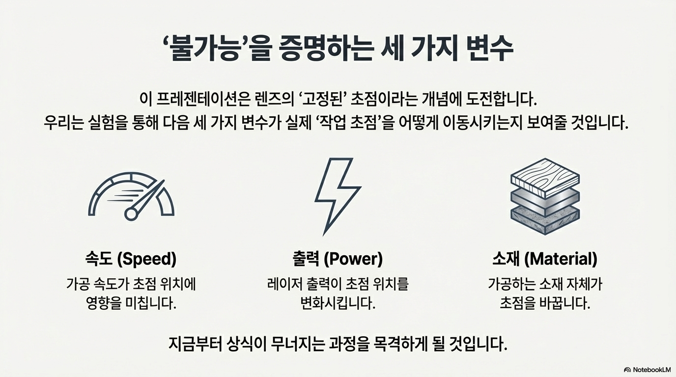 실험 결과, 유효 초점 거리를 이동시키는 세 가지 핵심 변수가 밝혀졌습니다. 바로 속도, 출력, 그리고 가공하는 소재 자체입니다.