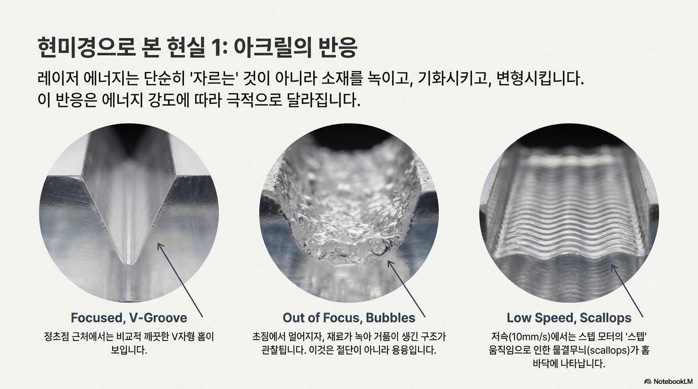 - 아크릴(Acrylic): 레이저를 맞은 아크릴은 녹았다가 다시 굳으면서 입자 구조와 기포를 드러냅니다. 특히 매우 느린 속도에서는 스텝 모터의 개별적인 움직임으로 인해 생긴 '가리비 모양(scallops)'의 무늬까지 관찰할 수 있었습니다.
